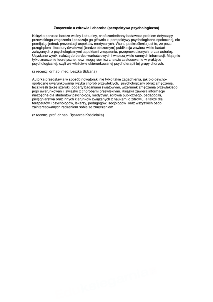 Zmęczenie a zdrowie i choroba (perspektywa psychologiczna) KsiąŜka porusza bardzo waŜny i aktualny, choć zaniedbany badawczo problem dotyczący przewlekłego zmęczenia i pokazuje go głównie z perspektywy psychologiczno-społecznej, nie pomijając jednak prezentacji aspektów medycznych. Warte podkreślenia jest to, Ŝe poza przeglądem literatury światowej (bardzo obszernym) publikacja zawiera wiele badań związanych z psychologicznymi aspektami zmęczenia, przeprowadzonych przez autorkę. Uzyskane wyniki naleŜą do bardzo wartościowych i wnoszą wiele cennych informacji. Mają nie tylko znaczenie teoretyczne, lecz mogą równieŜ znaleźć zastosowanie w praktyce psychologicznej, czyli we właściwie ukierunkowanej psychoterapii tej grupy chorych. (z recenzji dr hab. med. Leszka Bidzana) Autorka przedstawia w sposób nowatorski nie tylko takie zagadnienia, jak bio-psychospołeczne uwarunkowania ryzyka chorób przewlekłych, psychologiczny obraz zmęczenia, lecz kreśli takŜe szeroki, poparty badaniami światowymi, wizerunek zmęczenia przewlekłego, jego uwarunkowań i związku z chorobami przewlekłymi. KsiąŜka zawiera informacje niezbędne dla studentów psychologii, medycyny, zdrowia publicznego, pedagogiki, pielęgniarstwa oraz innych kierunków związanych z naukami o zdrowiu, a takŜe dla terapeutów i psychologów, lekarzy, pedagogów, socjologów oraz wszystkich osób zainteresowanych radzeniem sobie ze zmęczeniem. (z recenzji prof. dr hab. Ryszarda Kościelaka)