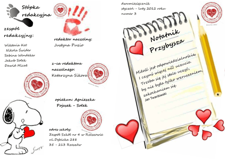 dwumiesięcznik Stopka styczeń - luty 2012 roku numer 3 redakcyjna zespół redakcyjny: Wiktoria Kot ik n t a Not za s y yb z r P redaktor naczelny: Justyna Puzio Nikola Świder Sabina Wendeker Jakub Sołek Dawid Micał z-ca redaktora naczelnego: Katarzyna Sikora opiekun: Agnieszka Pojasek - Sołek adres szkoły: Zespół Szkół nr 4 w Rzeszowie ul..Dębicka 288 35 - 213 Rzeszów . cią ś o ialn z d e e. owi uci p z c d o iż u jest n ć, ć j ś , o ce czy ł ę i u i iem M e w l n ś e a t z ym rus jej s z ę I cz w i s lko ba e y t z a Tr był ię. e s i n m by nie a h oc ski zak rdow Jan Twa spis treści: Święta Marcowe 3 kalendarium 4-5 kartki z pamiętnika 6 Wielka Orkiestra Świątecznej Pomocy 7 Dzień Kobiet 8 „Kocham Cię” w różnych językach 9 Tydzień Pełnego Uśmiechu 10-11 Nowości 12 „Stary Doktor” Janusz Kofta 13 Rok Korczaka 14 „Miłość od pierwszego wejrzenia” Wisława Szymborska 16 o Walentynkach 17 humor 18 och, mój Walenty! 19 krzyżówka 20 stópka 3 Marca Międzynarodowy Dzień Pisarzy 8 Marca Dzień Kobiet tki z kal end arz a 21 Marca Wiosna 2012 - pierwszy dzień WitamyI W pierwszym numerze Notatnika ogłosiliśmy konkurs na wizerunek Przybysza, który gościłby na łamach gazetki, komentował rzeczywistość szkolną, dawał „dobre rady”. Mamy już pierwsze prace, ale czekamy na więcej! Obecnie nasze strony ociepla sympatyczny Snoopy. Może już wkrótce dzięki Wam będziemy mieć swojego pupila. Zapraszamy! Prace prosimy przekazywać Waszym kolegom redaktorom, lub opiekunowi gazetki. Wszystkim, którzy tworzą szkołę, budują codzienną, niezwykle ciepłą atmosferę, cały zespół redakcyjny życzy wielu radosnych chwil spędzonych w gronie kochających, osób. Żeby nigdy nie zabrakło Wam wiary w ludzi, nadziei w trudnych chwilach i największego ze skarbów miłości i wzajemnego zaufania. 2 kar Agnieszka Pojasek - Sołek z zespołem redakcyjnym 25 Marca Zmiana Czasu z Zimowego na Letni 27 Marca Międzynarodowy Dzień Teatru Święta Kwietniowe 1 Kwietnia Prima aprilis Międzynarodowy Dzień Książki dla Dzieci 8 Kwietnia Wielkanoc 9 Kwietnia Śmingus-Dyngus 12 Kwietnia Dzień czekolady Książka - nierozdzielny towarzysz, przyjaciel bez interesu, domownik bez naprzykrzenia (Ignacy Krasicki) 13 Kwietnia Światowy Dzień Pamięci Ofiar Katynia 22 Kwietnia Dzień Ziemi przygotowała Nikola Świder 3 26 styc a kartki z nik t ę i m pa 2012 a i n z yc r. zki jewód o W ę i był s bie od ę D j e e. w Now intoni m d a ci w B j Dzie KKF e i n r u T towy T r o p S Klub łem owski p. Paw Uczni m e n pieku raz z o o w T N naszeg z SPRI i m a dnik i zawo m e i k ju. z Iwas turnie m y t w dział brał u klubu 21 st ce 10, : s y j e i m ś i m l 1, Zaję łczyk i - miejsce 1 o i n A sk Eryk migiel miejsce 12 z S ł e Paw tych y M j e Maci 4 wszystk znia ie przed szk z rodzic ami szal olaki ały na balu ka Nie zabr rnawałowym. ak konkurs ło ów, zaba w i ciekaw y również ch przebrań w rodziców śród . Znaczenie słowa karnawał tłumaczono na wiele sposobów. Uważano, że pochodzi od carne avaler - "połykać mięso", albo od carne levamen - "z mięsa się oczyszczać" lub od carne vale "mięso żegnaj". Znaleziono też polskie pochodzenie słowa, mianowicie od "nawału kar", które przyniesie post. Jakiekolwiek jest pochodzenie słowa karnawał, początki samej tradycji świętowania wywodzą się ze starożytnej Grecji. . ia 2012r 26 styczn nach w godzi niowych popołud 3b SP ie klasy w o i n z c u awcą z wychow ulec szką Mik p. Agnie ami i rodzic zowali zorgani y uroczyst a. w klasie i Dziadk i c b a B Dzień ały rzygotow p i c e i z e D stawieni d e z r p e piękn a”, królewn a c ą i p Ś pt. „ , piosenki e wiersze, wykonan e i n z c ę własnor . pominki u i i k r u la 23 stycznia śpiewem, tańcem i pięknym przedsta wieniem przedszkolaki uczc iły Kochane Babcie i D ziadków. Dzień Babci i Dziadka W Polsce obchodzone 21 stycznia, w tym samym dniu w Bułgarii I Brazylii, a w Hiszpanii - 26 lipca. We Francji jest to święto ruchome i obchodzone jest w pierwszą niedzielę marca. Święto Dzień Babci obchodzone jest w Polsce od 1964 roku. 5 Dzień kobiet istniał już w starożytnym Rzymie, świętowały go gospodynie domowe. Tego dnia zamężne kobiety otrzymywały od swoich mężów prezenty i podarki, obdarzane były miłością i uwagą. Niewolnice również otrzymywały prezenty od swoich mężów, a panie domu pozwalały tego dnia odpoczywać swoim niewolnicom. Rzymianki przyodziane w swoje najlepsze ubrania, z aromatycznymi wieńcami na głowach, przychodziły do świątyni bogini Westy strażniczki ogniska domowego. Gramy z Pompą! 6 W tym roku po raz XX odbył się wielki finał świątecznej orkiestry. Impreza była również w Rzeszowie. Została otwarta przez prezydenta Rzeszowa Tadeusz Ferenca. Gwiazdą wieczoru był Stachursky. Jeśli chodzi o występy muzyczne wystąpił też zespół Ratatam i Neuron. Podczas imprezy panowała miła i ciepła atmosfera wszyscy dobrze się bawili. W mieście było 400 wolontariuszy. Puszczaliśmy „Światełko do nieba” w tym czasie zostały puszczone fajerwerki i pod sceną zapalono duże serca w tym samym czasie był występ teatru WOSKRESIENNIE. Po puszczeniu światełka odbyła się licytacja licytowano: złote serduszko, rękawice bokserskie Krzysztofa Diablo Włodarczyka z jego autografem i breloczka z Maćkiem Kuciapą. Na breloczek składało się kilka osób jedna osoba dała 200zł, a miał dać 180zł, ale okazało się na scenie, że oni nie wydają reszty i reszta osób dała po 5 zł. Podczas licytacji było śmiesznie szczególnie z tym breloczkiem. :) Inicjatorką Międzynarodowego Dnia Kobiet była Klara Zetkin. Pierwsze historyczne wydarzenie, które wypadło na dzień 8 marca 1857 roku, było związane z podjętą przez kobiety próbą walki o swoje prawa. Kiedy jednak powstało dzisiejsze święto kobiet? Pół wieku później, o tej dacie p