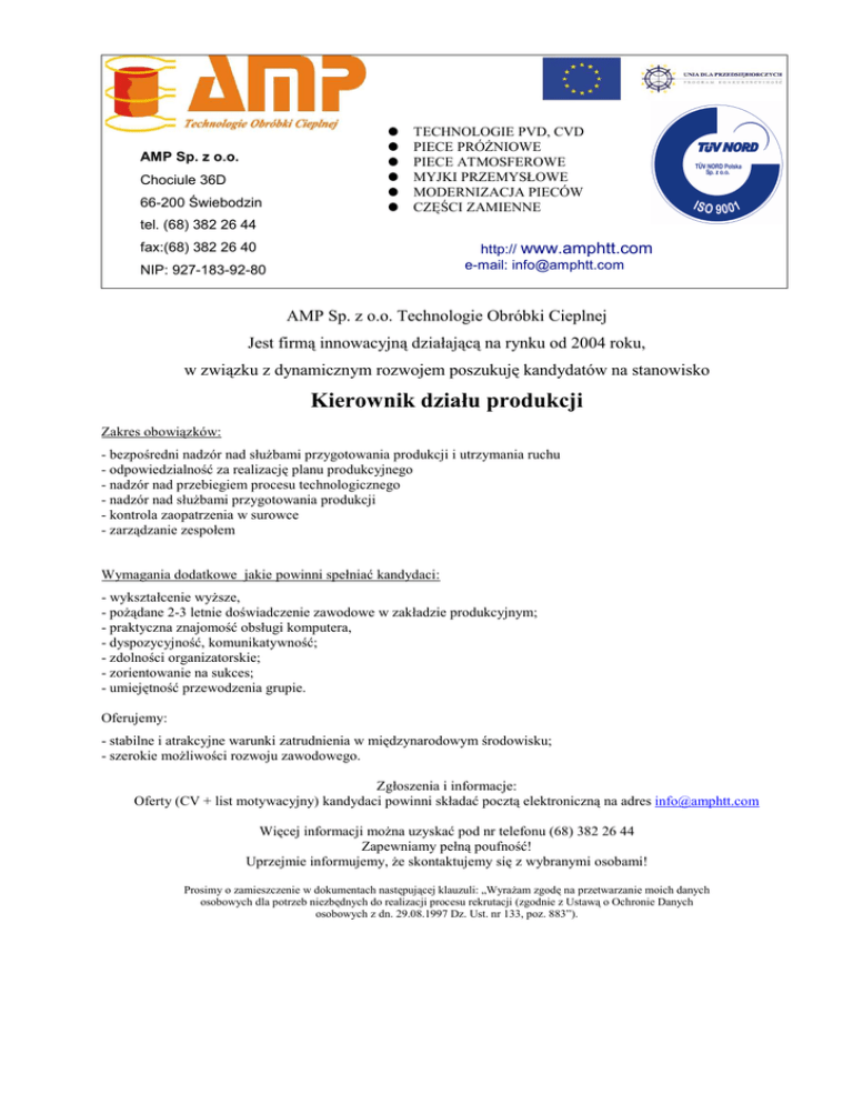 AMP Sp. z o.o. Chociule 36D 66-200 Świebodzin TECHNOLOGIE PVD, CVD PIECE PRÓśNIOWE PIECE ATMOSFEROWE MYJKI PRZEMYSŁOWE MODERNIZACJA PIECÓW CZĘŚCI ZAMIENNE tel. (68) 382 26 44 http:// www.amphtt.com e-mail: [email protected] fax:(68) 382 26 40 NIP: 927-183-92-80 AMP Sp. z o.o. Technologie Obróbki Cieplnej Jest firmą innowacyjną działającą na rynku od 2004 roku, w związku z dynamicznym rozwojem poszukuję kandydatów na stanowisko Kierownik działu produkcji Zakres obowiązków: - bezpośredni nadzór nad słuŜbami przygotowania produkcji i utrzymania ruchu - odpowiedzialność za realizację planu produkcyjnego - nadzór nad przebiegiem procesu technologicznego - nadzór nad słuŜbami przygotowania produkcji - kontrola zaopatrzenia w surowce - zarządzanie zespołem Wymagania dodatkowe jakie powinni spełniać kandydaci: - wykształcenie wyŜsze, - poŜądane 2-3 letnie doświadczenie zawodowe w zakładzie produkcyjnym; - praktyczna znajomość obsługi komputera, - dyspozycyjność, komunikatywność; - zdolności organizatorskie; - zorientowanie na sukces; - umiejętność przewodzenia grupie. Oferujemy: - stabilne i atrakcyjne warunki zatrudnienia w międzynarodowym środowisku; - szerokie moŜliwości rozwoju zawodowego. Zgłoszenia i informacje: Oferty (CV + list motywacyjny) kandydaci powinni składać pocztą elektroniczną na adres [email protected] Więcej informacji moŜna uzyskać pod nr telefonu (68) 382 26 44 Zapewniamy pełną poufność! Uprzejmie informujemy, Ŝe skontaktujemy się z wybranymi osobami! Prosimy o zamieszczenie w dokumentach następującej klauzuli: „WyraŜam zgodę na przetwarzanie moich danych osobowych dla potrzeb niezbędnych do realizacji procesu rekrutacji (zgodnie z Ustawą o Ochronie Danych osobowych z dn. 29.08.1997 Dz. Ust. nr 133, poz. 883”).