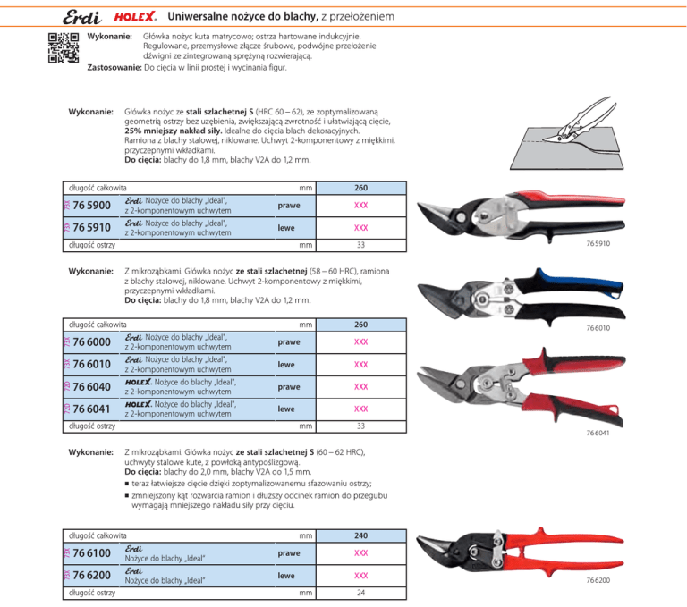 Uniwersalne nożyce do blachy, z przełożeniem Wykonanie: Główka nożyc kuta matrycowo; ostrza hartowane indukcyjnie. Regulowane, przemysłowe złącze śrubowe, podwójne przełożenie dźwigni ze zintegrowaną sprężyną rozwierającą. Zastosowanie: Do cięcia w linii prostej i wycinania figur. Wykonanie: Główka nożyc ze stali szlachetnej S (HRC 60 − 62), ze zoptymalizowaną geometrią ostrzy bez uzębienia, zwiększającą zwrotność i ułatwiającą cięcie, 25% mniejszy nakład siły. Idealne do cięcia blach dekoracyjnych. Ramiona z blachy stalowej, niklowane. Uchwyt 2-komponentowy z miękkimi, przyczepnymi wkładkami. Do cięcia: blachy do 1,8 mm, blachy V2A do 1,2 mm. 73X 76 5900 73X długość całkowita 76 5910 Nożyce do blachy „Ideal", z 2-komponentowym uchwytem Nożyce do blachy „Ideal", z 2-komponentowym uchwytem mm prawe XXX lewe XXX długość ostrzy Wykonanie: mm 73X 73X 76 6010 72D 76 6040 72D 76 6041 Nożyce do blachy „Ideal", z 2-komponentowym uchwytem Nożyce do blachy „Ideal", z 2-komponentowym uchwytem Nożyce do blachy „Ideal", z 2-komponentowym uchwytem Nożyce do blachy „Ideal", z 2-komponentowym uchwytem mm 260 prawe XXX lewe XXX prawe XXX lewe XXX długość ostrzy Wykonanie: 33 mm 33 76 6010 76 6041 Z mikroząbkami. Główka nożyc ze stali szlachetnej S (60 − 62 HRC), uchwyty stalowe kute, z powłoką antypoślizgową. Do cięcia: blachy do 2,0 mm, blachy V2A do 1,5 mm. teraz łatwiejsze cięcie dzięki zoptymalizowanemu sfazowaniu ostrzy; zmniejszony kąt rozwarcia ramion i dłuższy odcinek ramion do przegubu wymagają mniejszego nakładu siły przy cięciu. 240 73X mm 76 6100 Nożyce do blachy „Ideal“ prawe XXX 73X długość całkowita 76 6200 Nożyce do blachy „Ideal“ lewe XXX długość ostrzy 76 5910 Z mikroząbkami. Główka nożyc ze stali szlachetnej (58 − 60 HRC), ramiona z blachy stalowej, niklowane. Uchwyt 2-komponentowy z miękkimi, przyczepnymi wkładkami. Do cięcia: blachy do 1,8 mm, blachy V2A do 1,2 mm. długość całkowita 76 6000 260 mm 24 76 6200 Nożyce „Ideal“ do blachy, z przełożeniem ▶▶ Wykonanie: Z mikroząbkami. Główka nożyc z ostrzami ze stopu wolframowego HSS (65 HRC). Wyjątkowo duża trwałość ostrzy. Ramiona z blachy stalowej, niklowane. Uchwyt 2-komponentowy z miękkimi, przyczepnymi wkładkami. Do cięcia: blachy do 1,8 mm, blachy V2A do 1,2 mm. 260 73X mm prawe XXX 73X długość całkowita do blachy „Ideal", 76 6350 Nożyce z ostrzami z HSS do blachy „Ideal", 76 6360 Nożyce z ostrzami z HSS długość ostrzy lewe XXX Wykonanie: Zaleta: mm 76 6360 33 Główka nożyc z ostrzami ze stali HSS (HRC 65) i powłoką z TiN. Ramiona z blachy stalowej, niklowane. Uchwyt 2-komponentowy z miękkimi, przyczepnymi wkładkami. Do cięcia: blachy do 1,8 mm, blachy V2A do 1,2 mm. Połączenie ostrzy ze stali HSS i powłoki z TiN zapewnia szczególnie długą trwałość i dobrą jakość cięcia, również twardych materiałów. TiN 260 73X mm prawe XXX 73X długość całkowita do blachy „Ideal” z ostrzami z HSS 76 6400 Nożyce i z powłoką z TiN do blachy „Ideal” z ostrzami z HSS 76 6410 Nożyce i z powłoką z TiN długość ostrzy lewe XXX mm 33 76 6410