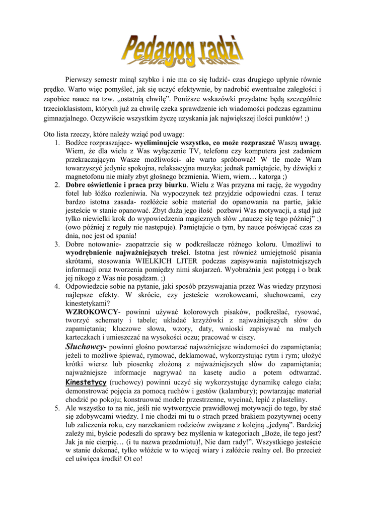 Pierwszy semestr minął szybko i nie ma co się łudzić- czas drugiego upłynie równie prędko. Warto więc pomyśleć, jak się uczyć efektywnie, by nadrobić ewentualne zaległości i zapobiec nauce na tzw. „ostatnią chwilę”. Poniższe wskazówki przydatne będą szczególnie trzecioklasistom, których już za chwilę czeka sprawdzenie ich wiadomości podczas egzaminu gimnazjalnego. Oczywiście wszystkim życzę uzyskania jak największej ilości punktów! ;) Oto lista rzeczy, które należy wziąć pod uwagę: 1. Bodźce rozpraszające- wyeliminujcie wszystko, co może rozpraszać Waszą uwagę. Wiem, że dla wielu z Was wyłączenie TV, telefonu czy komputera jest zadaniem przekraczającym Wasze możliwości- ale warto spróbować! W tle może Wam towarzyszyć jedynie spokojna, relaksacyjna muzyka; jednak pamiętajcie, by dźwięki z magnetofonu nie miały zbyt głośnego brzmienia. Wiem, wiem… katorga ;) 2. Dobre oświetlenie i praca przy biurku. Wielu z Was przyzna mi rację, że wygodny fotel lub łóżko rozleniwia. Na wypoczynek też przyjdzie odpowiedni czas. I teraz bardzo istotna zasada- rozłóżcie sobie materiał do opanowania na partie, jakie jesteście w stanie opanować. Zbyt duża jego ilość pozbawi Was motywacji, a stąd już tylko niewielki krok do wypowiedzenia magicznych słów „nauczę się tego później” ;) (owo później z reguły nie następuje). Pamiętajcie o tym, by nauce poświęcać czas za dnia, noc jest od spania! 3. Dobre notowanie- zaopatrzcie się w podkreślacze różnego koloru. Umożliwi to wyodrębnienie najważniejszych treści. Istotna jest również umiejętność pisania skrótami, stosowania WIELKICH LITER podczas zapisywania najistotniejszych informacji oraz tworzenia pomiędzy nimi skojarzeń. Wyobraźnia jest potęgą i o brak jej nikogo z Was nie posądzam. ;) 4. Odpowiedzcie sobie na pytanie, jaki sposób przyswajania przez Was wiedzy przynosi najlepsze efekty. W skrócie, czy jesteście wzrokowcami, słuchowcami, czy kinestetykami? WZROKOWCY- powinni używać kolorowych pisaków, podkreślać, rysować, tworzyć schematy i tabele; układać krzyżówki z najważniejszych słów do zapamiętania; kluczowe słowa, wzory, daty, wnioski zapisywać na małych karteczkach i umieszczać na wysokości oczu; pracować w ciszy. Słuchowcy- powinni głośno powtarzać najważniejsze wiadomości do zapamiętania; jeżeli to możliwe śpiewać, rymować, deklamować, wykorzystując rytm i rym; ułożyć krótki wiersz lub piosenkę złożoną z najważniejszych słów do zapamiętania; najważniejsze informacje nagrywać na kasetę audio a potem odtwarzać. Kinestetycy (ruchowcy) powinni uczyć się wykorzystując dynamikę całego ciała; demonstrować pojęcia za pomocą ruchów i gestów (kalambury); powtarzając materiał chodzić po pokoju; konstruować modele przestrzenne, wycinać, lepić z plasteliny. 5. Ale wszystko to na nic, jeśli nie wytworzycie prawidłowej motywacji do tego, by stać się zdobywcami wiedzy. I nie chodzi mi tu o strach przed brakiem pozytywnej oceny lub zaliczenia roku, czy narzekaniem rodziców związane z kolejną „jedyną”. Bardziej zależy mi, byście podeszli do sprawy bez myślenia w kategoriach „Boże, ile tego jest? Jak ja nie cierpię… (i tu nazwa przedmiotu)!, Nie dam rady!”. Wszystkiego jesteście w stanie dokonać, tylko włóżcie w to więcej wiary i załóżcie realny cel. Bo przecież cel uświęca środki! Ot co!