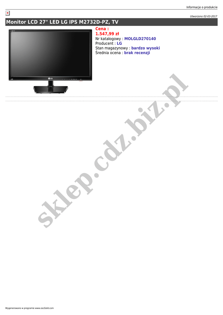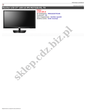 Informacje o produkcie Utworzono 02-03-2017 Monitor LCD 27" LED LG IPS M2732D-PZ, TV Cena : 1.547,99 zł sk le p .c dz .b iz .p l Nr katalogowy : MOLGLD270140 Producent : LG Stan magazynowy : bardzo wysoki Średnia ocena : brak recenzji Wygenerowano w programie www.oscGold.com