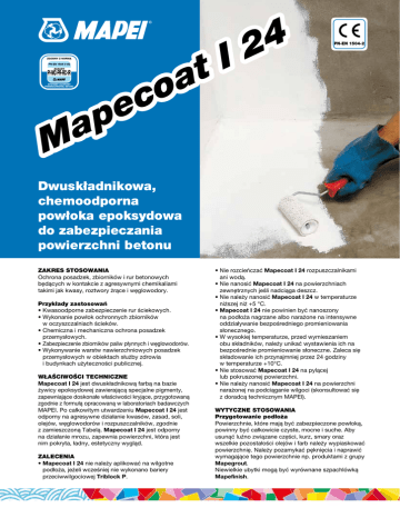 ZGODNY Z NORMĄ ZASADY PI-MC-PR-RC-IR c e SYSTEMY OCHRONY POWIERZCHNIOWEJ BETONU p a M I t a o PN-EN 1504-2 (C) 4 2 PN-EN 1504-2 1504-3 PN-EN Dwuskładnikowa, chemoodporna powłoka epoksydowa do zabezpieczania powierzchni betonu ZAKRES STOSOWANIA Ochrona posadzek, zbiorników i rur betonowych będących w kontakcie z agresywnymi chemikaliami takimi jak kwasy, roztwory żrące i węglowodory. Przykłady zastosowań • Kwasoodporne zabezpieczenie rur ściekowych. • Wykonanie powłok ochronnych zbiorników w oczyszczalniach ścieków. • Chemiczna i mechaniczna ochrona posadzek przemysłowych. • Zabezpieczenie zbiorników paliw płynnych i węglowodorów. • Wykonywanie warstw nawierzchniowych posadzek przemysłowych w obiektach służby zdrowia i budynkach użyteczności publicznej. WŁAŚCIWOŚCI TECHNICZNE Mapecoat I 24 jest dwuskładnikową farbą na bazie żywicy epoksydowej zawierającą specjalne pigmenty, zapewniające doskonałe właściwości kryjące, przygotowaną zgodnie z formułą opracowaną w laboratoriach badawczych MAPEI. Po całkowitym utwardzeniu Mapecoat I 24 jest odporny na agresywne działanie kwasów, zasad, soli, olejów, węglowodorów i rozpuszczalników, zgodnie z zamieszczoną Tabelą. Mapecoat I 24 jest odporny na działanie mrozu, zapewnia powierzchni, która jest nim pokryta, ładny, estetyczny wygląd. ZALECENIA •M apecoat I 24 nie należy aplikować na wilgotne podłoża, jeżeli wcześniej nie wykonano bariery przeciwwilgociowej Triblock P. • Nie rozcieńczać Mapecoat I 24 rozpuszczalnikami ani wodą. • Nie nanosić Mapecoat I 24 na powierzchniach zewnętrznych jeśli nadciąga deszcz. • Nie należy nanosić Mapecoat I 24 w temperaturze niższej niż +5 °C. • Mapecoat I 24 nie powinien być nanoszony na podłoża nagrzane albo narażone na intensywne oddziaływanie bezpośredniego promieniowania słonecznego. • W wysokiej temperaturze, przed wymieszaniem obu składników, należy unikać wystawienia ich na bezpośrednie promieniowanie słoneczne. Zaleca się składowanie ich przynajmniej przez 24 godziny w temperaturze +10°C. • Nie stosować Mapecoat I 24 na pylącej lub pokruszonej powierzchni. • Nie należy nanosić Mapecoat I 24 na powierzchni narażonej na podciąganie wilgoci (skonsultować się z doradcą technicznym MAPEI). WYTYCZNE STOSOWANIA Przygotowanie podłoża Powierzchnie, które mają być zabezpieczone powłoką, powinny być całkowicie czyste, mocne i suche. Aby usunąć luźno związane części, kurz, smary oraz wszelkie pozostałości olejów i farb należy wypiaskować powierzchnię. Należy pozamykać pęknięcia i naprawić wymagające tego powierzchnie np. produktami z grupy Mapegrout. Niewielkie ubytki mogą być wyrównane szpachlówką Mapefinish. p Ma a o ec 4 2 tI DANE TECHNICZNE DANE IDENTYFIKACYJNE PRODUKTU składnik A składnik B Barwa: biała, szara (RAL 7001) i neutralna przezroczysta Konsystencja: gęsta pasta ciecz Gęstość: 1,43 g/cm³ 1,00 g/cm³ Lepkość: 2’500 mPa*s (wirnik nr 5, 20 obr./min.) 500 mPa*s (wirnik nr 2, 50 obr./min.) APPLICATION DATA (at +23°C and 50% R.H.) Mieszanie obu składników Aplikacja Mapecoat I 24 za pomocą wałka Aplikacja Mapecoat I 24 na podłożu betonowym Proporcja mieszania: składnik A:składnik B = 4:1 Gęstość mieszaniny A + B: 1300 kg/m³ Lepkość: 1’500 mPa*s (wirnik nr 3, 10 obr./min.) Barwa mieszaniny A + B: biała, szara (RAL 7001) i neutralna Temperatura aplikacji: od +5°C do +30°C Czas przydatności do użycia po wymieszaniu: 30 – 40 minut Wstępne związanie powierzchniowe: po 4 – 5 godzinach Czas oczekiwania do naniesienia kolejnej warstwy: 6 – 24 godzin Końcowe utwardzenie: po 3 dniach W przypadki aplikacji Mapecoat I 24 na wilgotne podłoże, konieczne jest wykonanie bariery przeciwwilgociowej z trójskładnikowego materiału cementowo – epoksydowego Triblock P (szczegóły aplikacji materiału w karcie technicznej Triblock P). Rozcieńczony w odpowiedniej proporcji wodą Triblock P można nanosić bez dodatku piasku, albo, gdy wymagana jest szorstkość powierzchni, z dodatkiem wypełniacza Quartz 0,25 albo Quartz 0,5. Mapecoat I 24 należy stosować wyłącznie na całkowicie wysezonowane podłoże. Przygotowanie materiału Należy wlać składnik B (utwardzacz) do składnika A (żywica) i mieszać mieszadłem wolnoobrotowym, aby uniknąć napowietrzenia, do momentu otrzymania jednorodnej pasty. Składniki powinny być mieszane w całości, ponieważ ich częściowe mieszanie może powodować błędy w dozowaniu, które mogą mieć wpływ na twardnienie Mapecoat I 24. Mapecoat I 24 jest dostępny w kolorach: białym, szarym (RAL 7001) i neutralnym. Produkt w kolorze neutralnym może być barwiony Mapecolor Paste. Na opakowanie 5 kg Mapecoat I 24 należy dodać 0,7 kg pigmentu Mapecolor Paste. APLIKACJA MATERIAŁU Mapecoat I 24 może być nanoszony pędzlem, wałkiem lub metodą natrysku w 2 warstwach. Druga warstwa może być nanoszona, w zależności od warunków otoczenia po 6 do 24 godzinach. Świeżo naniesiony materiał chronić przed deszczem przez przynajmniej 12 godzin. Mapecoat I 24 może być obciążony niewielkim ruchem pieszym już po 24 godzinach. Utrzymanie powierzchni Powierzchnia zabezpieczona Mapecoat I 24 może być myta wodą i detergentami po uprzednim przeprowadzeniu wstępnego testu. CZYSZCZENIE NARZĘDZI Sprzęt i narzędzia, niezwłocznie po zakończeniu prac można oczyścić alkoholem etylowym zanim Mapecoat I 24 się utwardzi. Utwardzony produkt można usunąć jedynie mechanicznie. ZUŻYCIE 0,40 – 0,60 kg/m² na warstwę. OPAKOWANIA Mapecoat I 24 jest dostarczany w 5 kg opakowaniach (składnik A: 4 kg oraz składnik B: 1 kg). ODPORNOŚĆ CHEMICZNA Mapecoat I 24 Substancja chemiczna Stężenie [%] Rodzaj narażenia Stałe Sporadyczne KWASY Kwas octowy 2,5 + + Kwas chlorowodorowy (solny) 37 (+) + Kwas chromowy 20 – – Kwas cytrynowy 10 + + Kwas metanowy (mrówkowy) 2.5 + + Kwas mlekowy 2.5