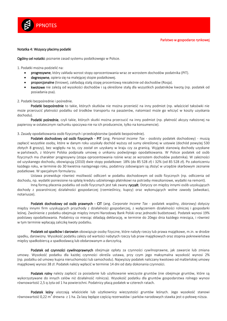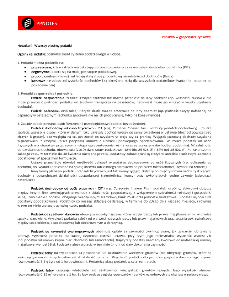 Państwo w gospodarce rynkowej Notatka 4: Wszyscy płacimy podatki Ogólny cel notatki: poznanie zasad systemu podatkowego w Polsce. 1. Podatki można podzielić na: progresywne, który zakłada wzrost stopy oprocentowania wraz ze wzrostem dochodów podatnika (PIT). degresywne, opiera się na malejącej stopie podatkowej. proporcjonalne (liniowe), zakładają stałą stopę procentową niezależnie od dochodów (Rosja). kwotowe nie zależą od wysokości dochodów i są określone stałą dla wszystkich podatników kwotą (np. podatek od posiadania psa). 2. Podatki bezpośrednie i pośrednie. Podatki bezpośrednie to takie, których skutków nie można przenieść na inny podmiot (np. właściciel taksówki nie może przerzucić płatności podatku od środków transportu na pasażerów, natomiast może go wliczyć w koszty uzyskania dochodu). Podatki pośrednie, czyli takie, których skutki można przerzucić na inny podmiot (np. płatność akcyzy nałożonej na papierosy w ostatecznym rachunku spoczywa nie na ich producencie, tylko na konsumencie). 3. Zasady opodatkowania osób fizycznych i przedsiębiorstw (podatki bezpośrednie). Podatek dochodowy od osób fizycznych - PIT (ang. Personal Income Tax - osobisty podatek dochodowy) - muszą zapłacić wszystkie osoby, które w danym roku uzyskały dochód wyższy od sumy określonej w ustawie (dochód powyżej 530 złotych 8 groszy), bez względu na to, czy został on uzyskany w kraju czy za granicą. Wyjątek stanowią dochody uzyskane w państwach, z którymi Polska podpisała umowę o unikaniu podwójnego opodatkowania. W Polsce podatek od osób fizycznych ma charakter progresywny (stopa oprocentowania rośnie wraz ze wzrostem dochodów podatnika). W zależności od uzyskanego dochodu, obowiązują (2010) dwie stopy podatkowe: 18% (do 85 528 zł) i 32% (od 85 528 zł). Po zakończeniu każdego roku, w terminie do 30 kwietnia następnego roku, podatnicy zobowiązani są złożyć w urzędzie skarbowym zeznanie podatkowe. W specjalnym formularzu. Ustawa przewiduje również możliwość odliczeń w podatku dochodowym od osób fizycznych (np. odliczenia od dochodu, np. wydatki poniesione na spłatę kredytu udzielonego płatnikowi na potrzeby mieszkaniowe, wydatki na remont). Inną formą płacenia podatku od osób fizycznych jest tak zwany ryczałt. Dotyczy on między innymi osób uzyskujących dochody z pozarolniczej działalności gospodarczej (rzemieślnicy, kupcy) oraz wykonujących wolne zawody (adwokaci, notariusze). Podatek dochodowy od osób prawnych - CIT (ang. Corporate Income Tax - podatek wspólny, zbiorowy) dotyczy między innymi firm uzyskujących przychody z działalności gospodarczej, z wyłączeniem działalności rolniczej i gospodarki leśnej. Zwolnienie z podatku obejmuje między innymi Narodowy Bank Polski oraz jednostki budżetowe). Podatek wynosi 19% podstawy opodatkowania. Podatnicy co miesiąc składają deklarację, w terminie do 20ego dnia każdego miesiąca, i również w tym terminie wpłacają zaliczkę kwoty podatku. Podatek od spadków i darowizn obowiązuje osoby fizyczne, które nabyły rzeczy lub prawa majątkowe, m.in. w drodze spadku, darowizny. Wysokość podatku zależy od wartości nabytych rzeczy lub praw majątkowych oraz stopnia pokrewieństwa między spadkobiercą a spadkodawcą lub obdarowanym a darczyńcą. Podatek od czynności cywilnoprawnych obejmuje opłaty za czynności cywilnoprawne, jak zawarcie lub zmiana umowy. Wysokość podatku dla każdej czynności określa ustawa, przy czym jego maksymalna wysokość wynosi 2% (np. podatku od umowy kupna nieruchomości lub samochodu). Najwyższy podatek naliczany kwotowo od małżeńskiej umowy majątkowej wynosi 38 zł. Podatek należy wpłacić w terminie 14 dni od daty dokonania czynności. Podatek rolny należy zapłacić za posiadanie lub użytkowanie wieczyste gruntów (nie obejmuje gruntów, które są wykorzystywane do innych celów niż działalność rolnicza). Wysokość podatku dla gruntów gospodarstwa rolnego wynosi równowartość 2,5 q żyta od 1 ha powierzchni. Podatnicy płacą podatek w czterech ratach. Podatek leśny uiszczają właściciele lub użytkownicy wieczystości gruntów leśnych. Jego wysokość stanowi 3 równowartość 0,22 m drewna z 1 ha. Za lasy będące częścią rezerwatów i parków narodowych stawka jest o połowę niższa. Podatki i opłaty lokalne: podatek od nieruchomości, podatek od środków transportu, podatek od posiadania psa oraz wpływy z różnych opłat. 4. Podatek od towarów i usług, podatek akcyzowy (podatki pośrednie). Podatek od towarów i usług - VAT (ang. Value Added Tax - podatek od wartości dodanej) obejmuje sprzedaż towarów, odpłatne świadczenie usług oraz eksport towarów i usług. Podatnikami są przedsiębiorstwa, jednostki organizacyjne, osoby fizyczne działające na terenie Polski. Zwolnienia z VAT mogą dotyczyć świadczenia usług w zakresie rolnictwa, oświaty, ochrony zdrowia, opieki społecznej. Podstawowa stawka podatku, wynosi 22%, ale występuj niższe stawki (7, 3 i 0%). Stawka zerowa najczęściej stosowana jest w eksporcie. Zaletą takiego systemu opodatkowania jest regulowanie należności na bieżąco, dlatego do budżetu państwa pieniądze mogą wpływać systematycznie przez cały rok. Podatek akcyzowy (specjalny podatek nakładany na towary, najczęściej luksusowe) w Polsce obejmuje m.in.: paliwa, samochody osobowe, jachty pełnomorskie, alkohol, wyroby tytoniowe, energię elektryczną, automaty hazardowe, kamery wideo, sól, perfumy. Stawki akcyzy określa się procentowo (np. dla broni myśliwskiej wynosi 20%) lub kwotowo (np. dla papierosów około 57 zł za 1000 sztuk). Podatek od gier dotyczy osób i firm prowadzących działalność związaną z grami losowymi (gry liczbowe, loterie pieniężne, automaty losowe). Stawki opodatkowania uzależnione są od rodzaju gry i wahają się 10% dla loterii fantowych do 45% dla gier prowadzonych w kasy