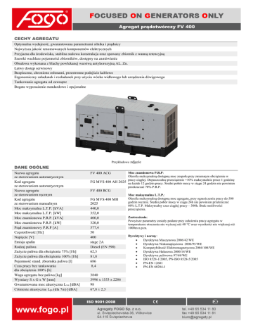 Agregat prądotwórczy FV 400 CECHY AGREGATU Optymalna wydajność, gwarantowana parametrami silnika i prądnicy Najwyższa jakość renomowanych komponentów elektrycznych Przyjazna dla środowiska, stabilna stalowa konstrukcja oraz spawany zbiornik z wanną retencyjną Szeroki wachlarz pojemności zbiorników, dostępny na zamówienie Obudowa wykonana z blachy powlekanej warstwą antykorozyjną AL. Zn. Łatwy dostęp serwisowy Bezpieczne, chronione osłonami, przestronne podejście kablowe Ergonomiczny załadunek i rozładunek przy użyciu wózka widłowego lub urządzenia dźwigowego Tankowanie agregatu od zewnątrz Bogate wyposażenie standardowe i opcjonalne Przykładowe zdjęcie DANE OGÓLNE Nazwa agregatu ze sterowaniem automatycznym Kod agregatu ze sterowaniem automatycznym Nazwa agregatu ze sterowaniem ręcznym Kod agregatu ze sterowaniem manualnym Moc maksymalna L.T.P. [kVA] Moc maksymalna L.T.P. [kW] Moc znamionowa P.R.P. [kVA] Moc znamionowa P.R.P. [kW] Prąd znamionowy P.R.P [A] Częstotliwość [Hz] Napięcie [V] Emisja spalin Rodzaj paliwa Zużycie paliwa dla obciążenia 75% [l/h] Zużycie paliwa dla obciążenia 100% [l/h] Pojemność stand. zbiornika paliwa [l] Czas pracy bez tankowania dla obciążenia 100% [h] Waga agregatu bez paliwa [kg] Wymiary S x G x W [mm] Gwarantowana moc akustyczna Lwa [dBA] Ciśnienie akustyczne Lpa (dla 7m) [dBA] FV 400 ACG Moc znamionowa P.R.P: Określa maksymalną dostępną moc zespołu przy zmiennym obciążeniu w pracy ciągłej. Dopuszczalne przeciążenie +10% maksymalnie przez 1 godzinę FG MVS 400 AH 2025 na każde 12 godzin pracy. Średni pobór mocy w ciągu 24 godzin nie powinien przekraczać 70% P.R.P. FV 400 RCG FG MVS 400 MH 2025 440,0 352,0 400,0 320,0 577,4 50 400 stage 2A Diesel (EN 590) 62,3 81,8 686 8,4 3840 3996 x 1553 x 2286 98 67,8 ± 2,3 Moc maksymalna L.T.P.: Określa maksymalną dostępną moc agregatu, przy ograniczeniu pracy do 500 godzin rocznie. Średni pobór mocy w ciągu 24h nie powinien przekraczać 80% L.T.P. Maksymalny czas ciągłej pracy – 300h. Brak możliwości przeciążenia. Zastrzeżenia: Powyższe parametry zostały podane przy założeniu pracy agregatu w temperaturze otoczenia nie wyższej niż 40 °C oraz wysokości nie większej niż 1000m n.p.m. Dyrektywy i normy: Dyrektywa Maszynowa 2006/42/WE Dyrektywa Niskonapięciowa 2006/95/WE Kompatybilność Elektromagnetyczna 2004/108/WE Dyrektywa Hałasowa 2000/14/WE Dyrektywa paliwowa 97/68/WE ISO 8528-1/2005, PN-ISO 8528-5/2005 PN-EN 12601 PN-EN 60204-1 Agregat prądotwórczy FV 400 STEROWNIK STANDARD Kod sterownika: 2025 Intuicyjny interfejs graficzny Dziennik zdarzeń: do 119 pozycji, zapis kompletnej historii Pomiar wartości prądu w 3 fazach Pomiar wartości napięć fazowych i przewodowych po stronie agregatu Pomiar mocy czynnej, biernej i pozornej Licznik energii czynnej i biernej Licznik czasu pracy Pomiar napięcia akumulatora Pomiar poziomu paliwa Zegar czasu rzeczywistego Ochrona generatora (częstotliwość, napięcie, asymetria) Komunikacja RS 232 (wymagany moduł IL-NT RS232 lub IL-NT RS232-485) Komunikacja RS 485 Modbus (wymagany moduł IL-NT RS232-485) Bezpośrednia komunikacja z silnikami po magistrali CAN, odczyt i wyświetlanie parametrów z modułu ECU Obsługa zdalna przez GPRS (wymagany moduł IL-NT GPRS) Obsługa zdalna przez Internet (wymagany moduł IB-Lite) Darmowy system InteliMonitor do podglądu parametrów agregatów lub WebSupervisor do zarządzania flotą urządzeń Darmowa aplikacja WebSupervisor dla Android lub iOS do podglądu floty agregatów Wysyłanie powiadomień o błędach poprzez SMS lub e-mail (wymagany moduł IL-NT GPRS lub IB-Lite SILNIK Producent silnika Typ silnika Moc silnika netto [kW] Emisja spalin* Obroty [obr/min] Regulacja obrotów Klasa wykonania** Pojemność silnika [l] Liczba cylindrów Instalacja [V] Płyn chłodzący Pojemność cieczy chłodzącej [l] Olej silnikowy Pojemność miski olejowej [l] Rodzaj paliwa Zużycie paliwa dla obciążenia 75% [l/h] Zużycie paliwa dla obciążenia 100% [l/h] PRĄDNICA Volvo TAD1344GE 354,0 stage 2A 1500 elektroniczna G3 12,8 6 24 Volvo Coolant VCS 44,0 Shell Rimula R4L 36,0 Diesel (EN 590) 62,3 81,8 Zgodnie z Dyrektywą 97/68/WE dotyczącą ograniczenia emisji zanieczyszczeń gazowych i pyłowych z silników spalinowych, montowanych w maszynach samojezdnych, nieporuszających się po drogach. ** Zgodnie z normą PN-ISO 8528-5/1997 * Producent prądnicy Typ prądnicy Moc prądnicy (40 ºC, 1000m n.p.m.) [kVA] Moc prądnicy (27 ºC, 1000m n.p.m.) [kVA] Sprawność prądnicy [%] Stabilizacja napięcia Poziom stabilizacji napięcia [%] Ochrona Klasa izolacji Odkształcenia harmoniczne prądu THD [%] Reaktancja Xd’’ [%] Sincro SK315SM 400,0 436,0 93,4 AVR cyfrowy 0,25 IP 23 H <2 15.2 Agregat prądotwórczy FV 400 WYPOSAŻENIE STANDARDOWE Sterownik Wyłącznik sterownika Wyłącznik główny agregatu Cewka podnapięciowa wyłącznika głównego (ster. ręczne) Cyfrowy 3 fazowy AVR Sygnalizator dźwiękowy awarii Przycisk awaryjnego zatrzymania Akumulator rozruchowy Ładowarka akumulatora (ster. automatyczne) Grzałka silnika sterowana termostatem Olej silnikowy Czujnik krańcowy oleju Miernik ciśnienia oleju Czujnik krańcowy temperatury silnika Miernik temperatury silnika Elektroniczny regulator obrotów Rama ze zbiornikiem Korki spustowe przestrzeni retencyjnej Zamykany wlew paliwa na zewnątrz obudowy Miernik poziomu paliwa Filtr paliwa z separatorem wody Kompensator i tłumik spalin Płyn chłodzący Wlew płynu chłodzącego na dachu obudowy Wibroizolatory drgań silnika i prądnicy Obudowa wyciszona, wykonana z blachy Al.-Zn Standardowy kolor RAL 7032 Uchwyty transportowe WYPOSAŻENIE I USŁUGI OPCJONALNE AMF25 (2025) EATON LZM 2x180 Ah Shell Rimula R4L Volvo Coolant VCS Ręczna pompa do spustu oleju Zawór spustowy paliwa Wyłącznik układu ogrzewania silnika na płycie czołowej Czujnik wycieku w wannie retencyjnej Niestandardowy zbiornik pali