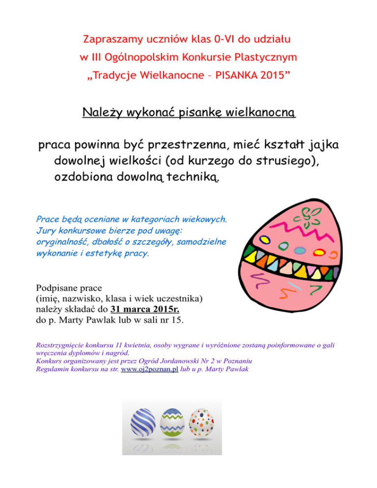 Zapraszamy uczniów klas 0-VI do udziału w III Ogólnopolskim Konkursie Plastycznym „Tradycje Wielkanocne – PISANKA 2015” Należy wykonać pisankę wielkanocną praca powinna być przestrzenna, mieć kształt jajka dowolnej wielkości (od kurzego do strusiego), ozdobiona dowolną techniką. Prace będą oceniane w kategoriach wiekowych. Jury konkursowe bierze pod uwagę: oryginalność, dbałość o szczegóły, samodzielne wykonanie i estetykę pracy. Podpisane prace (imię, nazwisko, klasa i wiek uczestnika) należy składać do 31 marca 2015r. do p. Marty Pawlak lub w sali nr 15. Rozstrzygnięcie konkursu 11 kwietnia, osoby wygrane i wyróżnione zostaną poinformowane o gali wręczenia dyplomów i nagród. Konkurs organizowany jest przez Ogród Jordanowski Nr 2 w Poznaniu Regulamin konkursu na str. www.oj2poznan.pl lub u p. Marty Pawlak