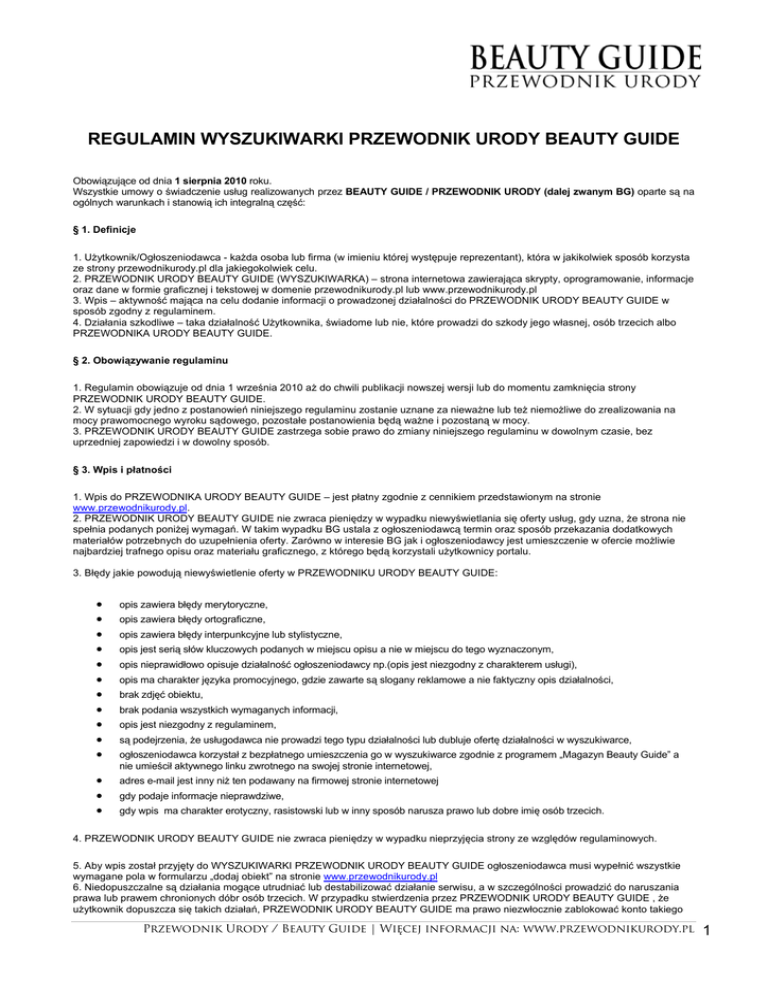 REGULAMIN WYSZUKIWARKI PRZEWODNIK URODY BEAUTY GUIDE Obowiązujące od dnia 1 sierpnia 2010 roku. Wszystkie umowy o świadczenie usług realizowanych przez BEAUTY GUIDE / PRZEWODNIK URODY (dalej zwanym BG) oparte są na ogólnych warunkach i stanowią ich integralną część: § 1. Definicje 1. Użytkownik/Ogłoszeniodawca - każda osoba lub firma (w imieniu której występuje reprezentant), która w jakikolwiek sposób korzysta ze strony przewodnikurody.pl dla jakiegokolwiek celu. 2. PRZEWODNIK URODY BEAUTY GUIDE (WYSZUKIWARKA) – strona internetowa zawierająca skrypty, oprogramowanie, informacje oraz dane w formie graficznej i tekstowej w domenie przewodnikurody.pl lub www.przewodnikurody.pl 3. Wpis – aktywność mająca na celu dodanie informacji o prowadzonej działalności do PRZEWODNIK URODY BEAUTY GUIDE w sposób zgodny z regulaminem. 4. Działania szkodliwe – taka działalność Użytkownika, świadome lub nie, które prowadzi do szkody jego własnej, osób trzecich albo PRZEWODNIKA URODY BEAUTY GUIDE. § 2. Obowiązywanie regulaminu 1. Regulamin obowiązuje od dnia 1 września 2010 aż do chwili publikacji nowszej wersji lub do momentu zamknięcia strony PRZEWODNIK URODY BEAUTY GUIDE. 2. W sytuacji gdy jedno z postanowień niniejszego regulaminu zostanie uznane za nieważne lub też niemożliwe do zrealizowania na mocy prawomocnego wyroku sądowego, pozostałe postanowienia będą ważne i pozostaną w mocy. 3. PRZEWODNIK URODY BEAUTY GUIDE zastrzega sobie prawo do zmiany niniejszego regulaminu w dowolnym czasie, bez uprzedniej zapowiedzi i w dowolny sposób. § 3. Wpis i płatności 1. Wpis do PRZEWODNIKA URODY BEAUTY GUIDE – jest płatny zgodnie z cennikiem przedstawionym na stronie www.przewodnikurody.pl. 2. PRZEWODNIK URODY BEAUTY GUIDE nie zwraca pieniędzy w wypadku niewyświetlania się oferty usług, gdy uzna, że strona nie spełnia podanych poniżej wymagań. W takim wypadku BG ustala z ogłoszeniodawcą termin oraz sposób przekazania dodatkowych materiałów potrzebnych do uzupełnienia oferty. Zarówno w interesie BG jak i ogłoszeniodawcy jest umieszczenie w ofercie możliwie najbardziej trafnego opisu oraz materiału graficznego, z którego będą korzystali użytkownicy portalu. 3. Błędy jakie powodują niewyświetlenie oferty w PRZEWODNIKU URODY BEAUTY GUIDE: • • • • • • • • • • • • • • opis zawiera błędy merytoryczne, opis zawiera błędy ortograficzne, opis zawiera błędy interpunkcyjne lub stylistyczne, opis jest serią słów kluczowych podanych w miejscu opisu a nie w miejscu do tego wyznaczonym, opis nieprawidłowo opisuje działalność ogłoszeniodawcy np.(opis jest niezgodny z charakterem usługi), opis ma charakter języka promocyjnego, gdzie zawarte są slogany reklamowe a nie faktyczny opis działalności, brak zdjęć obiektu, brak podania wszystkich wymaganych informacji, opis jest niezgodny z regulaminem, są podejrzenia, że usługodawca nie prowadzi tego typu działalności lub dubluje ofertę działalności w wyszukiwarce, ogłoszeniodawca korzystał z bezpłatnego umieszczenia go w wyszukiwarce zgodnie z programem „Magazyn Beauty Guide” a nie umieścił aktywnego linku zwrotnego na swojej stronie internetowej, adres e-mail jest inny niż ten podawany na firmowej stronie internetowej gdy podaje informacje nieprawdziwe, gdy wpis ma charakter erotyczny, rasistowski lub w inny sposób narusza prawo lub dobre imię osób trzecich. 4. PRZEWODNIK URODY BEAUTY GUIDE nie zwraca pieniędzy w wypadku nieprzyjęcia strony ze względów regulaminowych. 5. Aby wpis został przyjęty do WYSZUKIWARKI PRZEWODNIK URODY BEAUTY GUIDE ogłoszeniodawca musi wypełnić wszystkie wymagane pola w formularzu „dodaj obiekt” na stronie www.przewodnikurody.pl 6. Niedopuszczalne są działania mogące utrudniać lub destabilizować działanie serwisu, a w szczególności prowadzić do naruszania prawa lub prawem chronionych dóbr osób trzecich. W przypadku stwierdzenia przez PRZEWODNIK URODY BEAUTY GUIDE , że użytkownik dopuszcza się takich działań, PRZEWODNIK URODY BEAUTY GUIDE ma prawo niezwłocznie zablokować konto takiego Przewodnik Urody / Beauty Guide | Więcej informacji na: www.przewodnikurody.pl 1 użytkownika. W takiej sytuacji PRZEWODNIK URODY BEAUTY GUIDE podejmie również wszelkie działania, które będą zmierzały do naprawienia poniesionej szkody na koszt użytkownika, który dokonał nadużycia. W takim przypadku PRZEWODNIK URODY BEAUTY GUIDE nie zwraca pieniędzy wpłaconych przez ogłoszeniodawcę. 7. Opłata zapewnia użytkownikowi, że w ciągu 7 dni (w dni robocze) moderatorzy serwisu zweryfikują wpis i sprawdzą czy nadaje się ona do PRZEWODNIKA URODY BEAUTY GUIDE. Jeżeli wpis będzie uznany za zgodny z Regulaminem, moderatorzy dodadzą go do WYSZUKIWARKI PRZEWODNIK URODY BEAUTY GUIDE, o czym powiadomią Użytkownika pocztą elektroniczną. W przypadku odrzucenia Użytkownik również zostanie powiadomiony pocztą elektroniczną o decyzji nieprzyjęcia strony do WYSZUKIWARKI PRZEWODNIK URODY BEAUTY GUIDE. 8. Zmiana opisu oferty może zostać wykonana na życzenie ogłoszeniodawcy – lecz to PRZEWODNIK URODY BEAUTY GUIDE zdecyduje w jakim czasie to nastąpi oraz na jakich warunkach. 9. W przypadku popełnienia przez moderatorów błędu podczas dodawania oferty, bądź zmiany jej opisu, Użytkownik ma prawo zgłosić błąd kontaktując się z nami za pomocą e-maila na adres: [email protected], który podany jest również w zakładce „kontakt” na stronie www.przewodnikurody.pl. Jeśli zgłoszenie będzie uzasadnione, moderatorzy nieodpłatnie wprowadzą zmiany. § 4. Odpowiedzialność PRZEWODNIKA URODY BEAUTY GUIDE 1. PRZEWODNIK URODY BEAUTY GUIDE nie ponosi odpowiedzialności za utrudnienia czy też niemożność uzyskania dostępu do danych zgromadzonych na serwerze PRZEWODNIK URODY BEAUTY GUIDE wynikającą z przyczyn od niego niezależnych a w szczególności awarii technicznych