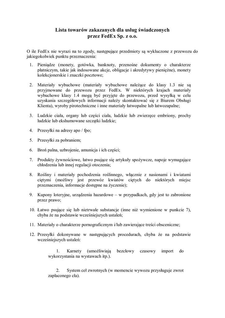 Lista towarów zakazanych dla usług świadczonych przez FedEx Sp. z o.o. O ile FedEx nie wyrazi na to zgody, następujące przedmioty są wykluczone z przewozu do jakiegokolwiek punktu przeznaczenia: 1. Pieniądze (monety, gotówka, banknoty, przenośne dokumenty o charakterze płatniczym, takie jak indosowane akcje, obligacje i akredytywy pieniężne), monety kolekcjonerskie i znaczki pocztowe; 2. Materiały wybuchowe (materiały wybuchowe należące do klasy 1.3 nie są przyjmowane do przewozu przez FedEx. W niektórych krajach materiały wybuchowe klasy 1.4 mogą być przyjęte do przewozu, przed wysyłką w celu uzyskania szczegółowych informacji należy skontaktować się z Biurem Obsługi Klienta), wyroby pirotechniczne i inne materiały łatwopalne lub łatwozapalne; 3. Ludzkie ciała, organy lub części ciała, ludzkie lub zwierzęce embriony, prochy ludzkie lub ekshumowane szczątki ludzkie; 4. Przesyłki na adresy apo / fpo; 5. Przesyłki za pobraniem; 6. Broń palna, uzbrojenie, amunicja i ich części; 7. Produkty żywnościowe, łatwo psujące się artykuły spożywcze, napoje wymagające chłodzenia lub innej regulacji otoczenia; 8. Rośliny i materiały pochodzenia roślinnego, włącznie z nasionami i kwiatami ciętymi (możliwy jest przewóz kwiatów ciętych do niektórych miejsc przeznaczenia, informacje dostępne na życzenie); 9. Kupony loteryjne, urządzenia hazardowe – w przypadkach, gdy jest to zabronione przez prawo; 10. Łatwo psujące się lub nietrwałe substancje (inne niż wymienione w punkcie 7), chyba że na podstawie wcześniejszych ustaleń; 11. Materiały o charakterze pornograficznym i/lub zawierające treści obsceniczne; 12. Przesyłki dokonywane w następujących procedurach, chyba że na podstawie wcześniejszych ustaleń: 1. Karnety (umożliwiają wykorzystania na wystawach itp.). bezcłowy czasowy import do 2. System ceł zwrotnych (w momencie wywozu przysługuje zwrot zapłaconego cła). 3. Odprawa czasowa pod zabezpieczeniem (umożliwiają czasowy import w celu naprawy itp.). 4. Akredytywy; Przesyłki z zastosowaniem akredytywy są zasadniczo zabronione z wyjątkiem przesyłek z zastosowaniem akredytywy wymagającej „kurierskiego dowodu nadania” określonej w "Jednolitych zwyczajach i praktykach dotyczących akredytyw dokumentowych” UCP 600 – Art. 25, jeżeli przesyłka jest przesyłana za pomocą Międzynarodowego (Lotniczego) Listu Przewozowego FedEx Expanded Service. 13. Odpady niebezpieczne, zwłaszcza używane igły do strzykawek / strzykawki lub odpady medyczne; 14. Mokry lód (zmrożona woda); 15. Przesyłki wymagające od FedEx specjalnych zezwoleń lub licencji na transport, import lub eksport; 16. Przesyłki, których transport, import lub eksport jest zakazany przez jakiekolwiek prawo, ustawę lub regulamin; 17. Przesyłki, których zadeklarowana wartość przekracza dopuszczalną wartość celną (patrz rozdział 18: DEKLAROWANA WARTOŚĆ I OGRANICZENIE ODPOWIEDZIALNOŚCI); 18. Towary niebezpieczne z wyjątkiem dozwolonych w rozdziale 9 "Towary Niebezpieczne"; 19. Zwierzęta martwe lub wypchane; 20. Paczki wilgotne lub nieszczelne lub wydzielające wszelkiego rodzaju zapachy; 21. Paczki zawinięte w papier pakowy; 22. Żywe zwierzęta i insekty, chyba że transport jest skoordynowany i zatwierdzony przez oddział FedEx ds. żywych zwierząt. W celu uzyskania dokładnych informacji klienci mogą się z FedEx kontaktować na miejscu. Nie dopuszcza się zwierząt domowych i ryb. 23. Przesyłki mogące wyrządzić szkodę lub spowodowań opóźnienie, jeżeli chodzi o wyposażenie, personel lub inne Przesyłki. FedEx wyklucza odpowiedzialność za przewóz tego rodzaju Przesyłek, również w przypadku przyjęcia ich do wysyłki (umyślnie lub wskutek pomyłki).