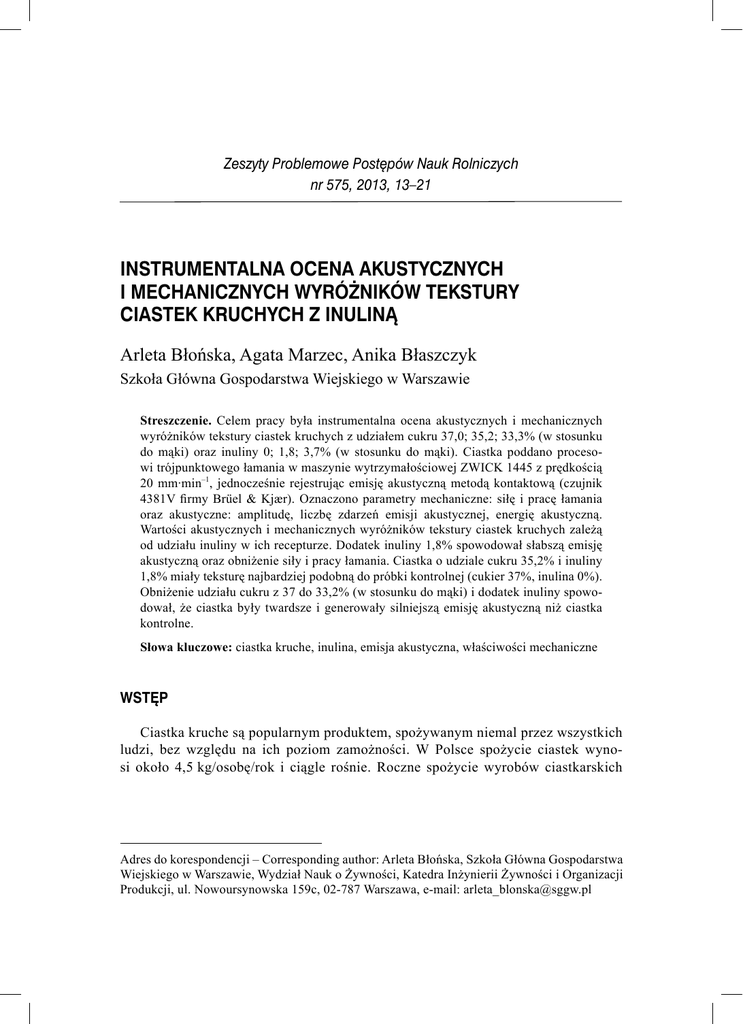 Zeszyty Problemowe Postępów Nauk Rolniczych nr 575, 2013, 13–21 INSTRUMENTALNA OCENA AKUSTYCZNYCH I MECHANICZNYCH WYRÓŻNIKÓW TEKSTURY CIASTEK KRUCHYCH Z INULINĄ Arleta Błońska, Agata Marzec, Anika Błaszczyk Szkoła Główna Gospodarstwa Wiejskiego w Warszawie Streszczenie. Celem pracy była instrumentalna ocena akustycznych i mechanicznych wyróżników tekstury ciastek kruchych z udziałem cukru 37,0; 35,2; 33,3% (w stosunku do mąki) oraz inuliny 0; 1,8; 3,7% (w stosunku do mąki). Ciastka poddano procesowi trójpunktowego łamania w maszynie wytrzymałościowej ZWICK 1445 z prędkością 20 mm·min–1, jednocześnie rejestrując emisję akustyczną metodą kontaktową (czujnik 4381V firmy Brüel & Kjær). Oznaczono parametry mechaniczne: siłę i pracę łamania oraz akustyczne: amplitudę, liczbę zdarzeń emisji akustycznej, energię akustyczną. Wartości akustycznych i mechanicznych wyróżników tekstury ciastek kruchych zależą od udziału inuliny w ich recepturze. Dodatek inuliny 1,8% spowodował słabszą emisję akustyczną oraz obniżenie siły i pracy łamania. Ciastka o udziale cukru 35,2% i inuliny 1,8% miały teksturę najbardziej podobną do próbki kontrolnej (cukier 37%, inulina 0%). Obniżenie udziału cukru z 37 do 33,2% (w stosunku do mąki) i dodatek inuliny spowodował, że ciastka były twardsze i generowały silniejszą emisję akustyczną niż ciastka kontrolne. Słowa kluczowe: ciastka kruche, inulina, emisja akustyczna, właściwości mechaniczne WSTĘP Ciastka kruche są popularnym produktem, spożywanym niemal przez wszystkich ludzi, bez względu na ich poziom zamożności. W Polsce spożycie ciastek wynosi około 4,5 kg/osobę/rok i ciągle rośnie. Roczne spożycie wyrobów ciastkarskich Adres do korespondencji – Corresponding author: Arleta Błońska, Szkoła Główna Gospodarstwa Wiejskiego w Warszawie, Wydział Nauk o Żywności, Katedra Inżynierii Żywności i Organizacji Produkcji, ul. Nowoursynowska 159c, 02-787 Warszawa, e-mail: [email protected] 14 A. Błońska, A. Marzec, A. Błaszczyk w Wielkiej Brytanii wynosi 11 kg, a w Irlandii 15 kg. Powszechna popularność ciastek spowodowana jest ich niską ceną, dobrą jakością odżywczą, dostępnością w różnych smakach oraz długim okresem trwałości. Ciastka kruche charakteryzują się dużą zawartością cukru i tłuszczu oraz niską wilgotnością na poziomie 1–5% [Chevallier i in. 2000]. Obecnie konsumenci oczekują żywności o zmniejszonej wartości kalorycznej. Reformulacja tradycyjnych produktów, takich jak ciastka kruche, może być użytecznym narzędziem do zapewnienia ludności zdrowszych przekąsek [Tarancón i in. 2013]. Jednak to pociąga za sobą zmiany właściwości strukturalnych i jakości sensorycznej. Tłuszcz w produktach ciastkarskich pełni wiele funkcji, nadaje i poprawia smak, wpływa na teksturę, intensyfikuje uczucie kruchości i percepcję produktu w czasie jedzenia [Zoulias i in. 2002]. Cukier natomiast pozwala na wprowadzenie powietrza do tłuszczu podczas przygotowania ciasta, zmniejsza także lepkość ciasta, zapewnia słodycz, wpływa na strukturę i teksturę gotowych wyrobów [Maache-Rezzoug i in. 1998]. Od zawartości cukru w ciastkach zależy ich twardość, kruchość i objętość. W wyrobach ciastkarskich najczęściej stosowana sacharoza może być zastąpiona substancjami słodzącymi, słodszymi i mniej kalorycznymi, takimi jak: sacharyna, acesulfam – K, aspartam. Cukier można również zastąpić tzw. wypełniaczem (na przykład maltodekstryną z sukralozą), który ma właściwości funkcjonalne oraz korzystnie wpływa na teksturę ciastek i ich smak [Savitha i in. 2008]. Ponadto, coraz częściej stosowane są prebiotyki, których przykładem jest inulina posiadająca różne właściwości technologiczne w zależności od struktury chemicznej. Inulina o krótkim łańcuchu jest rozpuszczalna, słodka i stosowana do częściowej zamiany sacharozy [Villegas i in. 2010]. Z kolei inulina o długim łańcuchu jest trudniej rozpuszczalna, bardziej lepka i może być stosowana do wytwarzania ciastek o obniżonej zawartości tłuszczu [Tárrega i in. 2011]. Inulina nie ulega trawieniu, stymuluje rozwój bifidobakterii i obniża poziom bakterii niekorzystnych w przewodzie pokarmowym, dlatego też stosowana jest na świecie jako składnik żywności funkcjonalnej [Kelly 2008]. Inulina zaliczana jest do składników rozpuszczalnego błonnika pokarmowego, który dociera w niezmienionej formie do jelita grubego, ponieważ nie jest trawiony w jelicie cienkim. Badania na szczurach wykazały, że zastosowanie diet zawierających fruktany (inuliny, oligofruktozy) spowodowało istotnie większą biodostępność wapnia i magnezu [Gibson i Rastall 2006]. Inulina stosowana w produkcji spożywczej pełni rolę czynnika teksturo- oraz strukturotwórczego, wpływającego pozytywnie na konsystencję i smarowność, podkreślającego smak i zapach produktu, a także stabilizującego emulsje i piany. Zastosowanie inuliny do produkcji wyrobów ciastkarskich pozwala na zmniejszenie ich kaloryczności, zwiększenie objętości i poprawę tekstury. Celem pracy była instrumentalna ocena akustycznych i mechanicznych wyróżników tekstury ciastek kruchych, w których tłuszcz częściowo zastąpiono inuliną. Zeszyty Problemowe Postępów Nauk Rolniczych Instrumentalna ocena akustycznych i mechanicznych wyróżników tekstury ciastek... 15 MATERIAŁ I METODY Materiał badany stanowiły ciastka kruche wypiekane w warunkach laboratoryjnych. Receptura próbki kontrolnej C1 pochodziła z warszawskiej cukierni. Ciastka zawierały w swoim składzie: mąkę pszenną typ 500 (wilgotność – 14%), margarynę (zawartość tłuszczu – 82%), cukier puder, śmietanę (zawartość tłuszczu – 36%), cukier wanilinowy, kwaśny węglan amonu oraz dodatek inuliny Orafti GR (tab. 1). Składniki sypkie przesiewano przez sito i za pomocą miksera Zelmer Symbiofitlin