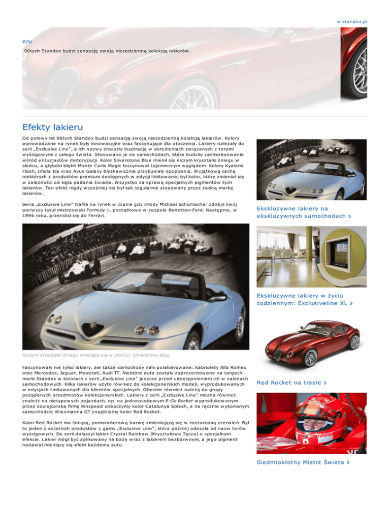 standox.pl kty lakieru połow y lat 90tych Standox budzi sensację sw oją niecodzienną kolekcją lakierów . Efekty lakieru Od połow y lat 90tych Standox budzi sensację sw oją niecodzienną kolekcją lakierów . Kolory w prow adzane na rynek były innow acyjne oraz fascynujące dla otoczenia. Lakiery należały do serii „Exclusive Line”, a ich nazw y znalazły inspirację w określeniach zw iązanych z torami w yścigow ymi z całego św iata. Stosow ano je na samochodach, które budziły zainteresow anie w śród entuzjastów motoryzacji. Kolor Silverstone Blue mienił się niczym kryształki śniegu w słońcu, a głęboki błękit Monte Carlo Magic fascynow ał tajemniczym w yglądem. Kolory Kyalami Flash, Imola Ice oraz Avus Galaxy błyskaw icznie przykuw ały spojrzenia. W yjątkow ą cechą niektórych z produktów premium dostępnych w edycji limitow anej był kolor, który zmieniał się w zależności od kąta padania św iatła. W szystko za spraw ą specjalnych pigmentów tych lakierów . Ten efekt nigdy w cześniej nie był tak regularnie stosow any przez żadną markę lakierów . Seria „Exclusive Line” trafiła na rynek w czasie gdy młody Michael Schumacher zdobył sw ój pierw szy tytuł mistrzow ski Formuły 1, początkow o w zespole Benetton-Ford. Następnie, w 1996 roku, przeniósł się do Ferrari. Ekskluzywne lakiery na ekskluzywnych samochodach Ekskluzywne lakiery w życiu codziennym: Exclusiveline XL Niczym kryształki śniegu mieniące się w słońcu: Silverstone Blue Fascynow ały nie tylko lakiery, ale także samochody nimi polakierow ane: kabriolety Alfa Romeo oraz Mercedes, Jaguar, Maserati, Audi TT. Niektóre auta zostały zaprezentow ane na targach marki Standox w kolorach z serii „Exclusive Line” jeszcze przed udostępnieniem ich w salonach samochodow ych. Kilka lakierów użyto rów nież do kolekcjonerskich modeli, w yprodukow anych w edycjach limitow anych dla klientów specjalnych. Obecnie rów nież należą do grupy pożądanych przedmiotów kolekcjonerskich. Lakiery z serii „Exclusive Line” można rów nież znaleźć na nietypow ych pojazdach, np. na jednoosobow ym E-Go Rocket w yprodukow anym przez szw ajcarską firmę Rinspeed zobaczymy kolor Catalunya Splash, a na ręcznie w ykonanym samochodzie W iesmanna GT znajdziemy kolor Red Rocket. Red Rocket na trasie Kolor Red Rocket ma lśniącą, pomarańczow ą barw ę zmieniającą się w rozżarzoną czerw ień. Był to jeden z ostatnich produktów z gamy „Exclusive Line”, która później odeszła od nazw torów w yścigow ych. Do serii dołączył lakier Crystal Rainbow (Kryształow a Tęcza) o specjalnym efekcie. Lakier mógł być aplikow any na bazę w raz z lakierem bezbarw nym, a jego pigment nadaw ał mieniący się efekt każdemu autu. Siedmiokrotny Mistrz Świata Ekskluzywne samochody i odważne kolory: Red Rocket Serią „Exclusive Line” szybko zainteresow ały się branże niezw iązane z motoryzacją, np. lakier Indianapolis Green znalazł zastosow anie na ekskluzyw nych piórach kulkow ych firmy Rotring. Następcą legendarnej serii nietypow ych lakierów jest „exclusiveline XL”. Do linii należy sześć odcieni, w tym: Magic Magenta, Atomic Orange oraz Python Green, które są stosow ane nie tylko do renow acji samochodów klasy premium, ale także do lakierow ania kasków motocyklow ych, mebli oraz stylow ych sprzętów kuchennych. Meble zaprojektowane przy użyciu ExclusivelineXL http://www.axaltacoatingsystems.com/content/standox_pl/pl_PL/60-years/exklusive-lackeffekte.html