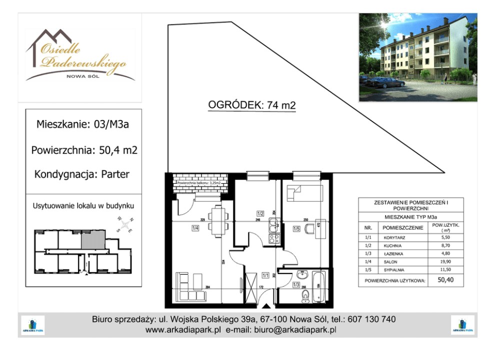 Mieszkanie: 03/M3a Powierzchnia: 50,4 m2 Kondygnacja: Parter Powierzchnia balkonu: 3,25m2 Usytuowanie lokalu w budynku 1/2 N W 1/5 E S 1/4 1/1 1/3 NR. 1/1 5,50 1/2 8,70 1/3 4,80 1/4 19,90 1/5 11,50 50,40