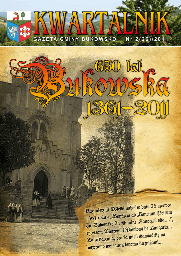 KWARTALNIK GAZETA GMINY BUKOWSKO Nr 2(26)/2011 Spis treści Radosne Alleluja ......................................3 Z podwórka ........................................4, 21 Patron Błogosławiony ..............................4 Tak Go postrzegamy ................................4 Gmina pod lupą .......................................5 Wieści z Regionu ............................... 5, 14 Magiczna noc............................................6 220 Rocznica Konstytucji ........................6 Żołnierze strzelają . ..................................7 Sukces „Bukowianki”...............................7 Szkolny Zespół Redakcyjny......................8 Maj – Miesiąc Eucharystyczny ................9 Kandydaci na kandydatów......................10 Odnowa wsi 2007 - 2013.........................10 Nasz Ojciec ............................................10 „Cosmos” to potęga................................11 Mała Ojczyzna – Bukowsko ............12, 13 Spotkanie nowych sołtysów . .................14 Expo Karpackie w Brukseli . .................14 Katyń .. Ocalić od zapomnienia........ 15, 16 Wierzbin 2011.........................................16 Dzień Dziecka na sportowo ...................16 Rękodzieło i rosyjska piosenka . ............17 Kolejny samochód z Francji....................18 Wspomnienia wojenne L. Cieśli ............18 Przyszli wyborcy z wizytą . ...................19 Coś o Ali Chrząszcz ..............................19 Mega Moto Rady....................................19 Dziecko zdolne w szkole.........................20 Kapliczki i krzyże...................................21 Myszy i krokodyle w bibliotece .............22 Podziękowanie .......................................22 Korespondencye .....................................22 Humor.....................................................23 Krzyżówka nr 26 ...................................23 Jubileusz 650-lecia Bukowska profesor Feliks Kiryk 650 lecie to jubileusz doniosły zarówno dla parafii, jak i całego Bukowska. W tym dniu profesor Feliks Kiryk kolejny raz przybliży nam karty historii Bukowska i okolic. Rada Gminy Bukowsko nada profesorowi tytuł Honorowego Obywatela Gminy Bukowsko. Szczegóły obchodów jubileuszu przedstawia załączony afisz i informacje na stronach internetowych. Moto Piknik w Nadolanach Sympatycy rozwianych włosów, symbolu wolności i czaru dwóch kółek mają kolejną szansę na ciekawe spotkanie w gronie pasjonatów. W tym roku 23 lipca o godzinie 12.00 na „Zielonej Wyspie” w Nadolanach odbędzie się drugi zjazd motorów. Strażacy zapraszają 14 sierpnia br. strażacy z Nadolan obchodzić będą 125 rocznicę założenia jednostki Ochotniczej Straży Pożarnej. Wola Sękowa zaprasza 21 sierpnia na zawody bojowe gminnych jednostek OSP. Również w sierpniu Święto Wojska Polskiego i tradycyjne formy rywalizacji. Uniwersytet w Woli Sękowej W okresie wakacji od 20 do 31 lipca prowadzone będą bezpłatne zajęcia artystyczne dla dzieci z terenu Gminy Bukowsko. Od 4 do 13 sierpnia w Uniwersytecie odbędzie się kolejna, Międzynarodowa Akcja Artyści Naturze, poświęcona tym razem formom użytkowym w sztuce. 650 lat Bukowska 2 KWARTALNIK Nowy obiekt w Nowotańcu Pierwszego września, w dniu inauguracji roku szkolnego, Zespół Szkół w Nowotańcu wzbogaci się o nowe obiekty szkolne w tym szczególnie oczekiwaną salę gimnastyczną z zapleczem sanitarnym, izbę pamięci i nowe pomieszczenia. Jan Muszański Radosne Alleluja W ielkanoc to święto radości, na które oczekujemy i czynimy starania, aby miało jak najlepszą oprawę. W tę świąteczną atmosferę Wielkiej Nocy wprowadziła nas społeczność szkolna Zespołu Szkół w Nowotańcu, która wspólnie z Biurem Promocji Gminy Bukowsko zorganizowała spotkanie pt. Wielkanocne zwyczaje i obrzędy połączone z wystawą wielkanocną, kiermaszem ozdób świątecznych oraz degustacją wybranych potraw wielkanocnych. Ważnym punktem spotkania było rozstrzygniecie konkursu na najpiękniejszą palmę, którą uczniowie przygotowywali wspólnie z nauczycielem, rodzicami, a nawet dziadkami. Każda klasa biorąca udział w konkursie otrzymała nagrodę pocieszenia w postaci kosza pełnego słodyczy. Zwycięzcy zaś otrzymali dofinansowanie do wycieczki w wysokości 500 złotych ufundowane przez Dyrektora Zespołu Szkół w Nowotańcu. To uroczyste spotkanie było efektem współpracy szkoły ze środowiskiem, instytucjami działającymi na terenie naszej gminy, jak również prywatnymi osobami chętnymi do prezentowania wytworów rękodzieła artystycznego. Dopełnieniem tematycznym była inscenizacja przygotowana pod kierunkiem pani Sylwii Wójcik, w której nawiązano do motywu dawnych, bo XVIII i XIX wiecznych zwyczajów związanych z okresem Wielkiego Postu oraz obchodów kolejnych dni Wielkiego Tygodnia. W inscenizacji nie zabrakło atrybutów charakterystycznych dla świąt Wielkiej Nocy - były palmy, pisanki i święconka w koszyku. Wiele miejsca poświęcono Wielkanocnemu Poniedziałkowi i zmieniającej się przez wieki tradycji oblewania wodą. Na scenie zaprezentowano również tradycyjne sposoby zdobienia stołu i mieszkania w tym świątecznym okresie, by zachować niepowtarzalny, polski charakter tych świąt. Nie zabrakło również, często zapomnianych, przyśpiewek ludowych i opowieści o świątecznych zwyczajach. Spotkaniu towarzyszył wspomniany już kiermasz ozdób świątecznych połączony z wystawą wielkanocną, na którym królowały kraszanki i ozdo- Najmłodsi z Bukowska Stół świąteczny w Nowotańcu bione różnymi technikami pisanki. Były też wykonane przez uczniów palmy, stroiki, koszyki papierowe, wiklinowe i szydełkowe, pieczone i gipsowe barany wielkanocne, witraże, kompozycje wiosennych kwiatów z bibuły. Trudno było oprzeć się cudeńkom przygotowanym przez zręczne ręce młodszych i starszych twórców, toteż kiermaszowe stoiska z ozdobami szybko