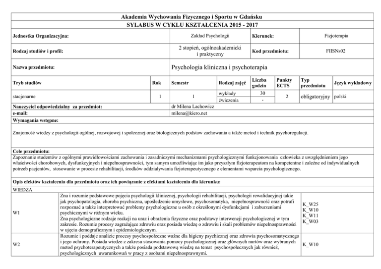 Akademia Wychowania Fizycznego i Sportu w Gdańsku SYLABUS W CYKLU KSZTAŁCENIA 2015 - 2017 Zakład Psychologii Jednostka Organizacyjna: 2 stopień, ogólnoakademicki i praktyczny Rodzaj studiów i profil: Fizjoterapia Kierunek: FIISNs02 Kod przedmiotu: Psychologia kliniczna i psychoterapia Nazwa przedmiotu: Tryb studiów Rok stacjonarne 1 Nauczyciel odpowiedzialny za przedmiot: e-mail: Wymagania wstępne: Semestr Rodzaj zajęć 1 wykłady ćwiczenia Liczba godzin 30 - Punkty ECTS 2 Typ przedmiotu Język wykładowy obligatoryjny polski dr Milena Lachowicz [email protected] Znajomość wiedzy z psychologii ogólnej, rozwojowej i społecznej oraz biologicznych podstaw zachowania a także metod i technik psychoregulacji. Cele przedmiotu: Zapoznanie studentów z ogólnymi prawidłowościami zachowania i zasadniczymi mechanizmami psychologicznymi funkcjonowania człowieka z uwzględnieniem jego właściwości chorobowych, dysfunkcyjnych i niepełnosprawności, tym samym umożliwiając im jako przyszłym fizjoterapeutom na kompetentne i zależne od indywidualnych potrzeb pacjentów, stosowanie w procesie rehabilitacji, środków oddziaływania fizjoterapeutycznego z elementami wsparcia psychologicznego. Opis efektów kształcenia dla przedmiotu oraz ich powiązanie z efektami kształcenia dla kierunku: WIEDZA W1 W2 Zna i rozumie podstawowe pojęcia psychologii klinicznej, psychologii rehabilitacji, psychologii rewalidacyjnej takie jak psychopatologia, choroba psychiczna, upośledzenie umysłowe, psychosomatyka, niepełnosprawność oraz potrafi rozpoznać a także interpretować problemy psychologiczne u osób z określonymi dysfunkcjami i zaburzeniami psychicznymi w różnym wieku. Zna psychologiczne rodzaje reakcji na uraz i obrażenia fizyczne oraz podstawy interwencji psychologicznej w tym zakresie. Rozumie procesy zagrażające zdrowiu oraz posiada wiedzę o zdrowiu i skali problemów niepełnosprawności w ujęciu demograficznym i epidemiologicznym. Rozumie i poddaje analizie procesy psychospołeczne ważne dla higieny psychicznej oraz zdrowia psychosomatycznego i jego ochrony. Posiada wiedze z zakresu stosowania pomocy psychologicznej oraz głównych nurtów oraz wybranych metod psychoterapeutycznych a także posiada podstawową wiedzę na temat psychospołecznych jak również, psychologicznych uwarunkowań w pracy z osobami niepełnosprawnymi. K_W25 K_W10 K_W11 K_W03 K_W10 W3 Rozumie i potrafi scharakteryzować oraz wyjaśnić założenia edukacji zdrowotnej, promocji zdrowia i profilaktyki niepełnosprawności. Zna i potrafi interpretować zasady etyczne obowiązujące w pracy z pacjentem i w zespole. K_W17 K_W28 UMIEJĘTNOŚCI U1 U2 U3 U4 Potrafi nawiązać relacje społeczne ze specjalistami innych dziedzin oraz pacjentami, w sposób prawidłowy posługując się skutecznie dostępnymi kanałami komunikacji a także korzystając z nowoczesnych rozwiązań komunikacyjnych. K_U01, Potrafi dobierać odpowiednie środki ekspresji werbalnej i cielesnej w pracy z pacjentem. K_U05 Potrafi dostrzec i zrozumieć oraz uszanować dodatkowe uwarunkowania kulturowe, religijne i etniczne problemy K_U06 pacjenta w programowaniu usprawniania. Posiada umiejętność dostrzegania i rozpoznawania problemów psychologicznych oraz zaburzeń psychicznych u osób z różnymi dysfunkcjami i w różnym wieku a także ocenić ich wpływ na przebieg i skuteczność rehabilitacji. Posiada umiejętność wykorzystywania podstawowej wiedzy z psychologii klinicznej i psychoterapii. Posiada umiejętność inicjowania, organizowania i realizowania działań ukierunkowanych na edukację zdrowotną, promocję zdrowia i profilaktykę niepełnosprawności. Potrafi wzbudzić i kształtować u pacjentów zainteresowanie aktywnością ruchową i czynnym wypoczynkiem. Potrafi przygotować wniosek o zgodę komisji bioetycznych na prowadzenie badań naukowych. K_U21 K_U05 K_U13 KOMPETENCJE K1 K2 Jest świadomy potrzeby do uzupełniania i doskonalenia kwalifikacji - potrafi samodzielnie zdobywać wiedzę i umiejętności w zakresie wybranej specjalności zawodowej z wykorzystaniem wiarygodnych i efektywnych źródeł i metod. Rozumie potrzebę uczenia się przez całe życie. Okazuje dbałość o prestiż związany z wykonywaniem zawodu i właściwie pojętą solidarność zawodową. Prawidłowo identyfikuje , okazuje tolerancje i akceptuje postawy i zachowania pacjentów wynikające z odmiennych uwarunkowań kulturowych, religijnych, społecznych i ich wieku, przestrzega właściwe relacje z pacjentem, z rodziną pacjenta, z najbliższym otoczeniem i społeczeństwem. Okazuje szacunek wobec pacjenta oraz dba o jego dobro . K_K02 K_K03 Wykazuje inicjatywę i kreatywność w działaniu zawodowym. Potrafi określić priorytety i przestrzega zasady etyczne w K_K04 decyzjach i działaniach podejmowanych w stosunku do pacjenta, K_K05 Potrafi przestrzegać zasad etycznych obowiązujących w badaniach naukowych i w pracach autorskich. Kryteria i metody oceny osiągniętych efektów kształcenia: W1: dyskusja, obserwacja W2: dyskusja, W3: dyskusja U1: dyskusja, obserwacja jawna nieuczestnicząca, U2: dyskusja, obserwacja jawna nieuczestnicząca, egzamin U3: dyskusja, obserwacja jawna nieuczestnicząca U4: dyskusja, obserwacja jawna nieuczestnicząca K1: dyskusja K2: studium przypadku, odgrywanie ról- ocena eksperta składa się ze zgodności ze standardem, innowacyjności, oraz poprawności merytorycznej eksperta, dyskusja, obserwacja jawna nieuczestnicząca. Przy ocenianiu efektów kształcenia pod uwagę brane są: aktywność na zajęciach, aktywność, poprawność merytoryczna i oryginalność w poszukiwaniu, a także prezentacja rozwiązania studium przypadków realizowanych w trakcie zajęć. Ustalenie oceny zaliczeniowej na podstawie ocen cząstkowych otrzymywanych w trakcie trwania semestru za określone wyżej wymienione działania pracy studenta. Aby uzyskać zaliczenie przedmiotu na ocenę dostateczną student musi osi