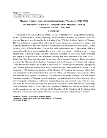 Zbigniew Tucholski Instytut Historii Nauki PAN, Warszawa [Institute for the History of Science PAS] Muzeum Kolejowe oraz Muzeum Komunikacji w Warszawie (1928-1939) The Museum of the Railway Transport and the Museum of the City Transport in Warsaw (1928-1939) SUMMARY The article deals with the history of the Museum of the Railway Transport that was founded on 18 February 1928. At the beginning, the institution established by a decree of the Minister of Transport was located in the left wing of the Wileński Railway Station in Warsaw. The first exhibition comprised the following divisions: historical, contemporary, general and scientific-informative. The first curator of the museum was the Stanisław Witoszyński. As the building of the Wileński Railway Station had to be pulled down, on 13 December 1931, the museum’s collections were transferred to a new – also provisional – building at the 1, Nowy Zjazd Street. In the following years, the collections expanded but they could not be exhibited any longer in the provisional, non-functional building they were housed in at the time. In 1937, Władysław Woydyno was appointed for the post of the museum’s curator. There were plans to merge the Museum of the Railway Transport with the Museum of Technics and Industry – both institutions were to be located in the Palace of Technology and Industry, a project of Prof. Bohdan Pniewski that had been never realized because of the outbreak of the war. On 14 December 1938, basing on a decision of the Minister of Transport, the Museum of the Railway Transport was transformed into the Museum of the City Transport. New divisions of the new museum were opened: a waterways’ division and a highways’ division. The war and the German occupation of Warsaw caused an almost complete destruction of the Museum of the City Transport’s collections, collections of great historical and material value. The few exhibits from the pre-war museum are now part of the collections of the Museum of Technology NOT in Warsaw (NOT in Polish: Naczelna Organizacja Techniczna, in English: Main Technical Organization), as well as of those of the Chamber of the Tradition of the Engineering School in Warsaw and those of the Railway Museum (Muzeum Kolejnictwa) in Warsaw. Analecta – Studia i Materiały z Dziejów Nauki [Analecta – Studies and Materials on the History of Science] XXI, 2011, 2, 143-171