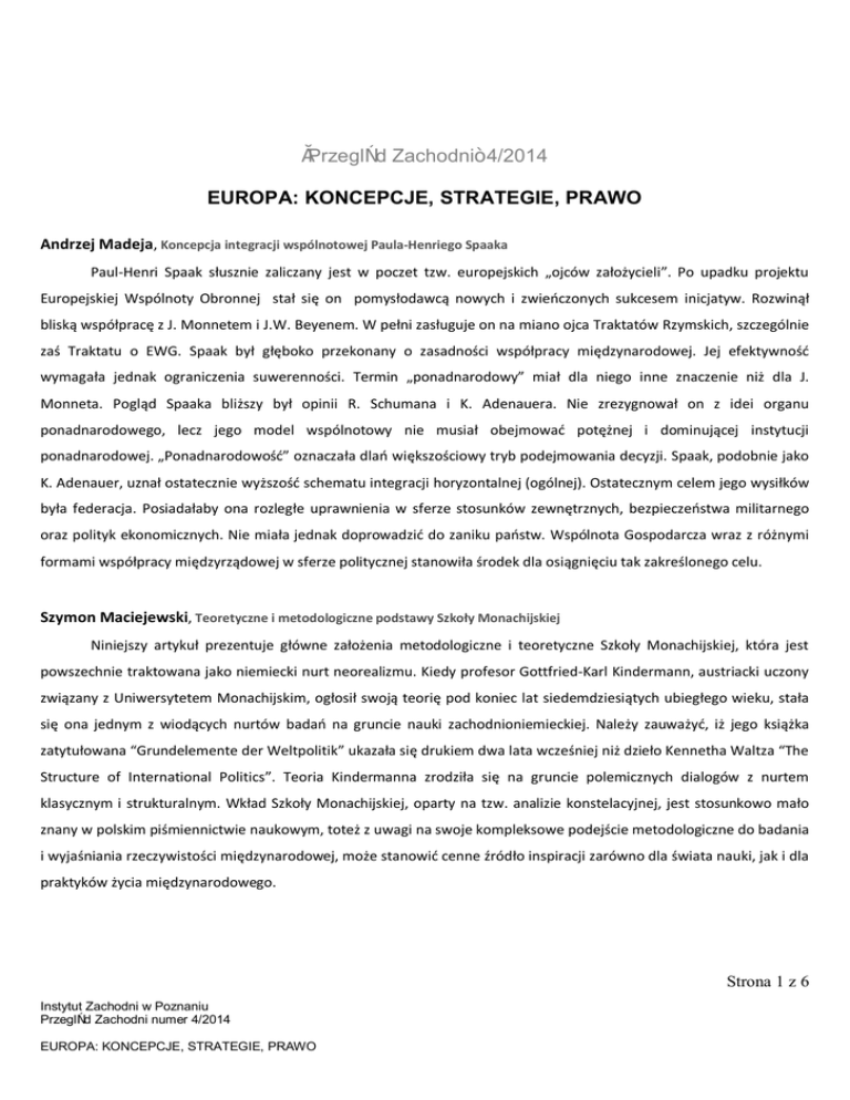 „Przegląd Zachodni” 4/2014 EUROPA: KONCEPCJE, STRATEGIE, PRAWO Andrzej Madeja, Koncepcja integracji wspólnotowej Paula-Henriego Spaaka Paul-Henri Spaak słusznie zaliczany jest w poczet tzw. europejskich „ojców założycieli”. Po upadku projektu Europejskiej Wspólnoty Obronnej stał się on pomysłodawcą nowych i zwieńczonych sukcesem inicjatyw. Rozwinął bliską współpracę z J. Monnetem i J.W. Beyenem. W pełni zasługuje on na miano ojca Traktatów Rzymskich, szczególnie zaś Traktatu o EWG. Spaak był głęboko przekonany o zasadności współpracy międzynarodowej. Jej efektywność wymagała jednak ograniczenia suwerenności. Termin „ponadnarodowy” miał dla niego inne znaczenie niż dla J. Monneta. Pogląd Spaaka bliższy był opinii R. Schumana i K. Adenauera. Nie zrezygnował on z idei organu ponadnarodowego, lecz jego model wspólnotowy nie musiał obejmować potężnej i dominującej instytucji ponadnarodowej. „Ponadnarodowość” oznaczała dlań większościowy tryb podejmowania decyzji. Spaak, podobnie jako K. Adenauer, uznał ostatecznie wyższość schematu integracji horyzontalnej (ogólnej). Ostatecznym celem jego wysiłków była federacja. Posiadałaby ona rozległe uprawnienia w sferze stosunków zewnętrznych, bezpieczeństwa militarnego oraz polityk ekonomicznych. Nie miała jednak doprowadzić do zaniku państw. Wspólnota Gospodarcza wraz z różnymi formami współpracy międzyrządowej w sferze politycznej stanowiła środek dla osiągnięciu tak zakreślonego celu. Szymon Maciejewski, Teoretyczne i metodologiczne podstawy Szkoły Monachijskiej Niniejszy artykuł prezentuje główne założenia metodologiczne i teoretyczne Szkoły Monachijskiej, która jest powszechnie traktowana jako niemiecki nurt neorealizmu. Kiedy profesor Gottfried-Karl Kindermann, austriacki uczony związany z Uniwersytetem Monachijskim, ogłosił swoją teorię pod koniec lat siedemdziesiątych ubiegłego wieku, stała się ona jednym z wiodących nurtów badań na gruncie nauki zachodnioniemieckiej. Należy zauważyć, iż jego książka zatytułowana “Grundelemente der Weltpolitik” ukazała się drukiem dwa lata wcześniej niż dzieło Kennetha Waltza “The Structure of International Politics”. Teoria Kindermanna zrodziła się na gruncie polemicznych dialogów z nurtem klasycznym i strukturalnym. Wkład Szkoły Monachijskiej, oparty na tzw. analizie konstelacyjnej, jest stosunkowo mało znany w polskim piśmiennictwie naukowym, toteż z uwagi na swoje kompleksowe podejście metodologiczne do badania i wyjaśniania rzeczywistości międzynarodowej, może stanowić cenne źródło inspiracji zarówno dla świata nauki, jak i dla praktyków życia międzynarodowego. Strona 1 z 6 Instytut Zachodni w Poznaniu Przegląd Zachodni numer 4/2014 EUROPA: KONCEPCJE, STRATEGIE, PRAWO Anna Moraczewska, Wymiar Wschodni Europejskiej Polityki Sąsiedztwa jako strategia zarządzania ryzykiem Artykuł jest próbą analizy Europejskiej Polityki Sąsiedztwa UE i jej wymiaru wschodniego przy pomocy metody związanej z analizą ryzyka. Unia Europejska jest ujęta bardziej jako podmiot międzynarodowych stosunków gospodarczych niż politycznych, zorientowany na maksymalizację zysków i minimalizację strat. Zakłada się, że wypracowanie instrumentu wielostronnej współpracy regionalnej wobec obszaru Europy Wschodniej, na którym istotnym i ryzykownym graczem pozostaje Rosja, oparte zostało na mechanizmach zarządzania ryzykiem. Nie jest ono traktowane jako akt jednorazowy, ale proces, który wymaga ciągłej weryfikacji lub potwierdzania przyjętych metod w oparciu o uzyskane efekty tego zarządzania oraz nowe wyzwania stawiane przez środowisko międzynarodowe. Dodatkowo, konflikt zbrojny między Ukrainą (objętą Europejską Polityką Sąsiedztwa) i Rosją w 2014 r. potwierdził występowanie wysokiego poziomu ryzyka na tym obszarze, wpłynął na decyzje Unii Europejskiej dotyczące stosunków gospodarczych z Rosją oraz przyniósł znaczące straty dla rynku europejskiego, wobec których należało wypracować kolejne strategie zarządzania ryzykiem. Larysa Leszczenko, Rola Europejskiego Trybunału Praw Człowieka w ochronie praw ofiar konfliktów zbrojnych na obszarze proradzieckim Celem artykułu jest próba zwrócenia uwagi na problem wyegzekwowania naruszonych praw i wolności ofiar konfliktów zbrojnych na terenie poradzieckim. Przystąpienie sześciu państw poradzieckich do Rady Europy na przełomie XX i XXI w. umożliwiło w pełni obywatelom tych państw, jak również osobom przebywającym na ich terenie, zrealizowanie prawa do podmiotowości prawnej. Ze względu na brak skutecznych krajowych instrumentów prawnych umożliwiających dochodzenie swoich praw i wolności od państwa, ofiary niemiędzynarodowych konfliktów zbrojnych składają pozwy do Europejskiego Trybunału Praw Człowieka, zaskarżając w nich państwa, które nie gwarantują przestrzegania praw i wolności obywatelskich oraz politycznych. Mimo iż ETPCz nie ma kompetencji trybunału do spraw zbrodni wojennych lub zbrodni przeciwko ludzkości, zajmuje się on kwestiami naruszeń praw i wolności człowieka, które uznawane są za fundamentalne. Słabe zainteresowanie państw poradzieckich współpracą z Międzynarodowym Trybunałem Karnym powoduje, że w najbliższych latach Europejski Trybunał Praw Człowieka pozostanie jedyną skuteczną międzynarodową instytucją sądową mającą wpływ na poprawę sytuacji ofiar konfliktów zbrojnych na terenie poradzieckim. Strona 2 z 6 Instytut Zachodni w Poznaniu Przegląd Zachodni numer 4/2014 EUROPA: KONCEPCJE, STRATEGIE, PRAWO Dariusz Wybranowski, Geneza i uwarunkowania procesu przekształcania na przełomie lat 60. i 70. XX wieku wspólnoty muzułmanów z Bośniw Muzułmanów - „konstytucyjny naród” Jugosławii Głównymi celami niniejszego artykułu jest ukazanie procesów i przyczyn, które doprowadziły do powstania wśród muzułm