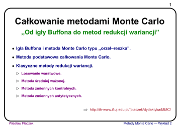 1 Całkowanie metodami Monte Carlo ,,Od igły Buffona do metod redukcji wariancji” • Igła Buffona i metoda Monte Carlo typu ,,orzeł–reszka”. • Metoda podstawowa całkowania Monte Carlo. • Klasyczne metody redukcji wariancji. ⊲ Losowanie warstwowe. ⊲ Metoda średniej ważonej. ⊲ Metoda zmiennych kontrolnych. ⊲ Metoda zmiennych antytetycznych. ⇒ http://th-www.if.uj.edu.pl/˜placzek/dydaktyka/MMC/ Wiesław Płaczek Metody Monte Carlo — Wykład 2 Igła Buffona i szacowanie liczby π 2 ◮ Igła Buffona (Buffon 1777, Laplace 1806): Igłe֒ o długości l rzucamy losowo na pozioma֒ płaszczyzne֒ pokryta֒ równoległymi liniami prostymi o odstepie L ֒ (L ≥ l). Jeżeli rzucona igła przetnie linie, ֒ to liczymy ,,trafienie”, w przeciwnym wypadku liczymy ,,chybienie”. Przez zliczanie trafień i chybień wyznaczyć wartość liczby π . Eksperyment: Teoria: L l x n – liczba trafień, N – liczba prób (,,trafienia” + ,,chybienia”) ⊲ Prawo wielkich liczb (PWL): Wiesław Płaczek x – kat֒ miedzy igła֒ a normalna֒ do linii, x ∈ U(0, π), ֒ ⇒ funkcja gestości prawdopodobieństwa zmiennej x: ֒ 1 ρ(x) = , π p(x) – prawdopodob. ,,trafienia” dla danej wartości x: l p(x) = | cos x| , L ⇒ Całkowite prawdopodobieństwo ,,trafienia”: Z π 2l . P = E[p(x)] = p(x)ρ(x)dx = πL 0 P̂ = n −→ N N →∞ P = 2l πL =⇒ π̂ = 2N l −→ nL N →∞ π . Metody Monte Carlo — Wykład 2 Igła Buffona – modelowanie Monte Carlo • Monte Carlo typu ,,orzeł–reszka” Dzieku symetrii p(x) bierzemy: ֒ ⊲ Algorytm: 0<x< Generujemy równomiernie dwie zmienne: (x, y) : 0 < x < π2 i 0 < y < 1. ≤ p(x) : trafienie , y > p(x) : chybienie . 3 π 2. y1 p(x) 0.9 0.8 chybienie 0.7 0.6 0.5 trafienie 0.4 0.3 0.2 0.1 0 0 0.2 0.4 0.6 0.8 1 1.2 1.4 x w(x, y) = Θ(p(x) − y), gdzie: Θ(z) = 0 dla z < 0 i Θ(z) = 1 dla z ≥ 0 (funkcja schodkowa). Zdefiniujmy funkcje֒ wagowa: ֒ ⊲ Funkcja gestości prawdopodobieństwa: ̺(x, y) = ρ(x)g(y) = ֒ 2 π · 1. ⇒ Całkowite prawdopodobieństwo: Z N n 2l 1 X w(xi , yi ) = P = E(w) = w(x, y)̺(x, y)dxdy = ←− P̂ = . πL N →∞ N i=1 N ⇒ Odchylenie standardowe estymatora Monte Carlo P̂ : r p n n 1 1 1− . σ=√ P (1 − P ) ←− σ̂ = √ N →∞ N N N −1 N Wiesław Płaczek Metody Monte Carlo — Wykład 2 Igła Buffona – Monte Carlo typu ,,orzeł–reszka” 4 Szacowanie prawdopodobieństwa (całki) jako stosunku liczby trafień (sukcesów) do liczby prób losowych nazywa sie֒ metoda֒ ,,orzeł–reszka” (,,sukces–porażka”; ang. ‘hit–or–miss’). • Jaka jest oczekiwana dokładność po N próbach? n – liczba trafień spełnia rozkład dwumianowy (Bernoulliego). ◮ Rozkład dwumianowy: N P(n) = P n (1 − P )N −n , n n = 0, 1, . . . , N, P – prawdopodobieństwo sukcesu, N – liczba prób. ⊲ Wartość oczekiwana: E(n) = N P , V (n) = N P (1 − P ) . ⊲ Wariancja: gdzie: ◮ ,,Igła Buffona” – wartość oczekiwana i wariancja estymatora MC prawdopodobieństwa P : E(P̂ ) = P , P (1 − P ) . V (P̂ ) = N ⇛ Ćw. A9: Pokazać powyższe. Wiesław Płaczek Metody Monte Carlo — Wykład 2 Efektywność metody ,,orzeł–reszka” ,,Igła Buffona”: niech l 5 = L (dla prostoty) ◮ Estymator MC liczby π i jego odchylenie standardowe (teoretyczne): r 2N 1 π , σ(π̂) = √ π − 1. π̂ = n 2 N ⇛ Ćw. A10: Pokazać powyższe. 2.374 orzeł-reszka =⇒ σπ̂ ≃ √ N ⊲ To znaczy, że niepewność oszacowania liczby π jest: po po po 100 10 000 1 000 000 próbach: próbach: próbach: 0.2374 0.0237 0.0024 → Te niedokładności sa֒ bardzo duże! Czy możemy to poprawić? ⇛ Ćw. N2.1: Wykonać komputerowe modelowanie problemu ,,igły Buffona”. Wyznaczać wartość liczby π metoda֒ ,,orzeł–reszka” i wyliczac jej teoretyczne oraz praktyczne odchylenie standardowe. Obserwować zbieżność wyników do dokładnej wartości dla rosnacej liczby prób. ֒ Wiesław Płaczek Metody Monte Carlo — Wykład 2 Igła Buffona – metoda podstawowa Monte Carlo 6 • Podstawa: prawo wielkich liczb (PWL) Z b N X 1 1 f (xi ) −→ f (x) dx = E(f ) N →∞ b − a a N i=1 p 1 ◮ Odchylenie standardowe (teoretyczne): σ = √N [E(f 2 ) − E 2 (f )] . Zdefiniujmy: w(x) = p(x) = l L ⊲ Na podstawie PWL mamy: Z Z P = w(x)ρ(x)dx = cos x i generujmy x równomiernie w przedziale (0, π2 ). π/2 2l 2 l cos x dx = L π πL 0 ⊲ Odchylenie standardowe estymatora MC liczby π dla l = L: 1.52 σπ̂P ≃ √ N = N →∞ N 1 X w(xi ). N i=1 ⇛ Ćw. A11: Pokazać. Metoda Monte Carlo szacowania całki w oparciu o prawo wielkich liczb nazywa sie֒ metoda֒ podstawowa֒ Monte Carlo (ang. crude Monte Carlo). → Metoda podstawowa Monte Carlo jest bardziej wydajna niż metoda ,,orzeł–reszka”! ◮ Ale metoda ,,orzeł–reszka” daje przypadki nieważone (tzn. ze stała֒ waga֒ = 1), podczas gdy metoda podstawowa daje przypadki ważone (tzn. ze zmienna֒ waga)! ֒ Wiesław Płaczek Metody Monte Carlo — Wykład 2 Metoda podstawowa a metoda ,,orzeł–reszka” 7 • Twierdzenie: Metoda podstawowa Monte Carlo nie jest nigdy mniej wydajna niż metoda ,,orzeł–reszka”! ◮ Dowód: R1 Niech I = 0 f (x)dx i 0 ≤ f (x) ≤ 1 (dla prostoty). ⊲ Wariancja dla metody ,,orzeł–reszka”: V (IˆOR ) = N1 (I − I 2 ) , hR i 1 2 2 f (x) dx − I , ⊲ Wariancja dla metody podstawowej: V (IˆP ) = N1 0 h i R R1 1 1 1 2 ˆ ˆ ⇒ V (IOR ) − V (IP ) = N I − 0 f (x) dx = N 0 f (x)[1 − f (x)] dx ≥ 0. (c.n.d.) → V (IˆOR ) − V (IˆP ) = 0 tylko gdy f (x) ≡ 0 lub f (x) ≡ 1, czyli dla funkcji schodkowej. ⇛ Ćw. N2.2: Używajac ֒ metody ”orzeł–reszka” oraz metody podstawowej MC policzyć całki: Z 1 Z 1 2 1 −x Φ= φ(x) dx , φ(x) = √ e 2 ; Φ ≃ 0.341345, φ2 (x)dx ≃ 0.118861 , 2π 0 0 Z Z 1p 1 − (x2 + y 2 ) . Ψ= ψ(x, y) dxdy , ψ(x, y) = 4 x2 +y 2 ≤1 Wyznaczyć teoretyczne i praktyczne odchylenia standardowe dla obu tych całek. Porówna