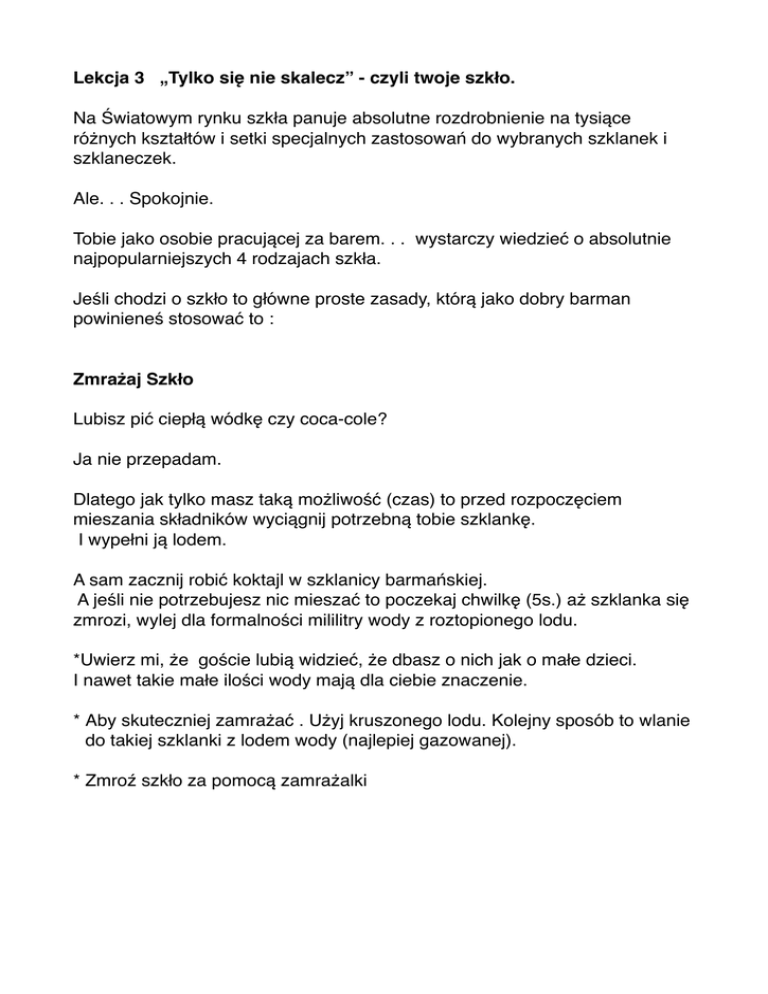 Lekcja 3 „Tylko się nie skalecz” - czyli twoje szkło. Na Światowym rynku szkła panuje absolutne rozdrobnienie na tysiące różnych kształtów i setki specjalnych zastosowań do wybranych szklanek i szklaneczek. Ale. . . Spokojnie. Tobie jako osobie pracującej za barem. . . wystarczy wiedzieć o absolutnie najpopularniejszych 4 rodzajach szkła. Jeśli chodzi o szkło to główne proste zasady, którą jako dobry barman powinieneś stosować to : Zmrażaj Szkło Lubisz pić ciepłą wódkę czy coca-cole? Ja nie przepadam. Dlatego jak tylko masz taką możliwość (czas) to przed rozpoczęciem mieszania składników wyciągnij potrzebną tobie szklankę. I wypełni ją lodem. A sam zacznij robić koktajl w szklanicy barmańskiej. A jeśli nie potrzebujesz nic mieszać to poczekaj chwilkę (5s.) aż szklanka się zmrozi, wylej dla formalności mililitry wody z roztopionego lodu. *Uwierz mi, że goście lubią widzieć, że dbasz o nich jak o małe dzieci. I nawet takie małe ilości wody mają dla ciebie znaczenie. * Aby skuteczniej zamrażać . Użyj kruszonego lodu. Kolejny sposób to wlanie do takiej szklanki z lodem wody (najlepiej gazowanej). * Zmroź szkło za pomocą zamrażalki Myj ostrożnie Może to śmieszne ale warto dbać o każdy szczegół. A jeśli będziesz stał nad zmywakiem i miał ambitne zadanie wyszorować wszystkie szklanki. To zachowaj ostrożność i rób to delikatnie z gracją jak księżniczka;-) * Spokojnie. Często nie dowiesz się jak to jest myć 10230 szklanek bo są. Zmywarki. Uff odetchnijmy z ulgą i podziękujmy . . . Gdzie z tymi paluchami ! Tych słów często używała moja mama gdy jako mały chłopiec. Nie mogąc się doczekać zaczynałem nikczemną degustację pysznego ciasta swoim najdłuższym palcem. Jeśli ty też tak robisz to pewnie wiesz , że ślady twoich czynów pozostają. I dla innych może być niesmaczne jeść kawałek ciasta z twoim unikalnym odciskiem palca. I tutaj wskazówka dla Ciebie. Kiedy obchodzisz się z szklanką gdzie zamierzać zrobić pyszny koktajl dla twojego gościa. To staraj się trzymać tą szklankę jak najniżej aby nie pozostawiać niesmacznych śladów. *Trzymaj szkło jak najniżej. Ważne abyś znał też podstawowe zasady. Jakie koktajle w jakim szkle aby później nie było awantur od najmądrzejszych gości, którzy krzyczą na cały lokal. „To grzech podawać Martini w Old Fashioned” Gość Majki Czterech Nie koniecznie pancernych Old Fashioned (niskie szkło) Podajesz w nim „średnie proste drinki” ( z małą ilością składników) ale głównie możesz je kojarzyć z serwowaniem whisky, bourbonem, koniakiem, armaniakiem i calvadosem. Czyli z „szlachetniejszymi” alkoholami najczęściej z lodem lub samotnie. Highball / Collins / Long drink(wysokie szkło) Szkło o dużej pojemności do long drinków na przykład Cuba Libre, Tequila Sunrise, Sex on the Beach, Coca Coli. Koktajlówka / Margarita Idealne szkło do klasycznych koktajli serwowanych bez lodu! Między innymi do Martini , Margarita , Daiquri . . . *Łatwo o stłuczkę! ( rozbijcie podczas intensywnego mycia.) Kieliszek do wódki / shot Shot czyli specjalne szkło do koktajli o wskazaniu szybkiej konsumpcji. Na przykład do kamikaze, rainbow, B52, banana shot i do samotnych mocnych alkoholi a także likierów . . .