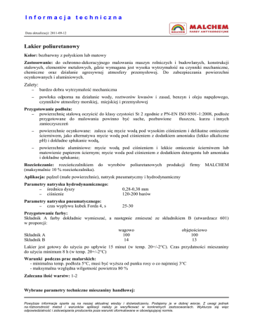 Informacja techniczna Data aktualizacji: 2011-09-12 Lakier poliuretanowy Kolor: bezbarwny z połyskiem lub matowy Zastosowanie: do ochronno-dekoracyjnego malowania maszyn rolniczych i budowlanych, konstrukcji stalowych, elementów metalowych, gdzie wymagana jest wysoka wytrzymałość na czynniki mechaniczne, chemiczne oraz działanie agresywnej atmosfery przemysłowej. Do zabezpieczania powierzchni ocynkowanych i aluminiowych. Zalety: – bardzo dobra wytrzymałość mechaniczna – powłoka odporna na działanie wody, roztworów kwasów i zasad, benzyn i oleju napędowego, czynników atmosfery morskiej, miejskiej i przemysłowej Przygotowanie podłoża: – powierzchnię stalową oczyścić do klasy czystości St 2 zgodnie z PN-EN ISO 8501-1:2008, podłoże przygotowane do malowania powinno być suche, pozbawione tłuszczu, kurzu i innych zanieczyszczeń – powierzchnie ocynkowane: zaleca się mycie wodą pod wysokim ciśnieniem i delikatne omiecenie ścierniwem, jako alternatywa mycie wodą pod ciśnieniem z dodatkiem amoniaku (lekko alkaliczne pH) i dokładne spłukanie wodą, – powierzchnie aluminiowe: mycie wodą pod ciśnieniem i lekkie omiecenie ścierniwem lub matowienie papierem ściernym; mycie woda pod ciśnieniem z dodatkiem detergentu lub amoniaku i dokładne spłukanie; Rozcieńczanie: rozcieńczalnikiem do (maksymalnie 10 % rozcieńczalnika). wyrobów poliuretanowych produkcji firmy MALCHEM Aplikacja: pędzel (małe powierzchnie), natrysk pneumatyczny i hydrodynamiczny Parametry natrysku hydrodynamicznego: – średnica dyszy – ciśnienie 0,28-0,38 mm 120-200 barów Parametry natrysku pneumatycznego: – czas wypływu kubek Forda 4, s 25-30 Przygotowanie farby: Składnik A farby dokładnie wymieszać, a następnie zmieszać ze składnikiem B (utwardzacz 601) w proporcji: Składnik A Składnik B wagowo 100 14 objętościowo 100 13 Lakier jest gotowy do użycia po upływie 15 minut (w temp. 20+/-2°C). Czas przydatności mieszaniny do użycia minimum 8 h (w temp. 20+/-2°C) Warunki podczas prac malarskich: - minimalna temp. podłoża 5°C, musi być wyższa od punku rosy o co najmniej 3°C - maksymalna względna wilgotność powietrza 80 % Zalecana ilość warstw: 1-2 Wybrane parametry techniczne mieszaniny handlowej: Powyższe informacje oparte są na naszej aktualnej wiedzy i doświadczeniu. Podajemy je w dobrej wierze. Z uwagi jednak na różnorodność metod i warunków aplikacji należy je weryfikować w konkretnych zastosowaniach. Wyklucza się więc odpowiedzialność i zobowiązania producenta poza warunki sformułowane w obowiązującej normie. Informacja techniczna Data aktualizacji: 2011-09-12 gęstość, g/cm3 LZO, g/l zawartość rozpuszczalników (około), % wag. zawartość substancji nielotnych (około), % obj temperatura zapłonu, oC, nie mniej niż zalecana grubość warstwy, µm (“na mokro”) zalecana grubość powłoki, µm (”na sucho”) zużycie teoretyczne, dm3/m2 zużycie teoretyczne, kg /m2 Czas wysychania (w temp. 20+/-2°C i wilgotności względnej 55+/-5%) - stopień 1, h - stopień 3, h - całkowite wyschnięcie, h do nałożenia kolejnych warstw - najkrótszy , h - najdłuższy, dni 1,05 660 57 51 21 50 25 0,05 0,05 1 3,5 168 1 7 Podane parametry mogą ulec zmianie wraz ze zmianą warunków otoczenia, ilości i grubości warstw. Przechowywanie: w zamkniętych pojemnikach z dala od ognia i źródeł ciepła. Chronić dzieci przed dostępem do wyrobu. Powyższe informacje oparte są na naszej aktualnej wiedzy i doświadczeniu. Podajemy je w dobrej wierze. Z uwagi jednak na różnorodność metod i warunków aplikacji należy je weryfikować w konkretnych zastosowaniach. Wyklucza się więc odpowiedzialność i zobowiązania producenta poza warunki sformułowane w obowiązującej normie.