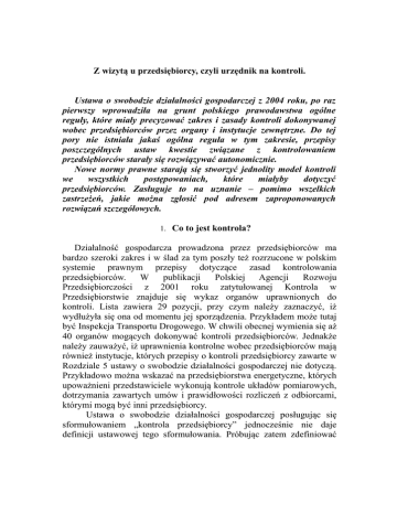 Z wizytą u przedsiębiorcy, czyli urzędnik na kontroli. Ustawa o swobodzie działalności gospodarczej z 2004 roku, po raz pierwszy wprowadziła na grunt polskiego prawodawstwa ogólne reguły, które miały precyzować zakres i zasady kontroli dokonywanej wobec przedsiębiorców przez organy i instytucje zewnętrzne. Do tej pory nie istniała jakaś ogólna reguła w tym zakresie, przepisy poszczególnych ustaw kwestie związane z kontrolowaniem przedsiębiorców starały się rozwiązywać autonomicznie. Nowe normy prawne starają się stworzyć jednolity model kontroli we wszystkich postępowaniach, które miałyby dotyczyć przedsiębiorców. Zasługuje to na uznanie – pomimo wszelkich zastrzeżeń, jakie można zgłosić pod adresem zaproponowanych rozwiązań szczegółowych. 1. Co to jest kontrola? Działalność gospodarcza prowadzona przez przedsiębiorców ma bardzo szeroki zakres i w ślad za tym poszły też rozrzucone w polskim systemie prawnym przepisy dotyczące zasad kontrolowania przedsiębiorców. W publikacji Polskiej Agencji Rozwoju Przedsiębiorczości z 2001 roku zatytułowanej Kontrola w Przedsiębiorstwie znajduje się wykaz organów uprawnionych do kontroli. Lista zawiera 29 pozycji, przy czym należy zaznaczyć, iż wydłużyła się ona od momentu jej sporządzenia. Przykładem może tutaj być Inspekcja Transportu Drogowego. W chwili obecnej wymienia się aż 40 organów mogących dokonywać kontroli przedsiębiorców. Jednakże należy zauważyć, iż uprawnienia kontrolne wobec przedsiębiorców mają również instytucje, których przepisy o kontroli przedsiębiorcy zawarte w Rozdziale 5 ustawy o swobodzie działalności gospodarczej nie dotyczą. Przykładowo można wskazać na przedsiębiorstwa energetyczne, których upoważnieni przedstawiciele wykonują kontrole układów pomiarowych, dotrzymania zawartych umów i prawidłowości rozliczeń z odbiorcami, którymi mogą być inni przedsiębiorcy. Ustawa o swobodzie działalności gospodarczej posługując się sformułowaniem „kontrola przedsiębiorcy” jednocześnie nie daje definicji ustawowej tego sformułowania. Próbując zatem zdefiniować pojęcie kontroli przedsiębiorcy należałoby wskazać, iż doktryna prawa pod pojęciem kontroli rozumie taką działalność (organu administracyjnego), która polega li tylko na sprawdzeniu innych jednostek, bez stałej możliwości wpływania na działalność jednostek kontrolowanych. Innymi słowy, na czynności kontrolne składa się ustalenie stanu obowiązującego, to znaczy wyznaczeń, zależnych przykładowo od przyjętych kryteriów kontrolnych, następnie ustalenie stanu rzeczywistego – tak zwanych wykonań, wreszcie zaś – ustalenie relacji pomiędzy wyznaczeniami, a wykonaniami wraz z przyczynami ewentualnych niezgodności. W przypadku wykrycia rozbieżności pomiędzy stanem ustalonym w trakcie kontroli, a stanem zakładanym (pożądanym z punktu widzenia aktualnego stanu prawnego, lub – częściej - oczekiwanym z punktu widzenia kontrolującego organu), organ kontrolny winien sformułować zalecenia mające na celu uniknięcie na przyszłość niepożądanych zjawisk, które zostały ujawnione w toku kontroli. Widać zatem, iż kontrola - de facto – jest rodzajem ekstrapolacji, gdzie kontrolujący przeprowadza wnioskowanie na temat całokształtu zachowań kontrolowanego w oparciu o zbadany przez siebie fragment. Godzi się zauważyć, iż kontrola jest funkcjonalnie związana ze słowem nadzór. Nadzór co prawda jest ujmowany jako działalność obejmująca kontrolę oraz kompetencję do merytorycznego korygowania działalności podmiotu poddanego nadzorowi, jednak w praktyce pojęcia te przenikają się. Przykładowo, organ dokonujący kontroli podatkowej, nie tylko ustala stan faktyczny w zakresie prawidłowości i rzetelności prowadzenia dokumentów podatkowych i porównuje go z wytycznymi w tym zakresie zawartymi w przepisach, ale w przypadku stwierdzenia niezgodności z prawem nakazuje usunięcie tych niezgodności dodatkowo zabezpieczając wykonanie swojego orzeczenia przymusem państwowym w postaci egzekucji administracyjnej. Tak więc w działaniu podmiotów kontrolujących przedsiębiorcę występują zarazem elementy kontroli, jak i nadzoru. Przy czym – co ważne - nadzór nie może naruszać samodzielności przedsiębiorców. Nadzór wszakże umożliwia ingerencję państwa w prowadzoną działalność gospodarczą, jeśli jest ona wykonywana niezgodnie z prawem, przy czym ocena tej niezgodności należy do dokonującego czynności z zakresu nadzoru czy kontroli. Nadzór zapewnia możliwość podejmowania wobec nadzorowanych przedsiębiorców decyzji o charakterze prewencyjnym, weryfikacyjnym i represyjnym. Tak też pojęcie kontroli zostało utrwalone w życiu codziennym. Możemy zatem przyjąć, że kontrola przedsiębiorcy w znaczeniu, w jakim jest ona używana w ustawie o swobodzie działalności gospodarczej mieści zarówno pojęcie kontroli, jak i elementy nadzoru. 2. Jak było, a jak jest obecnie. Do momentu wejścia w życie przepisów Rozdziału 5 ustawy o swobodzie działalności gospodarczej, co nastąpiło z dniem 21 sierpnia 2004, uprawnienia kontrolne wobec przedsiębiorców przysługiwały organom państwowym, samorządowym oraz organizacjom pozarządowym. Kontrola ta była prowadzona na podstawie przepisów regulujących dany rodzaj aktywności. I tak, do państwowych organów sprawujących kontrolę zaliczano służby skarbowe, inspekcje (Celną, Handlową, Sanitarną itp.), państwowe osoby prawne takie jak Narodowy Bank Polski (w zakresie kontroli dewizowej), Najwyższą Izbę Kontroli – jeśli idzie o kontrolę jednostek niepublicznych, urzędy centralne i wojewódzkie. Z kolei jako jednostki samorządowe uprawnione do kontroli kwalifikowano przede wszystkim prezydentów, burmistrzów, lub wójtów – w zakresie zobowiązań podatkowych, a także inspektoraty budowlane. Oprócz tych organów
