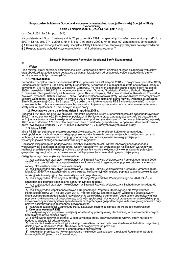 Rozporządzenie Ministra Gospodarki w sprawie ustalenia planu rozwoju Pomorskiej Specjalnej Strefy Ekonomicznej z dnia 31 sierpnia 2009 r. (Dz.U. Nr 158, poz. 1248) (zm. Dz.U. 2011 Nr 224, poz. 1344) Na podstawie art. 9 ust. 1 ustawy z dnia 20 października 1994 r. o specjalnych strefach ekonomicznych (Dz.U. z 2007 r. Nr 42, poz. 274, z 2008 r. Nr 118, poz. 746 oraz z 2009 r. Nr 18, poz. 97) zarządza się, co następuje: § 1 Ustala się plan rozwoju Pomorskiej Specjalnej Strefy Ekonomicznej, stanowiący załącznik do rozporządzenia. § 2 Rozporządzenie wchodzi w życie po upływie 14 dni od dnia ogłoszenia.1) Załącznik Plan rozwoju Pomorskiej Specjalnej Strefy Ekonomicznej. 2) 1. Wstęp Plan rozwoju strefy określa w szczególności cele ustanowienia strefy, działania służące osiągnięciu tych celów oraz obowiązki zarządzającego dotyczące działań zmierzających do osiągnięcia celów ustanowienia strefy i terminy wykonania tych obowiązków. 1.1. Wprowadzenie Pomorska Specjalna Strefa Ekonomiczna (PSSE) powstała dnia 29 sierpnia 2001 r. z połączenia Specjalnej Strefy Ekonomicznej "Tczew" i Specjalnej Strefy Ekonomicznej "Żarnowiec". Po połączeniu strefa obejmowała tereny o powierzchni 316,43 ha położone w Tczewie i Żarnowcu. Po kolejnych zmianach granic obszar strefy na koniec 2008 r. wzrósł do 1 161,8723 ha i obejmował tereny miast: Gdańsk, Grudziądz, Kwidzyn, Malbork, Stargard Szczeciński, Starogard Gdański i Tczew oraz gmin: Barcin, Chojnice, Człuchów, Gniewino, Kowalewo Pomorskie, Krokowa, Łysomice, Sztum, Świecie i Tczew. Zgodnie z planem rozwoju strefy, wprowadzonym rozporządzeniem Ministra Gospodarki i Pracy z dnia 15 kwietnia 2005 r. w sprawie ustalenia planu rozwoju Pomorskiej Specjalnej Strefy Ekonomicznej (Dz.U. Nr 81, poz. 707, z późn. zm.), funkcjonowanie PSSE miało doprowadzić m.in. do zmniejszenia bezrobocia w województwach pomorskim i kujawsko-pomorskim poprzez utworzenie na terenach strefy oraz w jej otoczeniu 10 tys. nowych miejsc pracy. 1.2. Podstawowe dane o strefie na dzień 31 grudnia 2008 r. Spośród 1 161,8723 ha gruntów objętych Pomorską Specjalną Strefą Ekonomiczną zostało zagospodarowanych 804,37 ha, co stanowi 69,23% całkowitej powierzchni. Poniesione przez zarządzającego strefą od początku jej funkcjonowania wydatki na inwestycje infrastrukturalne, podnoszące atrakcyjność oferowanych terenów, wyniosły 160,3 mln zł. Wydano 170 zezwoleń na prowadzenie działalności gospodarczej, w oparciu o które zrealizowano nowe inwestycje o wartości 3 701,78 mln zł i utworzono 12 213 nowych trwałych miejsc pracy. 1.3. Misja PSSE Misją PSSE jest podnoszenie konkurencyjności województw: pomorskiego, kujawsko-pomorskiego, wielkopolskiego i zachodniopomorskiego poprzez wdrażanie rozwiązań stymulujących rozwój nowoczesnych technologii, a także wspieranie rozwoju gospodarczego za pomocą rozwiązań uwzględniających i wykorzystujących szczególne uwarunkowania tych regionów. Realizacja misji polega na podejmowaniu inicjatyw mających na celu wzrost innowacyjności gospodarki województw na obszarach objętych strefą. Celem nadrzędnym jest tworzenie jak najlepszych warunków do realizacji przedsięwzięć inwestycyjnych oraz zwiększanie stopnia efektywności wykorzystywania potencjału gospodarczego regionów, w tym zasobów ludzkich poprzez tworzenie atrakcyjnych miejsc pracy. Osiągnięcie tego celu wiąże się nierozerwalnie z: 1) realizacją zadań przyjętych i określonych w Strategii Rozwoju Województwa Pomorskiego na lata 200520203), w szczególności w celu podniesienia konkurencyjności regionu, m.in. poprzez udoskonalanie oraz rozwój infrastruktury technicznej i komunalnej; 2) realizacją zadań przyjętych i określonych w Strategii Rozwoju Województwa Kujawsko-Pomorskiego na lata 2007-20204), w szczególności w celu wzrostu konkurencyjności regionu poprzez działania zwiększające atrakcyjność inwestycyjną obszarów aktywności gospodarczej; 3) realizacją zadań określonych w Strategii Rozwoju Województwa Wielkopolskiego do 2020 roku5), w szczególności poprzez podniesienie konkurencyjności regionu; 4) realizacją zadań przyjętych i określonych w Strategii Rozwoju Województwa Zachodniopomorskiego do roku 20206); 5) realizacją zadań współfinansowanych z Regionalnego Programu Operacyjnego dla Województwa Pomorskiego (RPO WP) na lata 2007-2013. Program stanowi skoordynowany, wieloletni i ustabilizowany finansowo program przedsięwzięć rozwojowych w województwie pomorskim. Jego celem strategicznym jest poprawa konkurencyjności gospodarczej, spójności społecznej i dostępności przestrzennej województwa przy zrównoważonym wykorzystaniu specyficznych cech potencjału gospodarczego i kulturowego regionu oraz przy pełnym poszanowaniu jego zasobów przyrodniczych; 6) rozwojem działalności Gdańskiego Parku Naukowo-Technologicznego im. Hilarego Koprowskiego. 2. Cele ustanowienia PSSE: 1) efektywne wykorzystywanie istniejącej infrastruktury przemysłowej i technicznej w celu tworzenia nowych firm dających nowe miejsca pracy; 2) pozyskiwanie nowych lokalizacji w celu uzyskania efektu zrównoważonego wpływu strefy na regiony będące w zasięgu jej oddziaływania; 3) ułatwianie transferu technologii z lokalnych ośrodków badawczych oraz akademickich do firm i organizacji działających w Gdańskim Parku Naukowo-Technologicznym lub poza nim; 4) zwiększenie liczby inwestycji o charakterze innowacyjnym; 5) kreowanie, promowanie i wykorzystywanie możliwości wynikających z realizacji Regionalnej Strategii Innowacji dla Województwa Pomorskiego; 6) rozwój współpracy z instytucjami zajmującymi się promocją regionalnej oferty inwestycyjnej mającej m.in. na celu stymulowanie kooperacji firm działających w regionie; 7) aktywizacja rynku pracy, wzrost poziomu wykształcenia i kwalifikacji pracowników; 8) docelowe przekształcenie strefy w nowoczesny