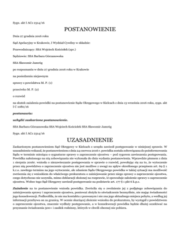 Sygn. akt I ACz 2314/16 POSTANOWIENIE Dnia 27 grudnia 2016 roku Sąd Apelacyjny w Krakowie, I Wydział Cywilny w składzie: Przewodniczący: SSA Wojciech Kościołek (spr.) Sędziowie: SSA Barbara Górzanowska SSA Sławomir Jamróg po rozpoznaniu w dniu 27 grudnia 2016 roku w Krakowie na posiedzeniu niejawnym sprawy z powództwa M. P. (1) przeciwko M. P. (2) o rozwód na skutek zażalenia powódki na postanowienie Sądu Okręgowego w Kielcach z dnia 13 września 2016 roku, sygn. akt I C 1080/16 postanawia: uchylić zaskarżone postanowienie. SSA Barbara Górzanowska SSA Wojciech Kościołek SSA Sławomir Jamróg Sygn. akt I ACz 2314/16 UZASADNIENIE Zaskarżonym postanowieniem Sąd Okręgowy w Kielcach z urzędu zawiesił postępowanie w niniejszej sprawie. W uzasadnieniu wskazał, że postanowieniem z dnia 24 czerwca 2016 r. powódka została zobowiązana do poinformowania Sądu w terminie miesiąca o sygnaturze sprawy o zaprzeczenie ojcostwa – pod rygorem zawieszenia postępowania. Powódka nałożonego na nią zobowiązania nie wykonała do dnia wydania postanowienia. Wprawdzie pismem z dnia 1 sierpnia 2016r. wniosła o niezawieszanie postępowania w sprawie o rozwód, powołując się na to, że wytoczenie przez nią powództwa o zaprzeczenie ojcostwa nie jest możliwe z uwagi na upływ określonego przepisem art. 69 § 1 k.r.o. zawitego terminu na jego wytoczenie, ale zdaniem Sądu Okręgowego powódka w takiej sytuacji ma możliwość zwrócenia się z wnioskiem do właściwego prokuratora o zainicjowanie przez niego sprawy o zaprzeczenie ojcostwa, czego dotychczas nie uczyniła, mimo deklaracji złożonej na rozprawie, iż spowoduje założenie sprawy o zaprzeczenie ojcostwa. Wobec tego Sąd Okręgowy zawiesił postępowanie na podstawie art. 177 § 1 pkt 6 k.p.c. Zażalenie na to postanowienie wniosła powódka. Zwróciła się o zwolnienie jej z podjętego zobowiązania do zainicjowania sprawy i zaprzeczenie ojcostwa, ponieważ złożyła to oświadczenie bezmyślnie, nie mając świadomości jego konsekwencji. Podkreśliła, że nie ma kontaktu z pozwanym i nie zna jego aktualnego miejsca pobytu, a według jej informacji przebywa on za granicą. W ocenie skarżącej złożenie wniosku do prokuratora, by wystąpił z powództwem o zaprzeczenie ojcostwa, znacznie wydłuży postępowanie, a w konsekwencji powódka będzie dłużej oczekiwać na przyznanie świadczenia 500+ i zasiłek rodzinny, których w chwili obecnej nie pobiera. Sąd Apelacyjny zważył, co następuje: Zażalenie powódki zasługuje na uwzględnienie, choć z innych względów niż w nim wskazane. Zgodnie z art. 177 § 1 pkt 6 in fine k.p.c. Sąd może zawiesić postępowanie z urzędu, jeżeli na skutek (…) niewykonania przez powoda innych zarządzeń nie można nadać sprawie dalszego biegu. W ocenie Sądu Apelacyjnego kluczowa dla rozstrzygnięcia sprawy jest interpretacja użytego w cytowanym przepisie sformułowania „nie można nadać sprawie dalszego biegu”. Oznacza ono, że przepis ten znajduje zastosowanie, gdy powód nie wykonuje zarządzenia, a jego bezczynność wstrzymuje możliwość dalszego procedowania. W orzecznictwie i doktrynie nie budzi wątpliwości, że art. 177 § 1 pkt 6 k.p.c. dotyczy przeszkód, które stanowią przeszkodę do nadania sprawie biegu, czyli mają charakter formalny, a nie takich, które rzutują na wynik sprawy w jej aspekcie materialnym, jak np. niewykonanie przez powoda postanowień dowodowych lub stawianie przeszkód w ich wykonaniu (por. postanowienie Sądu Najwyższego z 8 kwietnia 1966 r., I CZ 26/66, z 3 lipca 1969 r., II CZ 69/69, z 4 maja 1973 r., II CZ 53/73, z 29 marca 1982 r., IV CZ 44/82, M. Jędrzejewska, [w:] T. Ereciński (red.), Kodeks postępowania cywilnego. Komentarz, cz. I, t. I, 2012, s. 808; K. Piasecki (red.), Kodeks postępowania cywilnego. Komentarz, t. I, 2016, pozycja dostępna w systemie informacji prawnej Legalis). Katalog zarządzeń, o których mowa w art. 177 § 1 pkt 6 k.p.c., jest otwarty; mieszczą się w nim zarządzenia, które spełniają łącznie następujące kryteria: mają charakter formalny, ich niewykonanie uniemożliwia nadanie sprawie dalszego biegu, czyli uniemożliwia kontynuowanie postępowania, a jednocześnie brak przepisu szczególnego, który z niewykonaniem zarządzenia wiąże inne skutki procesowe (por. uzasadnienie postanowienia Sądu Najwyższego z 28 listopada 1968 r., II CZ 185/68). Ponadto sąd powinien rozważyć, czy wskutek niewykonania takiego zarządzenia zawieszenie postępowania będzie celowe (por. K. Piasecki (red.), Kodeks postępowania cywilnego. Komentarz, t. I, 2016, pozycja dostępna w systemie informacji prawnej Legalis). Sąd Apelacyjny doszedł do przekonania, że niewykonane przez powódkę zobowiązanie do podania sygnatury sprawy o zaprzeczenie ojcostwa nie należało do kręgu zarządzeń, których niewykonanie skutkuje zawieszeniem postępowania na podstawie art. 177 § 1 pkt 6 k.p.c. Należy bowiem mieć na uwadze, że sprawa ta nie została dotychczas wszczęta. Gdyby była ona w toku, Sąd pierwszej instancji mógłby fakultatywnie zawiesić postępowanie z urzędu na podstawie art. 177 § 1 pkt 1 k.p.c., z uwagi na to, że rozstrzygnięcie sprawy zależy od wyniku innego toczącego się postępowania cywilnego, do czego jednak Sad Okręgowy się nie odnosi. Do innych postępowań cywilnych nie ma bowiem zastosowania art. 177 § 2 k.p.c., który pozwala sądowi na wyznaczenie stronie odpowiedniego terminu na wszczęcie postępowań administracyjnych, karnych i dyscyplinarnych lub zwrócenie się o to do właściwego organu. Niewykonanie przez powódkę wezwania do podania sygnatury sprawy o zaprzeczenie ojcostwa wobec braku jego wszczęcia nie tamuje natomiast dalszego biegu niniejszej sprawy. Nie ma ono także charakteru formalnego, gdyż dotyczy istoty sprawy w ujęciu materialnym i rzutuje na treść ewentualnego wyroku, a nie na możliwość prowadzenia postępowania. Nale