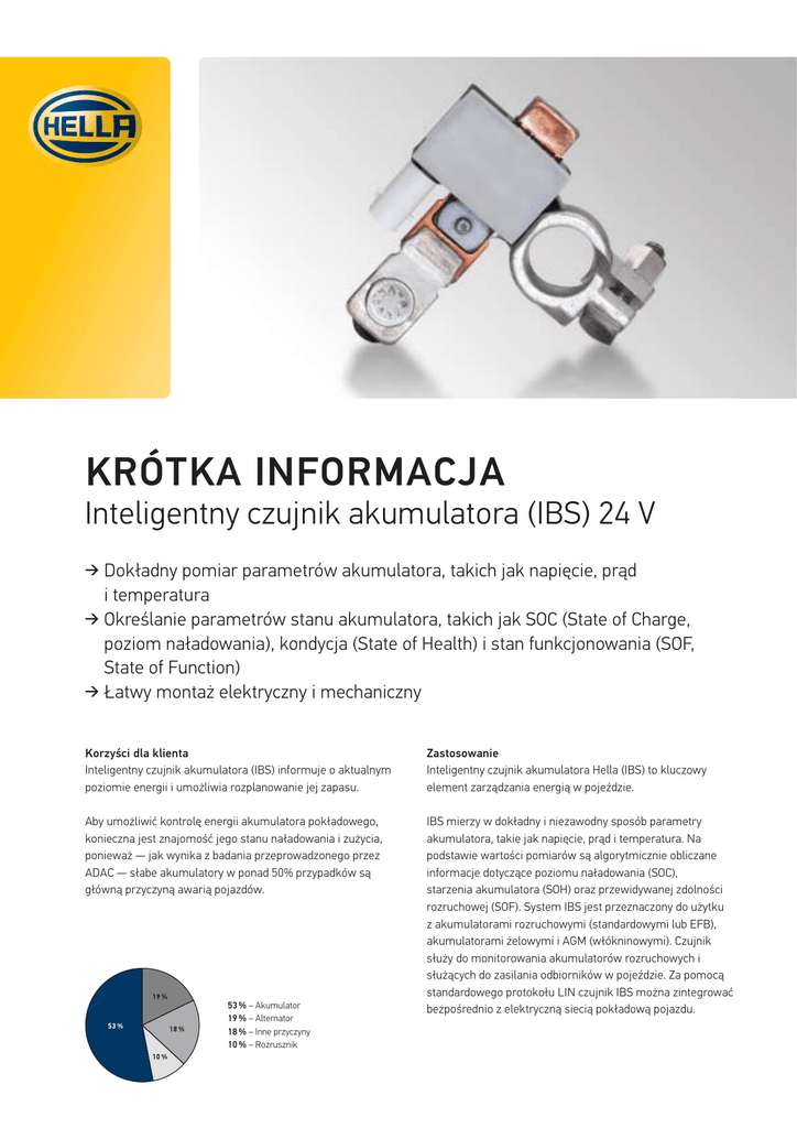 KRÓTKA INFORMACJA Inteligentny czujnik akumulatora (IBS) 24 V Dokładny pomiar parametrów akumulatora, takich jak napięcie, prąd i temperatura Określanie parametrów stanu akumulatora, takich jak SOC (State of Charge, poziom naładowania), kondycja (State of Health) i stan funkcjonowania (SOF, State of Function) Łatwy montaż elektryczny i mechaniczny Korzyści dla klienta Inteligentny czujnik akumulatora (IBS) informuje o aktualnym poziomie energii i umożliwia rozplanowanie jej zapasu. Zastosowanie Inteligentny czujnik akumulatora Hella (IBS) to kluczowy element zarządzania energią w pojeździe. Aby umożliwić kontrolę energii akumulatora pokładowego, konieczna jest znajomość jego stanu naładowania i zużycia, ponieważ — jak wynika z badania przeprowadzonego przez ADAC — słabe akumulatory w ponad 50% przypadków są główną przyczyną awarią pojazdów. IBS mierzy w dokładny i niezawodny sposób parametry akumulatora, takie jak napięcie, prąd i temperatura. Na podstawie wartości pomiarów są algorytmicznie obliczane informacje dotyczące poziomu naładowania (SOC), starzenia akumulatora (SOH) oraz przewidywanej zdolności rozruchowej (SOF). System IBS jest przeznaczony do użytku z akumulatorami rozruchowymi (standardowymi lub EFB), akumulatorami żelowymi i AGM (włókninowymi). Czujnik służy do monitorowania akumulatorów rozruchowych i służących do zasilania odbiorników w pojeździe. Za pomocą standardowego protokołu LIN czujnik IBS można zintegrować bezpośrednio z elektryczną siecią pokładową pojazdu. 53 % – Akumulator 19 % – Alternator 18 % – Inne przyczyny 10 % – Rozrusznik KONSTRUKCJA I DZIAŁANIE Czujnik IBS jest podłączany bezpośrednio do bieguna minusowego akumulatora za pomocą zacisku. Oprócz zacisku, mechaniczna część czujnika akumulatora składa się z bocznika i kołka masowego. Bocznik jest zainstalowany na obciążeniu i działa jako rezystor pomiarowy do pośredniego pomiaru prądu. Do kołka masowego można w wygodny sposób przymocować istniejący kabel masowy, np. za pomocą opcjonalnie dostępnego adaptera. Czujnik akumulatora IBS 1. Bocznik na czujniku 2. Wtyczka 3. Moduł czujnika 4. Ujemna końcówka biegunowa 5. Przykręcany kołek do adaptera bieguna akumulatora Układy elektroniczne znajdują się w zalanej obudowie z łącznikiem wtykowym i stanowią złącze do zarządzania energią. Funkcję interfejsu komunikacyjnego dla sterownika nadrzędnego spełnia protokół LIN. Napięcie zasilające, które jest używane jednocześnie jako napięcie odniesienia do pomiaru napięcia, jest udostępniane przez połączenie z biegunem dodatnim. Montaż na standardowym biegunie akumulatora (adapter bieguna akumulatora nie należy do zakresu dostawy) ZARZĄDZANIE ENERGIĄ Z INTELIGENTNYM CZUJNIKIEM AKUMULATORA Energia mechaniczna Silnik Zwiększenie prędkości obrotowej biegu jałowego Dzięki zastosowaniu inteligentnego czujnika akumulatora, system zarządzania energią może szybko reagować przy krytycznym stanie akumulatora i wpłynąć zarówno na zachowanie odbiorników, jak też alternatora. Alternator Energia elektryczna Akumulator Zarządzanie energią Odbiorniki Magistrala LIN Akumulator Inteligentny czujnik akumulatora Parametry akumulatora (napięcie, prąd, temperatura, SOE, SOH, ...) Wpływ na odbiorniki prądu Monitorowanie alternatora SCHEMAT BLOKOWY INTELIGENTNEGO CZUJNIKA AKUMULATORA Głównym komponentem elektronicznym, służącym do rejestracji wartości pomiarów i ich przetwarzania, jest układ ASIC. Rejestracja wartości pomiarowych w układzie ASIC, pełniąca rolę czujnika precyzyjnego, stanowi centralną funkcję inteligentnego czujnika akumulatora i służy do pomiaru parametrów fizycznych takich, jak prąd, napięcie i temperatura. Powernet Regulator napięcia 24 V ASIC Pomiar napięcia Pomiar temperatury Procesor Interfejs LIN Pomiar prądu 12 V I- I+ Bocznik Podwozie Przepływ informacji/małe prądy Przepływ prądu DANE TECHNICZNE Dane techniczne, 24 V Rysunek wymiarowy Napięcie robocze (min. / typ. / maks.) 6 V / 28 V / 32 V Zakres pomiarowy1 ± 1.200 A 1 Prąd roboczy (stały) Prąd maksymalny1 Stopień ochrony Zużycie prądu (tryby pracy) Maks. pojemność akumulatora Temperatura robocza Kołek masowy Sygnał wyjściowy 1 ± 200 A ± 1.600 A (20 ms) IP 6K9K 15 mA (normal mode) 120 uA (sleep mode) 249 Ah -40°C do 85°C M8 LIN (2.0) Warunki standardowe: Ta ≤ 105°C; Ub=24 V; kabel masowy : przekrój 70 mm² Inne konfiguracje obciążeń na zapytanie HELLA Polska Sp. z o.o. Wał Miedzeszyński 552 03-994 Warszawa Telefon: 22/5141760 Fax: 22/5141761 www.hella.com.pl © HELLA KGaA Hueck & Co., Lippstadt, 03.13 PRZEGLĄD WARIANTÓW Czujnik akumulatora IBS 24 V znajduje się w fazie rozwojowej. Z chęcią udostępnimy urządzenia wzorcowe. Opcjonalnie można zamówić także czujnik z mocowanie dokręcanym do kołka biegunowego akumulatora (bez klemy). Napięcie robocze Typ Kontrawtyk Numer artykułu od 6 V do 32 V – Hirschmann 872-858 Tyco 1-167 0917-1 Na zapytanie Akcesoria opcjonalne: Adapter do montażu do kołka biegunowego akumulatora typu Plug-and-Play 9MK 179 472-007