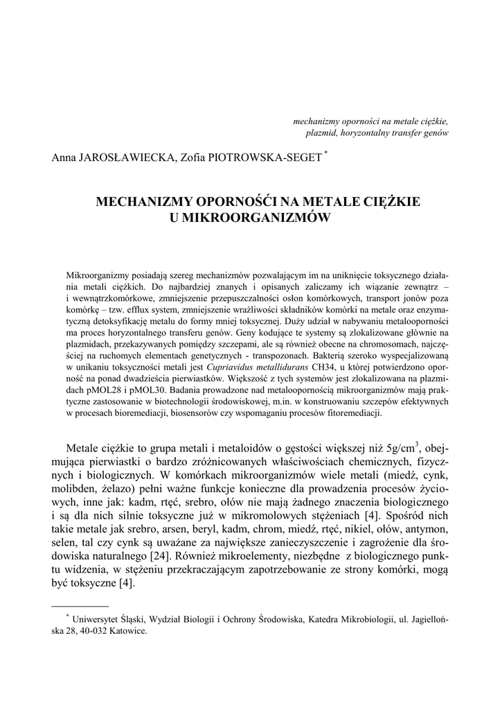 mechanizmy oporności na metale ciężkie, plazmid, horyzontalny transfer genów Anna JAROSŁAWIECKA, Zofia PIOTROWSKA-SEGET * MECHANIZMY OPORNOŚĆI NA METALE CIĘŻKIE U MIKROORGANIZMÓW Mikroorganizmy posiadają szereg mechanizmów pozwalającym im na uniknięcie toksycznego działania metali ciężkich. Do najbardziej znanych i opisanych zaliczamy ich wiązanie zewnątrz – i wewnątrzkomórkowe, zmniejszenie przepuszczalności osłon komórkowych, transport jonów poza komórkę – tzw. efflux system, zmniejszenie wrażliwości składników komórki na metale oraz enzymatyczną detoksyfikację metalu do formy mniej toksycznej. Duży udział w nabywaniu metalooporności ma proces horyzontalnego transferu genów. Geny kodujące te systemy są zlokalizowane głównie na plazmidach, przekazywanych pomiędzy szczepami, ale są również obecne na chromosomach, najczęściej na ruchomych elementach genetycznych - transpozonach. Bakterią szeroko wyspecjalizowaną w unikaniu toksyczności metali jest Cupriavidus metallidurans CH34, u której potwierdzono oporność na ponad dwadzieścia pierwiastków. Większość z tych systemów jest zlokalizowana na plazmidach pMOL28 i pMOL30. Badania prowadzone nad metaloopornością mikroorganizmów mają praktyczne zastosowanie w biotechnologii środowiskowej, m.in. w konstruowaniu szczepów efektywnych w procesach bioremediacji, biosensorów czy wspomaganiu procesów fitoremediacji. Metale ciężkie to grupa metali i metaloidów o gęstości większej niż 5g/cm3, obejmująca pierwiastki o bardzo zróżnicowanych właściwościach chemicznych, fizycznych i biologicznych. W komórkach mikroorganizmów wiele metali (miedź, cynk, molibden, żelazo) pełni ważne funkcje konieczne dla prowadzenia procesów życiowych, inne jak: kadm, rtęć, srebro, ołów nie mają żadnego znaczenia biologicznego i są dla nich silnie toksyczne już w mikromolowych stężeniach [4]. Spośród nich takie metale jak srebro, arsen, beryl, kadm, chrom, miedź, rtęć, nikiel, ołów, antymon, selen, tal czy cynk są uważane za największe zanieczyszczenie i zagrożenie dla środowiska naturalnego [24]. Również mikroelementy, niezbędne z biologicznego punktu widzenia, w stężeniu przekraczającym zapotrzebowanie ze strony komórki, mogą być toksyczne [4]. __________ * Uniwersytet Śląski, Wydział Biologii i Ochrony Środowiska, Katedra Mikrobiologii, ul. Jagiellońska 28, 40-032 Katowice. 232 A. JAROSŁAWIECKA, Z. PIOTROWSKA-SEGET Mikroelementy pełnią szereg ważnych funkcji. Są kofaktorami reakcji biochemicznych, stabilizują strukturę białek i ściany komórkowej bakterii, uczestniczą również w utrzymywaniu równowagi osmotycznej w komórce i reakcjach redoks [4].Toksyczność metali jest związana z zamianą niezbędnych mikroelementów w miejscu ich wiązania, zmianach w strukturze kwasów nukleinowych i białek, zaburzeniach równowagi osmotycznej czy w hamowaniu procesów enzymatycznych [4]. Nie mniej jednak, w świetle ostatnich badań dogmat o bezwzględnej szkodliwości niektórych metali został podważony. Pojawiają się doniesienia o ich możliwym biologicznym znaczeniu i wykorzystaniu. Przykładowo, u okrzemki morskiej Thalassiosira weissflogii, żyjącej na powierzchni oceanów, kadm jest niezbędny dla biologicznej aktywności anhydrazy węglanowej, enzymu aktywnego w jednym z pierwszych etapów w procesie fotosyntezy. Kadm prawdopodobnie pełni również podobną funkcję komórkach innych mikroskopijnych glonów , a więc stanowi prawdopodobnie istotny element w procesie fotosyntezy i obiegu węgla w przyrodzie [10]. Metale ciężkie były obecne w środowisku naturalnym od początku życia, stąd uważa się, że mechanizmy obronne neutralizujące ich toksyczność rozwinęły się w wyniku tak wczesnej ekspozycji mikroorganizmów na ich działanie [22]. Systemy nadające oporność na metale ciężkie są obecne niemal we wszystkich mikroorganizmach [8]. Niewątpliwie działanie człowieka i postępujące zanieczyszczenie środowiska znacznie przyczyniło się do utrzymania presji selekcyjnej i faworyzowania szczepów posiadających wyżej wymienione mechanizmy. Co ciekawe, niejednokrotnie oporność na metale jest również powiązana z opornością na antybiotyki, stąd postępujące zanieczyszczenie środowiska w świetle narastającego problemu antybiotykooporności wśród bakterii jest dość niepokojące [4]. Toksyczność metali jest powiązana z ich biodostępnością dla mikroorganizmów, na co wpływa pH danego środowiska, obecność innych jonów i związków chelatujących czy inne czynniki środowiskowe (np. obecność próchnicy czy związków ilastych w glebie ). Kwaśny odczyn środowiska sprzyja rozpuszczalności związków metali, a co za tym idzie zwiększa stężenie ich biodostępnej frakcji dla mikroorganizmów [11]. Mikroorganizmy wykształciły szereg mechanizmów obronnych umożliwiającym im uniknięcie toksycznego działania tych pierwiastków. Wg Bruins’a wyróżnia się sześć takich mechanizmów: (1) wewnątrz- i (2) zewnątrzkomórkowe wiązanie, (3) zmniejszenie przepuszczalności osłon komórkowych dla jonów metali,(4) transport metali poza komórkę – tzw. efflux system, (5) zmniejszenie wrażliwości składników komórki na metale oraz (6) enzymatyczną detoksyfikację metalu do formy mniej toksycznej. Mikroorganizmy mogą posiadać jeden z mechanizmów lub ich kombinację [4]. Oporność na metale ciężkie jest głównie kodowana przez operony obecne na dodatkowych elementach genetycznych, jakimi są plazmidy. Mogą również znajdować się na chromosomach, często zlokalizowane są na transpozonach - mobilnych ele- Mechanizmy oporności na metale ciężkie u mikroorganizmów 233 mentach genetycznych [4]. Ruchome elementy genetyczne biorą udział w przekazywaniu genów determinujących oporność na metale ciężkie w procesie horyzontalnego transferu genów. Sprzyja to powstawaniu i r