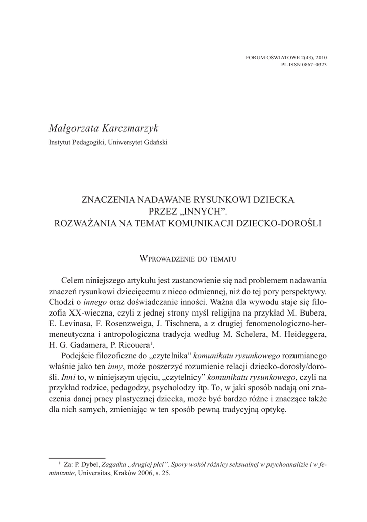 FORUM OŚWIATOWE 2(43), 2010 PL ISSN 0867–0323 Małgorzata Karczmarzyk Instytut Pedagogiki, Uniwersytet Gdański Znaczenia nadawane rysunkowi dziecka przez „innych”. Rozważania na temat komunikacji dziecko-dorośli Wprowadzenie do tematu Celem niniejszego artykułu jest zastanowienie się nad problemem nadawania znaczeń rysunkowi dziecięcemu z nieco odmiennej, niż do tej pory perspektywy. Chodzi o innego oraz doświadczanie inności. Ważna dla wywodu staje się filozofia XX-wieczna, czyli z jednej strony myśl religijna na przykład M. Bubera, E. Levinasa, F. Rosenzweiga, J. Tischnera, a z drugiej fenomenologiczno-hermeneutyczna i antropologiczna tradycja według M. Schelera, M. Heideggera, H. G. Gadamera, P. Ricouera1. Podejście filozoficzne do „czytelnika” komunikatu rysunkowego rozumianego właśnie jako ten inny, może poszerzyć rozumienie relacji dziecko-dorosły/dorośli. Inni to, w niniejszym ujęciu, „czytelnicy” komunikatu rysunkowego, czyli na przykład rodzice, pedagodzy, psycholodzy itp. To, w jaki sposób nadają oni znaczenia danej pracy plastycznej dziecka, może być bardzo różne i znaczące także dla nich samych, zmieniając w ten sposób pewną tradycyjną optykę. 1 Za: P. Dybel, Zagadka „drugiej płci”. Spory wokół różnicy seksualnej w psychoanalizie i w feminizmie, Universitas, Kraków 2006, s. 25. 80 Małgorzata Karczmarzyk Nadawanie znaczeń przez „innych” Nadawanie znaczeń rysunkowi dziecka zostanie przedstawione za pomocą trzech schematów, z których pierwszy odnosić się będzie do teorii Józefa Tischnera, drugi do Martina Heideggera, a trzeci do Jacquesa Lacana. Przywołane koncepcje poszerzą perspektywę myślenia o nadawaniu znaczeń dziecka przez innych oraz pokażą potencjalną możliwość dialogu i wzajemnego porozumiewania się dziecka z dorosłymi-innymi. Schemat 1.Triada relacji ja-rysunek-inny rysunek (pośredniczy w dialogu) Ja inny (Ty) Źródło: opracowanie własne. W pierwszym schemacie triada: ja-rysunek-inny stanowi pomost porozumienia i dialog pomiędzy Ja i innym (Ty). W związku z tym: Ja – to nadawca komunikatu rysunkowego (dziecko), a inny (Ty) – to „czytelnik” komunikatu rysunkowego (dorosły). Taki układ zakłada dialogiczność relacji i wzajemne spotkanie Ja i innego (Ty). Według Józefa Tischnera: nie ma Ja bez Ty i Ty bez Ja. Znaczy to nie tylko, iż ja i ty odbijamy się wzajemnie, jak lustra, stojąc na przeciwległych brzegach rzeki, ale i to, że Ty jesteś we mnie, a Ja w tobie, iż niesiemy siebie jako swe ciężary2. Dopiero spotkanie z innym: innym Ja, innym Ty3 jest źródłem poznania i samopoznania. Dorosły poznaje samego siebie przez odbicie w Ja-dziecku. Dziecko zaś poznaje siebie w odbiciu dorosłego. Dzieje się to za pośrednictwem komunikacji rysunkowej, gdyż dzięki niej dorosły widzi dziecko inaczej, lepiej. Poznaje świat dziecka, a tym samym poznaje siebie w tym świecie, swoją rolę, znaczenie, J. Tischner, Filozofia dramatu. Wprowadzenie, Wyd. Znak, Kraków 1998, s. 113. Tenże, Bliscy i dalecy – inspiracje tekstem, źródło internetowe: http://www.tezeusz.pl/cms/tz/ index.php?id=788, (data wejścia na stronę 23.07.08). 2 3 Znaczenia nadawane rysunkowi dziecka przez „innych” 81 zachowanie. Dziecko zaś uczy się socjalizacji, wychowania, norm, postępowania według zasad społecznych. Uczy się więc świata dorosłych, samego dorosłego oraz swojej roli dziecka w miejscu i świecie dorosłych. Jednak może być również tak, że Ja staje się tylko i wyłącznie odbiciem poprzez rysunek dla innego Ty. Tym samym nie ma już relacji dialogicznej, a zaczyna się monolog z samym sobą, naprzeciwko albo w polu ja-rysunku, czyli w rysunku-świecie dziecka. Schemat 2.Triada relacji ja-rysunek (świat)-inny rysunek-świat ja dorosły-inny Źródło: opracowanie własne. Okazuje się, że dorosły próbujący zinterpretować komunikat zawarty w rysunku dziecka, nie stara się wcale opowiedzieć czegoś o dziecku, ale nadając znaczenia, odnajduje w nim samego siebie. Dorosły – inny poprzez rysunek poznaje istotę swojego „jestestwa”. Jak pisze Martin Heidegger: znajomość siebie nawzajem opiera się na źródłowo rozumiejącym współbyciu. Ono zaś porusza się zrazu, zgodnie z najbliższym mu sposobem bycia współbędącego bycia-w-świecie, w obrębie rozumiejącej znajomości tego, co bytowanie (Dasein) z innymi znajduje dzięki przeglądowi w otoczeniu4. Poprzez odbicie i otoczenie, które jest obok (rysunek-świat), oglądający rysunek, jak w lustrze, odnajduje siebie. Zrozumienie komunikatu rysunkowego jest więc odnalezieniem i każdorazowo nowym, oryginalnym stworzeniem własnej tożsamości. Jak pisze Tomasz Szkudlarek: tworzenie znaczeń jest tworzeniem nas samych. Nie ma tu szczególnej granicy między tym, co podmiotowe, co nas samych dotyczy, a tym, co jawi się jako wiedza o świecie zewnętrznym5. Próbując odczytywać znaczenia rysunkowe M. Heidegger, Bycie i czas, Wyd. Naukowe PWN, Warszawa 1994, s. 176. T. Szkudlarek, Wydarzenia, urzeczywistnienie, różnica: edukacyjna autokreacja społeczeństwa, [w:] Różnica, tożsamość, edukacja. Szkice z pogranicza, Wyd. Impuls, Kraków 1995, s. 10. 4 5 82 Małgorzata Karczmarzyk dziecka, nawet zupełnie nieświadomie nakładamy i tworzymy od nowa siebie. Nie można pozbyć się swojego „jestestwa” i nie można interpretować czegoś bez „jestestwa”. Przy nadawaniu znaczeń wszystko co jest w nas, tworzy kolejny nowy element układanki, jaką jesteśmy i staje się początkiem samopoznania. Odmienną drogą interpretacyjną mogłaby być koncepcja Jacquesa Lacana ujmująca język jako porządek symboliczny. Gdyby rysunek potraktować jako język, który istnieje samoistnie i który, według Lacanowskiej koncepcji, jest tym Innym, to schemat relacji dziecko-dorosły przebiegałby następująco: Schemat 3.Relacja ja-inny ja inny Źródło: opracowanie własne. Według Lacana