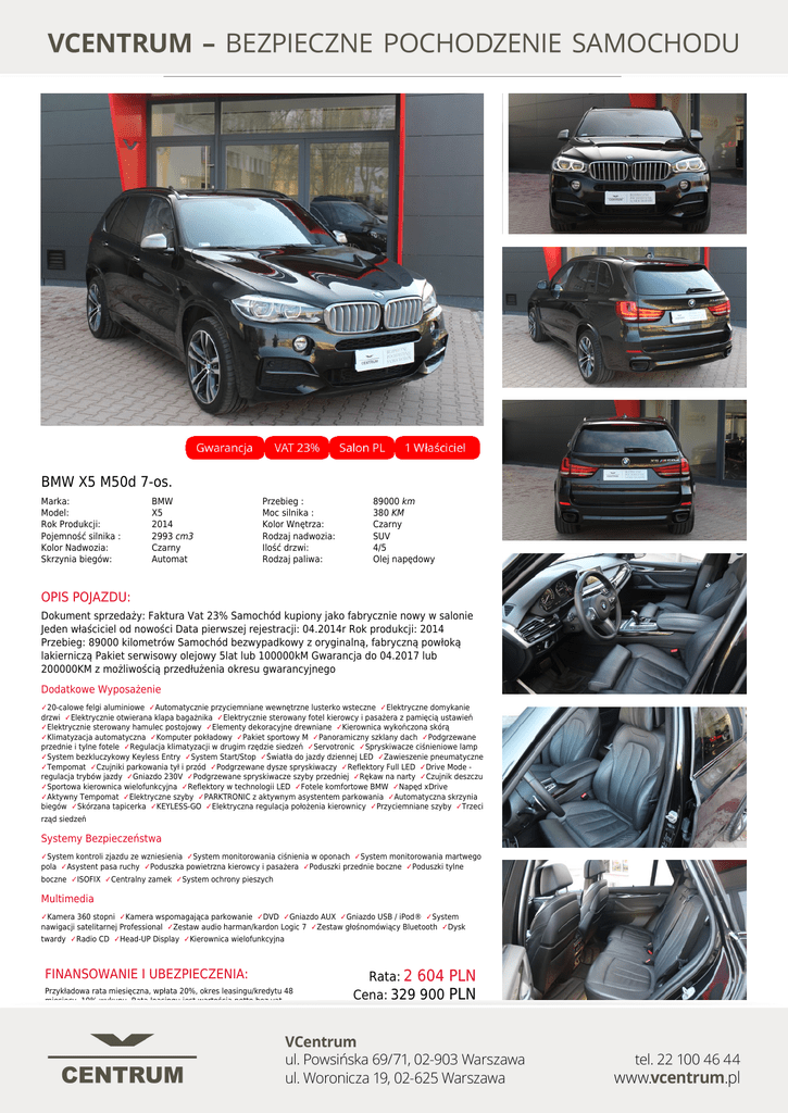 BMW X5 M50d 7-os. Marka: Model: Rok Produkcji: Pojemność silnika : Kolor Nadwozia: Skrzynia biegów: BMW X5 2014 2993 cm3 Czarny Automat Przebieg : Moc silnika : Kolor Wnętrza: Rodzaj nadwozia: Ilość drzwi: Rodzaj paliwa: 89000 km 380 KM Czarny SUV 4/5 Olej napędowy OPIS POJAZDU: Dokument sprzedaży: Faktura Vat 23% Samochód kupiony jako fabrycznie nowy w salonie Jeden właściciel od nowości Data pierwszej rejestracji: 04.2014r Rok produkcji: 2014 Przebieg: 89000 kilometrów Samochód bezwypadkowy z oryginalną, fabryczną powłoką lakierniczą Pakiet serwisowy olejowy 5lat lub 100000kM Gwarancja do 04.2017 lub 200000KM z możliwością przedłużenia okresu gwarancyjnego Dodatkowe Wyposażenie ✓20-calowe felgi aluminiowe ✓Automatycznie przyciemniane wewnętrzne lusterko wsteczne ✓Elektryczne domykanie drzwi ✓Elektrycznie otwierana klapa bagażnika ✓Elektrycznie sterowany fotel kierowcy i pasażera z pamięcią ustawień ✓Elektrycznie sterowany hamulec postojowy ✓Elementy dekoracyjne drewniane ✓Kierownica wykończona skórą ✓Klimatyzacja automatyczna ✓Komputer pokładowy ✓Pakiet sportowy M ✓Panoramiczny szklany dach ✓Podgrzewane przednie i tylne fotele ✓Regulacja klimatyzacji w drugim rzędzie siedzeń ✓Servotronic ✓Spryskiwacze ciśnieniowe lamp ✓System bezkluczykowy Keyless Entry ✓System Start/Stop ✓Światła do jazdy dziennej LED ✓Zawieszenie pneumatyczne ✓Tempomat ✓Czujniki parkowania tył i przód ✓Podgrzewane dysze spryskiwaczy ✓Reflektory Full LED ✓Drive Mode regulacja trybów jazdy ✓Gniazdo 230V ✓Podgrzewane spryskiwacze szyby przedniej ✓Rękaw na narty ✓Czujnik deszczu ✓Sportowa kierownica wielofunkcyjna ✓Reflektory w technologii LED ✓Fotele komfortowe BMW ✓Napęd xDrive ✓Aktywny Tempomat ✓Elektryczne szyby ✓PARKTRONIC z aktywnym asystentem parkowania ✓Automatyczna skrzynia biegów ✓Skórzana tapicerka ✓KEYLESS-GO ✓Elektryczna regulacja położenia kierownicy ✓Przyciemniane szyby ✓Trzeci rząd siedzeń Systemy Bezpieczeństwa ✓System kontroli zjazdu ze wzniesienia ✓System monitorowania ciśnienia w oponach ✓System monitorowania martwego pola ✓Asystent pasa ruchy ✓Poduszka powietrzna kierowcy i pasażera ✓Poduszki przednie boczne ✓Poduszki tylne boczne ✓ISOFIX ✓Centralny zamek ✓System ochrony pieszych Multimedia ✓Kamera 360 stopni ✓Kamera wspomagająca parkowanie ✓DVD ✓Gniazdo AUX ✓Gniazdo USB / iPod® ✓System nawigacji satelitarnej Professional ✓Zestaw audio harman/kardon Logic 7 ✓Zestaw głośnomówiący Bluetooth ✓Dysk twardy ✓Radio CD ✓Head-UP Display ✓Kierownica wielofunkcyjna FINANSOWANIE I UBEZPIECZENIA: Przykładowa rata miesięczna, wpłata 20%, okres leasingu/kredytu 48 miesięcy, 10% wykupu. Rata leasingu jest wartością netto bez vat. Rata: 2 604 Cena: 329 900 PLN PLN Niniejsza treść nie stanowi oferty w rozumieniu przepisów Kodeksu Cywilnego oraz opisu towaru ani zapewnienia w rozumieniu art. 4 Ustawy z dnia 27 lipca 2002r o szczególnych warunkach sprzedaży konsumenckiej. Powered by TCPDF (www.tcpdf.org)