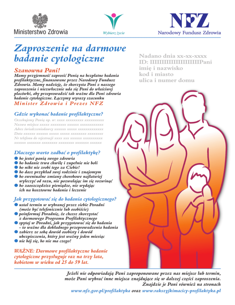 Ministerstwo Zdrowia Zaproszenie na darmowe badanie cytologiczne Szanowna Pani! Mamy przyjemnoÊç zaprosiç Panià na bezp∏atne badania profilaktyczne, finansowane przez Narodowy Fundusz Zdrowia. Mamy nadziej´, ˝e skorzysta Pani z naszego zaproszenia i niezw∏ocznie uda si´ Pani do w∏aÊciwej placówki, aby przeprowadziç tak wa˝ne dla Pani zdrowia badanie cytologiczne. ¸àczymy wyrazy szacunku Nadano dnia xx-xx-xxxx ID: IIIIIIIIIIIIIIIIIIIIIPani imi´ i nazwisko kod i miasto ulica i numer domu Minister Zdrowia i Prezes NFZ Gdzie wykonaç badanie profilaktyczne? Oczekujemy Panià np. w: xxxx xxxxxxxxx xxxxxxxxxx Nazwa miejsca xxxxx xxxxxxxx xxxxxx xxxxxxxxxxxx Adres Êwiadczeniodawcy xxxxxx xxxxx xxxxxxxxxxxxx Data xxxxxx xxxxxx xxxxx xxxxx xxxxxxxx xxxxxxxx Nr telefonu do rejestracji xxxx xxx xxxxxx xxxxxxxxxx xxxxxx xxxxxxx xxxxxxxx xxxxxxxx xxxxxxx xxxxxx Dlaczego warto zadbaç o profilaktyk´? bo jesteÊ panià swego zdrowia bo badanie trwa chwil´ i zupe∏nie nie boli bo nikt nie zrobi tego za Ciebie! bo dasz przyk∏ad swej rodzinie i znajomym bo ewentualne zmiany chorobowe naj∏atwiej wyleczyç od razu, nie pozwalajàc im si´ rozwinàç bo zaoszcz´dzisz pieniàdze, nie wydajàc ich na kosztowne badania i leczenie Jak przygotowaç si´ do badania cytologicznego? ustal termin w wybranej przez siebie Poradni (mo˝e byç telefonicznie lub osobiÊcie) poinformuj Poradni´, ˝e chcesz skorzystaç z darmowego Programu Profilaktycznego spytaj w Poradni, jak przygotowaç si´ do badania - to wa˝ne dla dok∏adnego przeprowadzenia badania zabierz ze sobà dowód osobisty i dowód ubezpieczenia, który jest wa˝ny jeden miesiàc nie bój si´, bo nie ma czego! WA˚NE: Darmowe profilaktyczne badanie cytologiczne przys∏uguje raz na trzy lata, kobietom w wieku od 25 do 59 lat. Je˝eli nie odpowiadajà Pani zaproponowane przez nas miejsce lub termin, mo˝e Pani wybraç inne miejsca znajdujàce si´ w dalszej cz´Êci zaproszenia. Znajdzie je Pani równie˝ na stronach www.nfz.gov.pl/profilaktyka oraz www.rakszyjkimacicy-profilaktyka.pl