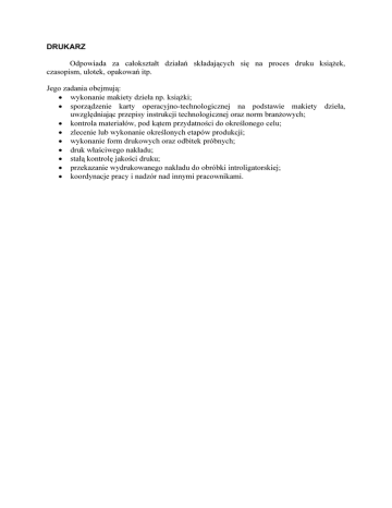 DRUKARZ O d p o w ia d a z a c a ło k s z ta łt c z a s o p i s m , ul o t e k , o p a k o w a ń i t p . d z ia ła ń s k ła d a ją c y c h s ię n a J e g o z a d a n i a o b e j m uj ą : • w y k o n a n ie m a k ie ty d z ie ła n p .k s ią ż k i; • s p o r z ą d z e n i e k a r t y o p e r a c y j n o -t e c h n o l o g i c z n e j n a p o uw z g l ę d n i a j ą c p r z e p i s y i n s t r uk c j i t e c h n o l o g i c z n e j o r a z n o r m • k o n tro la m a te ria łó w , p o d k ą te m p rz y d a tn o ś c i d o o k re ś lo n e g • z l e c e n i e l ub w y k o n a n i e o k r e ś l o n y c h e t a p ó w p r o d uk c j i ; • w y k o n a n i e f o r m d r uk o w y c h o r a z o d b i t e k p r ó b n y c h ; • d r uk w ł a ś c i w e g o n a k ł a d u; • s t a ł ą k o n t r o l ę j a k o ś c i d r uk u; • p r z e k a z a n i e w y d r uk o w a n e g o n a k ł a d u d o o b r ó b k i i n t r o l i g a t o • k o o rd y n a c je p ra c y i n a d z ó r n a d in n y m i p ra c o w n ik a m i. p ro c e s d r uk u k s i ą ż e k , d s ta w ie m a k ie ty b ra n ż o w y c h ; o c e l u; rs k ie j; d z ie ła ,