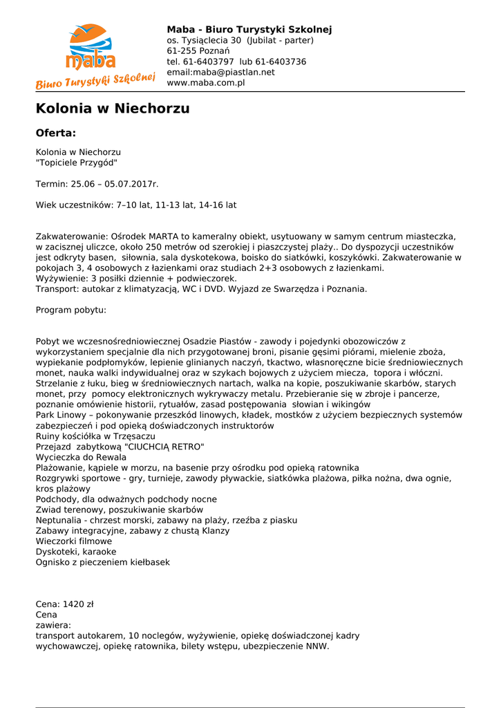 Maba - Biuro Turystyki Szkolnej os. Tysiąclecia 30 (Jubilat - parter) 61-255 Poznań tel. 61-6403797 lub 61-6403736 email:[email protected] www.maba.com.pl Kolonia w Niechorzu Oferta: Kolonia w Niechorzu "Topiciele Przygód" Termin: 25.06 – 05.07.2017r. Wiek uczestników: 7–10 lat, 11-13 lat, 14-16 lat Zakwaterowanie: Ośrodek MARTA to kameralny obiekt, usytuowany w samym centrum miasteczka, w zacisznej uliczce, około 250 metrów od szerokiej i piaszczystej plaży.. Do dyspozycji uczestników jest odkryty basen, siłownia, sala dyskotekowa, boisko do siatkówki, koszykówki. Zakwaterowanie w pokojach 3, 4 osobowych z łazienkami oraz studiach 2+3 osobowych z łazienkami. Wyżywienie: 3 posiłki dziennie + podwieczorek. Transport: autokar z klimatyzacją, WC i DVD. Wyjazd ze Swarzędza i Poznania. Program pobytu: Pobyt we wczesnośredniowiecznej Osadzie Piastów - zawody i pojedynki obozowiczów z wykorzystaniem specjalnie dla nich przygotowanej broni, pisanie gęsimi piórami, mielenie zboża, wypiekanie podpłomyków, lepienie glinianych naczyń, tkactwo, własnoręczne bicie średniowiecznych monet, nauka walki indywidualnej oraz w szykach bojowych z użyciem miecza, topora i włóczni. Strzelanie z łuku, bieg w średniowiecznych nartach, walka na kopie, poszukiwanie skarbów, starych monet, przy pomocy elektronicznych wykrywaczy metalu. Przebieranie się w zbroje i pancerze, poznanie omówienie historii, rytuałów, zasad postępowania słowian i wikingów Park Linowy – pokonywanie przeszkód linowych, kładek, mostków z użyciem bezpiecznych systemów zabezpieczeń i pod opieką doświadczonych instruktorów Ruiny kościółka w Trzęsaczu Przejazd zabytkową "CIUCHCIĄ RETRO" Wycieczka do Rewala Plażowanie, kąpiele w morzu, na basenie przy ośrodku pod opieką ratownika Rozgrywki sportowe - gry, turnieje, zawody pływackie, siatkówka plażowa, piłka nożna, dwa ognie, kros plażowy Podchody, dla odważnych podchody nocne Zwiad terenowy, poszukiwanie skarbów Neptunalia - chrzest morski, zabawy na plaży, rzeźba z piasku Zabawy integracyjne, zabawy z chustą Klanzy Wieczorki filmowe Dyskoteki, karaoke Ognisko z pieczeniem kiełbasek Cena: 1420 zł Cena zawiera: transport autokarem, 10 noclegów, wyżywienie, opiekę doświadczonej kadry wychowawczej, opiekę ratownika, bilety wstępu, ubezpieczenie NNW. Maba - Biuro Turystyki Szkolnej os. Tysiąclecia 30 (Jubilat - parter) 61-255 Poznań tel. 61-6403797 lub 61-6403736 email:[email protected] www.maba.com.pl Dla chętnych wycieczka do Parku Rozrywki „Poligon” - koszt 70 zł. Militarna Przygoda w Parku Rozrywki „Poligon” - wojskowe szkolenie i średniowieczne rytuały w pigułce, prowadzone metodą musztry bojowej i dobrej zabawy: malowanie kamuflażu na twarzy, przebieranie się w mundury oraz, manewry wojskowe, sprawnościowy wojskowy tor przeszkód OSF, ,,małpi gaj”, strzelnica - strzelanie sytuacyjne z karabinków paintballowych lub ASG, techniki linowe – ścianka wspinaczkowa, techniki alpinistyczne, żyroskop – test na trenażerze dla pilotów i skoczków wojskowych, poszukiwanie skarbów, min przy pomocy elektronicznych wykrywaczy metalu, pobyt we wczesnośredniowiecznej osadzie PIASTÓW - ,,historia na żywo”. Odbędą się zawody i pojedynki obozowiczów z wykorzystaniem specjalnie dla nich przygotowanej broni, zwiedzanie ,,ZAŚCIANKA” – skansen w stylu sali rycerskiej, strzelanie z armaty – bombarda krzyżacka, nauka walki indywidualnej oraz w szykach bojowych z użyciem miecza, topora i włóczni, bieg w średniowiecznych nartach, jazda na koniu lub kucyku, rzut toporem i oszczepem, walka na kopie. Powered by TCPDF (www.tcpdf.org)