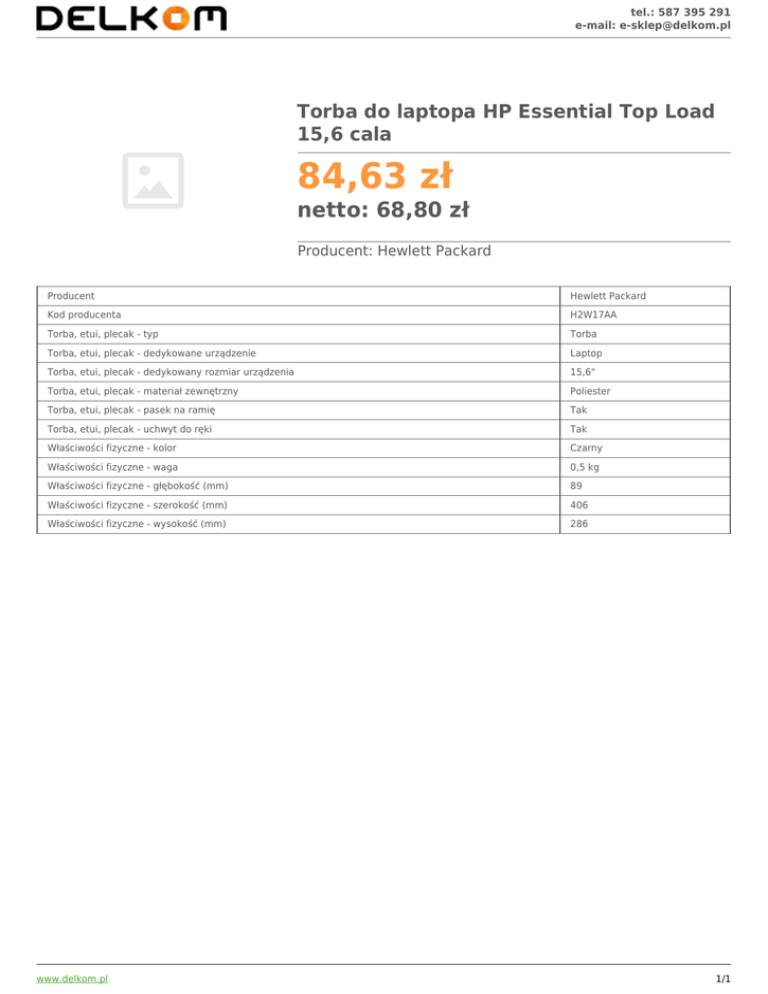 tel.: 587 395 291 e-mail: [email protected] Torba do laptopa HP Essential Top Load 15,6 cala 84,63 zł netto: 68,80 zł Producent: Hewlett Packard Producent Hewlett Packard Kod producenta H2W17AA Torba, etui, plecak - typ Torba Torba, etui, plecak - dedykowane urządzenie Laptop Torba, etui, plecak - dedykowany rozmiar urządzenia 15,6" Torba, etui, plecak - materiał zewnętrzny Poliester Torba, etui, plecak - pasek na ramię Tak Torba, etui, plecak - uchwyt do ręki Tak Właściwości fizyczne - kolor Czarny Właściwości fizyczne - waga 0,5 kg Właściwości fizyczne - głębokość (mm) 89 Właściwości fizyczne - szerokość (mm) 406 Właściwości fizyczne - wysokość (mm) 286 www.delkom.pl 1/1