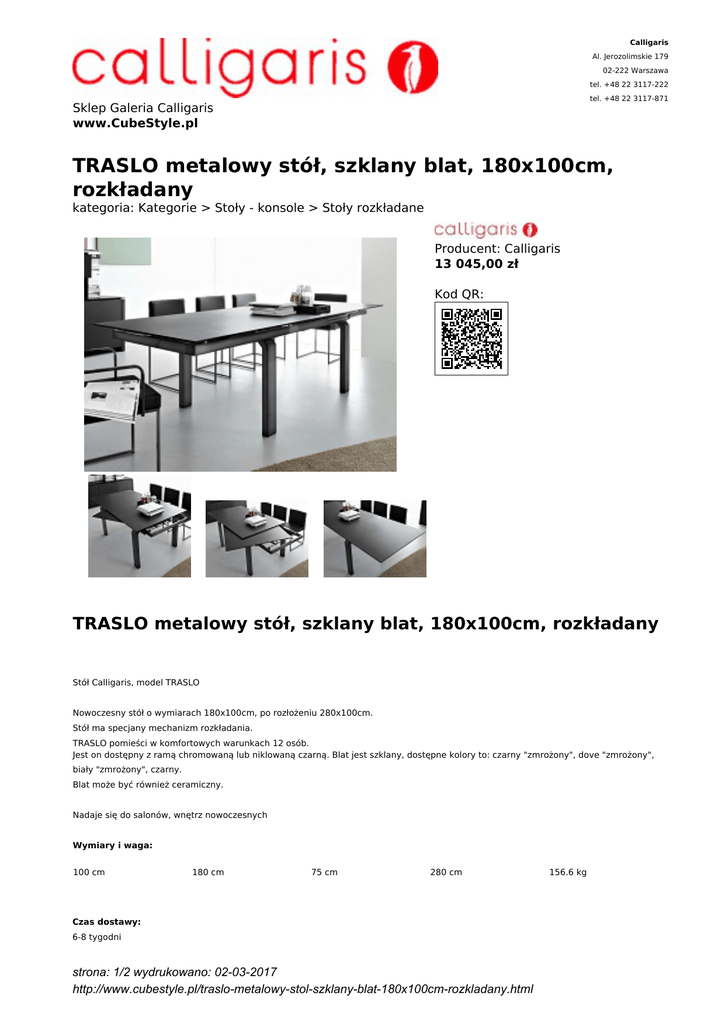 Calligaris Al. Jerozolimskie 179 02-222 Warszawa tel. +48 22 3117-222 tel. +48 22 3117-871 Sklep Galeria Calligaris www.CubeStyle.pl TRASLO metalowy stół, szklany blat, 180x100cm, rozkładany kategoria: Kategorie > Stoły - konsole > Stoły rozkładane Producent: Calligaris 13 045,00 zł Kod QR: TRASLO metalowy stół, szklany blat, 180x100cm, rozkładany Stół Calligaris, model TRASLO Nowoczesny stół o wymiarach 180x100cm, po rozłożeniu 280x100cm. Stół ma specjany mechanizm rozkładania. TRASLO pomieści w komfortowych warunkach 12 osób. Jest on dostępny z ramą chromowaną lub niklowaną czarną. Blat jest szklany, dostępne kolory to: czarny "zmrożony", dove "zmrożony", biały "zmrożony", czarny. Blat może być również ceramiczny. Nadaje się do salonów, wnętrz nowoczesnych Wymiary i waga: 100 cm 180 cm 75 cm 280 cm Czas dostawy: 6-8 tygodni strona: 1/2 wydrukowano: 02-03-2017 http://www.cubestyle.pl/traslo-metalowy-stol-szklany-blat-180x100cm-rozkladany.html 156.6 kg Dostępne wersje: Structure Glass top Glass/Ceramic Top strona: 2/2 wydrukowano: 02-03-2017 http://www.cubestyle.pl/traslo-metalowy-stol-szklany-blat-180x100cm-rozkladany.html