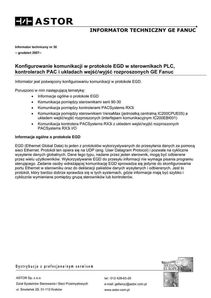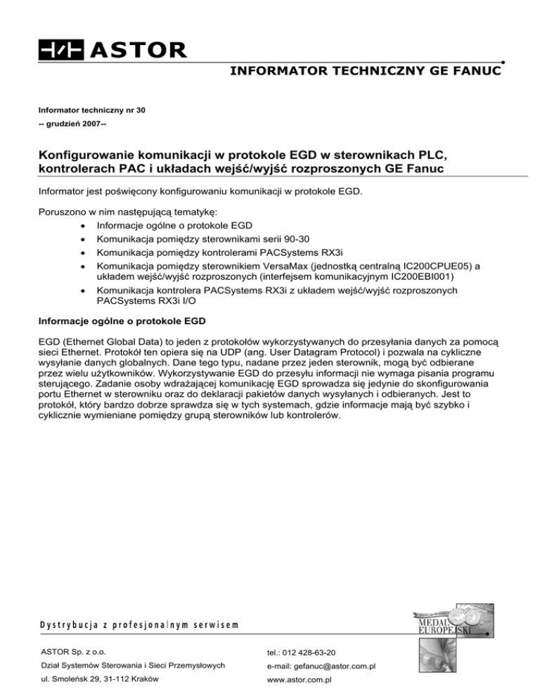 INFORMATOR TECHNICZNY GE FANUC Informator techniczny nr 30 -- grudzień 2007-- Konfigurowanie komunikacji w protokole EGD w sterownikach PLC, kontrolerach PAC i układach wejść/wyjść rozproszonych GE Fanuc Informator jest poświęcony konfigurowaniu komunikacji w protokole EGD. Poruszono w nim następującą tematykę: • Informacje ogólne o protokole EGD • Komunikacja pomiędzy sterownikami serii 90-30 • Komunikacja pomiędzy kontrolerami PACSystems RX3i • Komunikacja pomiędzy sterownikiem VersaMax (jednostką centralną IC200CPUE05) a układem wejść/wyjść rozproszonych (interfejsem komunikacyjnym IC200EBI001) • Komunikacja kontrolera PACSystems RX3i z układem wejść/wyjść rozproszonych PACSystems RX3i I/O Informacje ogólne o protokole EGD EGD (Ethernet Global Data) to jeden z protokołów wykorzystywanych do przesyłania danych za pomocą sieci Ethernet. Protokół ten opiera się na UDP (ang. User Datagram Protocol) i pozwala na cykliczne wysyłanie danych globalnych. Dane tego typu, nadane przez jeden sterownik, mogą być odbierane przez wielu użytkowników. Wykorzystywanie EGD do przesyłu informacji nie wymaga pisania programu sterującego. Zadanie osoby wdrażającej komunikację EGD sprowadza się jedynie do skonfigurowania portu Ethernet w sterowniku oraz do deklaracji pakietów danych wysyłanych i odbieranych. Jest to protokół, który bardzo dobrze sprawdza się w tych systemach, gdzie informacje mają być szybko i cyklicznie wymieniane pomiędzy grupą sterowników lub kontrolerów. ASTOR Sp. z o.o. tel.: 012 428-63-20 Dział Systemów Sterowania i Sieci Przemysłowych e-mail: [email protected] ul. Smoleńsk 29, 31-112 Kraków www.astor.com.pl Komunikację w protokole EGD umożliwiają następujące moduły: Nr katalogowy Prędkość Zastosowanie w serii IC200CPUE05 10Mb Sterowniki VersaMax IC200EBI001 10/100Mb Układy wejść/wyjść VersaMax IC693CPU374 10/100Mb Sterowniki 90-30 IC693NIU004 10/100Mb Układy wejść/wyjść 90-30 IC697CMM742 10Mb Sterowniki 90-70 IC695ETM001 10/100Mb Kontrolery i układy wejść/wyjść RX3i IC698ETM001 10/100Mb Kontrolery RX7i IC698CPE010 10/100Mb Kontrolery RX7i IC698CPE020 10/100Mb Kontrolery RX7i IC698CRE020 10/100Mb Kontrolery RX7i IC698CPE030 10/100Mb Kontrolery RX7i IC698CRE030 10/100Mb Kontrolery RX7i IC698CPE040 10/100Mb Kontrolery RX7i IC698CRE040 10/100Mb Kontrolery RX7i Komunikacja w protokole EGD może odbywać się na kilka sposobów. W przypadku urządzeń z serii PACSystems możliwe są trzy sposoby nadawania: multicast, unicast oraz broadcast: • unicast polega na nadawaniu tylko do jednego odbiorcy identyfikowanego za pomocą IP. • multicast polega na nadawaniu do kilku odbiorców zdefiniowanych za pomocą grupy • broadcast polega na nadawaniu do wszystkich urządzeń znajdujących się w sieci. Podczas konfigurowania sterowników serii VersaMax, w polu „Destination” dostępne są dwie opcje: • IP Addres – jest równoważna opcji unicast • Group ID – jest równoważna opcji multicast W sterownikach serii 90-30 oraz 90-70, poza opcjami dostępnymi w sterownikach VersaMax, dostępna jest również opcja Broadcast. Pakiety danych wysyłanych i odbieranych deklaruje się w odpowiednich tablicach. Najpierw, do podsystemu, zawierającego odpowiedni moduł komunikacyjny Ethernet, dodaje się nowy komponent – Ethernet Global Data; robi się to klikając na podsystemie prawym klawiszem myszki i wybierając Add Component. Pojedyncza ramka danych umożliwia przesłanie maksymalnie 1400 bajtów. Jeżeli dane, które zamierzamy przesłać, nie mieszczą się w pojedynczej ramce EGD, można je przesłać w kilku różnych ramkach; tzn. można zakładać wiele ramek EGD do komunikacji z tym samym urządzeniem. 2 Następnie, dodaje się tabele, które definiują dane wysyłane i przyjmowane. Określa się je mianem ramek konsumowanych (Consumed Exchanges) oraz produkowanych (Produced Exchanges). W dalszej części Informatora Technicznego zostaną opisane krok po kroku różne przykłady komunikacji z wykorzystaniem protokołu EGD. Należy pamiętać, że po załadowaniu konfiguracji, w której zostały zmienione parametry sieci Ethernet lub ramki EGD, powinien zostać przeprowadzony restart modułu Ethernet poprzez wciśnięcie przycisku ETHERNET RESTART. Podczas konfigurowania ramek EGD należy zwrócić uwagę na to, aby nadany numer wysyłanej ramki EGD zgadzał się z zadeklarowanym numerem ramki odbieranej (jest to parametr „Exchange ID”). Również zawartość tych ramek powinna być ze sobą kompatybilna, tzn. musi się zgadzać ilość przesyłanych danych. W prezentowanych przykładach ramki EGD wysyłane są do konkretnego, pojedynczego odbiorcy (jest to transmisja typu unicast). 3 Aby śledzić poprawność przesyłanych danych, z reguły wystarczy monitorować rejestry statusowe konsumowanych ramek EGD. Poprawność odebrania ramki sygnalizowana jest pojawianiem się w nich wartości 1. 1. Komunikacja pomiędzy sterownikami serii 90-30 Założenia: Należy zrealizować komunikację pomiędzy dwoma sterownikami zawierającymi jednostki centralne IC693CPU374. Sterownik A ma przesyłać do sterownika B 10 rejestrów, a sterownik B ma przesyłać do sterownika A 5 rejestrów i 16 bitów wg adresów podanych na poniższym rysunku. Rozwiązanie: Załóżmy podsystemy o nazwach PLC_A oraz PLC_B, odpowiadające obu sterownikom. Skonfigurujmy parametry sieciowe jednostek wg założeń. W sterowniku A nadajmy więc adres IP 192.168.1.1. W sterowniku B nadajmy adres 192.168.1.2. Następnie, do obu podsystemów dodajmy komponent Ethernet Global Data. We właściwościach Ethernet Global Data dla jednostki A skonfigurujmy adres lokalnego producenta ramek EDG (Local Producer ID) jako 192.168.1.1. 4 Dla jednostki B skonfigurujmy adres 192.168.1.2. Dla jednostki A załóżmy: • ramkę produkowaną (ramkę danych do wysłania) o nazwie Wysylane_Slowa_do_PLC_B, • ramkę konsumowaną (ramk