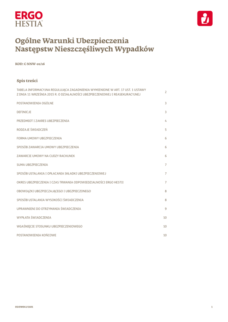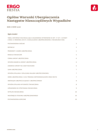 Ogólne Warunki Ubezpieczenia Następstw Nieszczęśliwych Wypadków KOD: C-NNW-01/16 Spis treści TABELA INFORMACYJNA REGULUJĄCA ZAGADNIENIA WYMIENIONE W ART. 17 UST. 1 USTAWY Z DNIA 11 WRZEŚNIA 2015 R. O DZIAŁALNOŚCI UBEZPIECZENIOWEJ I REASEKURACYJNEJ 2 POSTANOWIENIA OGÓLNE 3 DEFINICJE 3 PRZEDMIOT I ZAKRES UBEZPIECZENIA 4 RODZAJE ŚWIADCZEŃ 5 FORMA UMOWY UBEZPIECZENIA 6 SPOSÓB ZAWARCIA UMOWY UBEZPIECZENIA 6 ZAWARCIE UMOWY NA CUDZY RACHUNEK 6 SUMA UBEZPIECZENIA 7 SPOSÓB USTALANIA I OPŁACANIA SKŁADKI UBEZPIECZENIOWEJ 7 OKRES UBEZPIECZENIA I CZAS TRWANIA ODPOWIEDZIALNOŚCI ERGO HESTII 7 OBOWIĄZKI UBEZPIECZAJĄCEGO I UBEZPIECZONEGO 8 SPOSÓB USTALANIA WYSOKOŚCI ŚWIADCZENIA 8 UPRAWNIENI DO OTRZYMANIA ŚWIADCZENIA 9 WYPŁATA ŚWIADCZENIA 10 WGAŚNIĘCIE STOSUNKU UBEZPIECZENIOWEGO 10 POSTANOWIENIA KOŃCOWE 10 OS/OW041/1601 1 Poniższa tabela informuje, które z zawartych w niniejszych Ogólnych Warunków Ubezpieczenia Następstw Nieszczęśliwych Wypadków postanowień regulują zagadnienia wymienione w art. 17 ust. 1 ustawy z dnia 11 września 2015 r. o działalności ubezpieczeniowej i reasekuracyjnej. Nazwa ubezpieczenia Następstwa Nieszczęśliwych Wypadków 2 Numer jednostki redakcyjnej wzorca Przesłanki wypłaty odszkodowania i innych świadczeń lub wartość wykupu ubezpieczenia: Ograniczenia oraz wyłączenia odpowiedzialności zakładu ubezpieczeń uprawniające do odmowy wypłaty odszkodowania i innych świadczeń lub ich obniżenia: § 4, § 7, § 8, § 9, § 10, § 11, § 12, § 13, § 14, § 28 ust. 2-3, § 32 § 5, § 19, § 23 ust. 3, § 24 ust. 3, § 25 ust. 3, § 28 ust. 4-5, § 29, § 31 ust. 2, § 34, § 35 ust. 2, § 43, § 44 ust. 2 OS/OW041/1601 Infolinia 801 107 107*, 58 555 5 555 *opłata za połączenie zgodnie z cennikiem operatora www.ergohestia.pl POSTANOWIENIA OGÓLNE §1 1. Na podstawie niniejszych Ogólnych Warunków Ubezpieczenia Sopockie Towarzystwo Ubezpieczeń ERGO Hestia SA, (dalej: „ERGO Hestia”), w zakresie działania swego przedsiębiorstwa, zawiera umowy ubezpieczenia z osobami fizycznymi, osobami prawnymi i jednostkami organizacyjnymi niebędącymi osobami prawnymi, którym ustawa przyznaje zdolność prawną, (dalej: „Ubezpieczający”). 2. Ubezpieczonym w umowach ubezpieczenia zawartych na podstawie niniejszych Ogólnych Warunków Ubezpieczenia może być wyłącznie osoba fizyczna. 3. Informujemy, że w związku z zawartą umową ubezpieczenia: 1) Sopockie Towarzystwo Ubezpieczeń ERGO Hestia SA z siedzibą w Sopocie przy ul. Hestii 1, (dalej: „ERGO Hestia”), jest administratorem Pani/Pana danych osobowych, które będą przez nią przetwarzane w celu wywiązania się z umowy ubezpieczenia oraz dla wypełnienia prawnie usprawiedliwionych celów, którymi są marketing bezpośredni własnych produktów i usług oraz dochodzenie roszczeń z tytułu zawartej umowy ubezpieczenia. Dane przetwarzane są na podstawie: art. 23 ust. 1 pkt 3) i pkt 5) ww. ustawy z dnia 29 sierpnia 1997 r. o ochronie danych osobowych (tekst jednolity Dz. U. z 2015 r. poz. 2135) i art. 815 Kodeksu cywilnego, 2) służy Pani/Panu prawo wglądu do swoich danych osobowych oraz ich poprawiania, a przetwarzanie tych danych w celach innych niż wymienione powyżej prawnie usprawiedliwione cele ERGO Hestii albo osób trzecich, którym przekazywane są te dane, wymaga uzyskania Pani/Pana uprzedniej zgody. 4. ERGO Hestia nie ponosi odpowiedzialności za skutki niepodania do jej wiadomości okoliczności, o które pytała we wniosku o zawarcie umowy ubezpieczenia lub podanie tych okoliczności niezgodnie z prawdą. 5. Ubezpieczający przed zawarciem umowy ubezpieczenia powinien szczegółowo zapoznać się z treścią Ogólnych Warunków Ubezpieczenia. 6. Zwracamy uwagę, że definicje używanych pojęć mogą odbiegać od typowego, powszechnego ich znaczenia, jak też od definicji zawartych w powszechnie obowiązujących przepisach prawa. DEFINICJE §2 Pojęcia używane w dalszej części niniejszych ogólnych warunków ubezpieczenia oznaczają: 1) ekspedycja - zorganizowana wyprawa mająca na celu zrealizowanie wytyczonych zadań o charakterze sportowym bądź naukowym, 2) koszty leczenia - koszty poniesione na badania i zabiegi ambulatoryjne oraz operacyjne, pobyt w placówce służby zdrowia, jak również zakup niezbędnych lekarstw i środków opatrunkowych, 3) lokaut - zamknięcie zakładu przez właściciela, połączone ze zwalnianiem pracowników, przeprowadzane dla zmuszenia ich do przyjęcia gorszych warunków pracy lub ze względu na strajk, 4) nieszczęśliwy wypadek - nagłe zdarzenie wywołane przyczyną zewnętrzną, w wyniku którego Ubezpieczony - niezależnie od swojej woli - doznał uszkodzenia ciała, rozstroju zdrowia lub zmarł, OS/OW041/1601 5) osoba uprawniona - osoba wskazana przez Ubezpieczonego lub osoba określona w niniejszych Ogólnych Warunkach Ubezpieczenia, uprawniona do odbioru świadczenia z tytułu śmierci Ubezpieczonego, 6) osoby trzecie - wszystkie podmioty pozostające poza stosunkiem ubezpieczeniowym, wynikającym z umowy ubezpieczenia zawartej z ERGO Hestią, 7) przedsiębiorca - osoba fizyczna, osoba prawna lub inna jednostka organizacyjna niebędąca osobą prawną, której ustawa przyznaje zdolność prawną, prowadząca we własnym imieniu działalność gospodarczą lub zawodową, 8) przestępstwo - czyn człowieka, zabroniony przez ustawę obowiązującą w czasie jego popełnienia, pod groźbą kary jako zbrodnia lub występek bezprawny, zawiniony i społecznie szkodliwy w stopniu wyższym niż znikomy, 9) stan po spożyciu alkoholu - stan w którym stężenie alkoholu we krwi wynosi od 0,2 ‰ do 0,5 ‰ lub obecność alkoholu w wydychanym powietrzu wynosi od 0,1mg do 0,25 mg alkoholu w 1 dm3, 10) stan nietrzeźwości - stan w którym stężenie alkoholu we krwi wynosi powyżej 0,5 ‰ lub obecność alkoholu w wydychanym powietrzu wynosi powyżej 0,25 mg alkoholu w 1 dm3, 11) strajk - zbiorowe, dobrowolne po