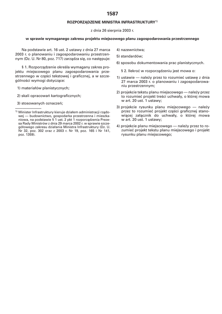 1587 ROZPORZÑDZENIE MINISTRA INFRASTRUKTURY1) z dnia 26 sierpnia 2003 r. w sprawie wymaganego zakresu projektu miejscowego planu zagospodarowania przestrzennego Na podstawie art. 16 ust. 2 ustawy z dnia 27 marca 2003 r. o planowaniu i zagospodarowaniu przestrzennym (Dz. U. Nr 80, poz. 717) zarzàdza si´, co nast´puje: 4) nazewnictwa; 5) standardów; 6) sposobu dokumentowania prac planistycznych. § 1. Rozporzàdzenie okreÊla wymagany zakres projektu miejscowego planu zagospodarowania przestrzennego w cz´Êci tekstowej i graficznej, a w szczególnoÊci wymogi dotyczàce: 1) materia∏ów planistycznych; 2) skali opracowaƒ kartograficznych; 3) stosowanych oznaczeƒ; ——————— 1) Minister Infrastruktury kieruje dzia∏em administracji rzàdowej — budownictwo, gospodarka przestrzenna i mieszkaniowa, na podstawie § 1 ust. 2 pkt 1 rozporzàdzenia Prezesa Rady Ministrów z dnia 29 marca 2002 r. w sprawie szczegó∏owego zakresu dzia∏ania Ministra Infrastruktury (Dz. U. Nr 32, poz. 302 oraz z 2003 r. Nr 19, poz. 165 i Nr 141, poz. 1359). § 2. Ilekroç w rozporzàdzeniu jest mowa o: 1) ustawie — nale˝y przez to rozumieç ustaw´ z dnia 27 marca 2003 r. o planowaniu i zagospodarowaniu przestrzennym; 2) projekcie tekstu planu miejscowego — nale˝y przez to rozumieç projekt treÊci uchwa∏y, o której mowa w art. 20 ust. 1 ustawy; 3) projekcie rysunku planu miejscowego — nale˝y przez to rozumieç projekt cz´Êci graficznej stanowiàcej za∏àcznik do uchwa∏y, o której mowa w art. 20 ust. 1 ustawy; 4) projekcie planu miejscowego — nale˝y przez to rozumieç projekt tekstu planu miejscowego i projekt rysunku planu miejscowego; Dziennik Ustaw Nr 164 — 11345 — 5) materia∏ach planistycznych — nale˝y przez to rozumieç opracowania, analizy, prognozy i studia sporzàdzone na potrzeby projektu planu miejscowego, a tak˝e opracowania, koncepcje, projekty, plany i programy dotyczàce obszaru obj´tego projektem planu miejscowego, sporzàdzone na podstawie przepisów odr´bnych; 6) nakazach, zakazach, dopuszczeniach i ograniczeniach w zagospodarowaniu terenów — nale˝y przez to rozumieç okreÊlenie sposobów zagospodarowania terenów oraz ograniczeƒ w ich u˝ytkowaniu, w tym zakazu zabudowy; 7) elementach zagospodarowania przestrzennego — nale˝y przez to rozumieç w szczególnoÊci istniejàce i projektowane pierzeje ulic, place miejskie, osie i punkty widokowe, dominanty kompozycji przestrzennej, charakterystyczne obiekty, a tak˝e tereny zieleni. § 3. Projekt tekstu planu miejscowego powinien zawieraç: 1) okreÊlenie podstawy prawnej podj´cia uchwa∏y, o której mowa w art. 20 ust.1 ustawy; 2) okreÊlenie granic obszaru obj´tego uchwa∏à; 3) okreÊlenie integralnych cz´Êci uchwa∏y; 4) ustalenia, o których mowa w art. 15 ust. 2 i 3 ustawy. § 4. Ustala si´ nast´pujàce wymogi dotyczàce stosowania standardów przy zapisywaniu ustaleƒ projektu tekstu planu miejscowego: Poz. 1587 b) obowiàzujàcych ustaleƒ planów ochrony ustanowionych dla parków narodowych, rezerwatów przyrody i parków krajobrazowych, a tak˝e dla innych form ochrony przyrody wyst´pujàcych na terenach obj´tych projektem planu miejscowego; 4) ustalenia dotyczàce zasad ochrony dziedzictwa kulturowego i zabytków oraz dóbr kultury wspó∏czesnej powinny zawieraç okreÊlenie obiektów i terenów chronionych ustaleniami miejscowego planu zagospodarowania przestrzennego, w tym okreÊlenie nakazów, zakazów, dopuszczeƒ i ograniczeƒ w zagospodarowaniu terenów; 5) ustalenia dotyczàce wymagaƒ wynikajàcych z potrzeb kszta∏towania przestrzeni publicznych powinny zawieraç w szczególnoÊci okreÊlenie zasad umieszczania w przestrzeni publicznej obiektów ma∏ej architektury, noÊników reklamowych, tymczasowych obiektów us∏ugowo-handlowych, urzàdzeƒ technicznych i zieleni, w tym okreÊlenie nakazów, zakazów, dopuszczeƒ i ograniczeƒ w zagospodarowaniu terenów; 6) ustalenia dotyczàce parametrów i wskaêników kszta∏towania zabudowy oraz zagospodarowania terenu powinny zawieraç w szczególnoÊci okreÊlenie linii zabudowy, wielkoÊci powierzchni zabudowy w stosunku do powierzchni dzia∏ki lub terenu, w tym udzia∏u powierzchni biologicznie czynnej, a tak˝e gabarytów i wysokoÊci projektowanej zabudowy oraz geometrii dachu; 1) ustalenia dotyczàce przeznaczenia terenów powinny zawieraç okreÊlenie przeznaczenia poszczególnych terenów lub zasad ich zagospodarowania, a tak˝e symbol literowy i numer wyró˝niajàcy go spoÊród innych terenów; 7) ustalenia dotyczàce granic i sposobów zagospodarowania terenów lub obiektów podlegajàcych ochronie, ustalonych na podstawie odr´bnych przepisów, w tym terenów górniczych, a tak˝e nara˝onych na niebezpieczeƒstwo powodzi oraz zagro˝onych osuwaniem si´ mas ziemnych, powinny zawieraç nakazy, zakazy, dopuszczenia i ograniczenia w zagospodarowaniu terenów; 2) ustalenia dotyczàce zasad ochrony i kszta∏towania ∏adu przestrzennego powinny zawieraç okreÊlenie cech elementów zagospodarowania przestrzennego, które wymagajà ochrony, okreÊlenie cech elementów zagospodarowania przestrzennego, które wymagajà ukszta∏towania lub rewaloryzacji, oraz okreÊlenie nakazów, zakazów, dopuszczeƒ i ograniczeƒ w zagospodarowaniu terenów; 8) ustalenia dotyczàce szczegó∏owych zasad i warunków scalania i podzia∏u nieruchomoÊci powinny zawieraç okreÊlenie parametrów dzia∏ek uzyskiwanych w wyniku scalania i podzia∏u nieruchomoÊci, w szczególnoÊci minimalnych lub maksymalnych szerokoÊci frontów dzia∏ek, ich powierzchni oraz okreÊlenie kàta po∏o˝enia granic dzia∏ek w stosunku do pasa drogowego; 3) ustalenia dotyczàce zasad ochrony Êrodowiska, przyrody i krajobrazu kulturowego powinny zawieraç nakazy, zakazy, dopuszczenia i ograniczenia w zagospodarowaniu terenów wynikajàce z: 9) ustalenia dotyczàce zasad modernizacji, rozbudowy i budowy systemów komunikacji i inf