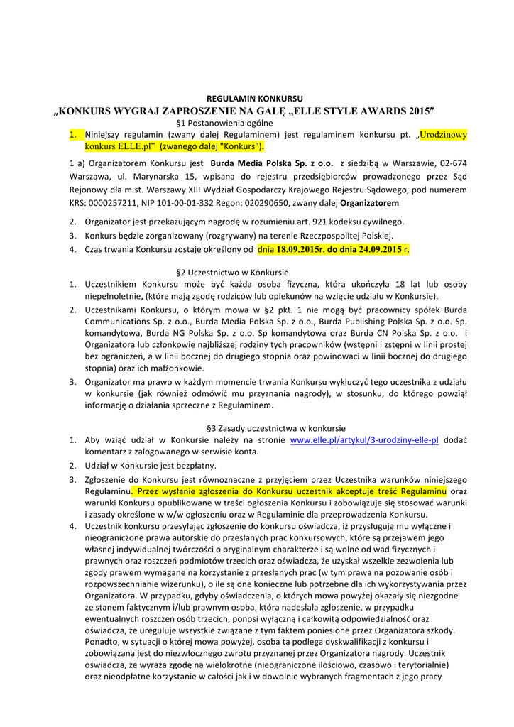 REGULAMIN KONKURSU „KONKURS WYGRAJ ZAPROSZENIE NA GALĘ „ELLE STYLE AWARDS 2015” §1 Postanowienia ogólne 1. Niniejszy regulamin (zwany dalej Regulaminem) jest regulaminem konkursu pt. „Urodzinowy konkurs ELLE.pl” (zwanego dalej "Konkurs"). 1 a) Organizatorem Konkursu jest Burda Media Polska Sp. z o.o. z siedzibą w Warszawie, 02-‐674 Warszawa, ul. Marynarska 15, wpisana do rejestru przedsiębiorców prowadzonego przez Sąd Rejonowy dla m.st. Warszawy XIII Wydział Gospodarczy Krajowego Rejestru Sądowego, pod numerem KRS: 0000257211, NIP 101-‐00-‐01-‐332 Regon: 020290650, zwany dalej Organizatorem 2. Organizator jest przekazującym nagrodę w rozumieniu art. 921 kodeksu cywilnego. 3. Konkurs będzie zorganizowany (rozgrywany) na terenie Rzeczpospolitej Polskiej. 4. Czas trwania Konkursu zostaje określony od dnia 18.09.2015r. do dnia 24.09.2015 r. §2 Uczestnictwo w Konkursie 1. Uczestnikiem Konkursu może być każda osoba fizyczna, która ukończyła 18 lat lub osoby niepełnoletnie, (które mają zgodę rodziców lub opiekunów na wzięcie udziału w Konkursie). 2. Uczestnikami Konkursu, o którym mowa w §2 pkt. 1 nie mogą być pracownicy spółek Burda Communications Sp. z o.o., Burda Media Polska Sp. z o.o., Burda Publishing Polska Sp. z o.o. Sp. komandytowa, Burda NG Polska Sp. z o.o. Sp komandytowa oraz Burda CN Polska Sp. z o.o. i Organizatora lub członkowie najbliższej rodziny tych pracowników (wstępni i zstępni w linii prostej bez ograniczeń, a w linii bocznej do drugiego stopnia oraz powinowaci w linii bocznej do drugiego stopnia) oraz ich małżonkowie. 3. Organizator ma prawo w każdym momencie trwania Konkursu wykluczyć tego uczestnika z udziału w konkursie (jak również odmówić mu przyznania nagrody), w stosunku, do którego powziął informację o działania sprzeczne z Regulaminem. §3 Zasady uczestnictwa w konkursie 1. Aby wziąć udział w Konkursie należy na stronie www.elle.pl/artykul/3-‐urodziny-‐elle-‐pl dodać komentarz z zalogowanego w serwisie konta. 2. Udział w Konkursie jest bezpłatny. 3. Zgłoszenie do Konkursu jest równoznaczne z przyjęciem przez Uczestnika warunków niniejszego Regulaminu. Przez wysłanie zgłoszenia do Konkursu uczestnik akceptuje treść Regulaminu oraz warunki Konkursu opublikowane w treści ogłoszenia Konkursu i zobowiązuje się stosować warunki i zasady określone w w/w ogłoszeniu oraz w Regulaminie dla przeprowadzenia Konkursu. 4. Uczestnik konkursu przesyłając zgłoszenie do konkursu oświadcza, iż przysługują mu wyłączne i nieograniczone prawa autorskie do przesłanych prac konkursowych, które są przejawem jego własnej indywidualnej twórczości o oryginalnym charakterze i są wolne od wad fizycznych i prawnych oraz roszczeń podmiotów trzecich oraz oświadcza, że uzyskał wszelkie zezwolenia lub zgody prawem wymagane na korzystanie z przesłanych prac (w tym prawa na pozowanie osób i rozpowszechnianie wizerunku), o ile są one konieczne lub potrzebne dla ich wykorzystywania przez Organizatora. W przypadku, gdyby oświadczenia, o których mowa powyżej okazały się niezgodne ze stanem faktycznym i/lub prawnym osoba, która nadesłała zgłoszenie, w przypadku ewentualnych roszczeń osób trzecich, ponosi wyłączną i całkowitą odpowiedzialność oraz oświadcza, że ureguluje wszystkie związane z tym faktem poniesione przez Organizatora szkody. Ponadto, w sytuacji o której mowa powyżej, osoba ta podlega dyskwalifikacji z konkursu i zobowiązana jest do niezwłocznego zwrotu przyznanej przez Organizatora nagrody. Uczestnik oświadcza, że wyraża zgodę na wielokrotne (nieograniczone ilościowo, czasowo i terytorialnie) oraz nieodpłatne korzystanie w całości jak i w dowolnie wybranych fragmentach z jego pracy konkursowej (zgłoszenia) przez Organizatora oraz firmy powiązane z Organizatorem kapitałowo lub osobowo w sposób pośredni lub bezpośredni jak również przez podmioty wskazane przez Organizatora na wszystkich znanych polach eksploatacji, a w szczególności: a. Utrwalanie i zwielokrotnianie drukiem lub podobną techniką, w tym fotokopiowanie i mikrokopiowanie; b. Wydawanie (publikowanie) i rozpowszechnianie we wszystkich wydaniach, niezależnie od formy, standardu, systemu lub formatu, bez ograniczenia liczby nakładów, wydań oraz egzemplarzy; obejmuje to także prawo do częściowego lub całkowitego przedruku (przed i po produkcji), w tym na fotokopiach, mikrokopiach i mikroreprodukcjach, a także do powielania w inny sposób; c. Wprowadzanie do pamięci komputera i sporządzanie kopii takich zapisów dla potrzeb eksploatacji oraz trwała lub czasowe zwielokrotnianie komputerowego zapisu w całości lub w części dowolnymi środkami i w dowolnej formie; d. Wykorzystywanie do celów marketingowych, w tym reklamy, promocji, oznaczenia lub identyfikacji Organizatora; obejmuje to również utrwalanie i zwielokrotnianie poligraficzne oraz wykorzystanie tych utrwaleń; utrwalanie audiowizualne dowolną techniką niezależnie do standardu, systemu i formatu; nadanie za pomocą wizji lub fonii przewodowej lub bezprzewodowej przy pomocy dowolnych środków technicznych, w tym nadawanie za pośrednictwem satelity; nagrywanie na urządzeniach służących do wielokrotnego odtwarzania za pomocą nośników dźwięku i obrazu, w tym powielania, rozpowszechniania i odtwarzania nagrań, przekazywanie, odtwarzanie i emitowanie w audycjach w środkach masowego przekazu, po utrwaleniu na nośnikach dźwięku i/lub obrazu; e. Publiczne udostępnianie w taki sposób, aby każdy mógł mieć do niego dostęp w miejscu i czasie przez siebie wybranym w tym w dowolnych – elektronicznym, cyfrowym itp. kanale komunikacji publicznej; f. Wprowadzanie do obrotu, rozpowszechnianie egzemplarzy oraz ich kopii. Uczestnik Konkursu udziela Organizatorowi na podstawie niniejszego postanowienia zezwolenia na korzystanie z zależnych praw autorskich na wszystkich polach eksploatacji