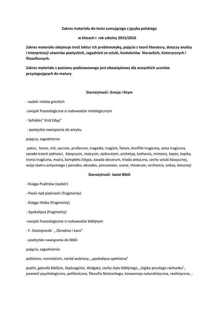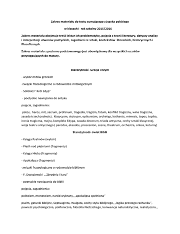 Zakres materiału do testu sumującego z języka polskiego w klasach I rok szkolny 2015/2016 Zakres materiału obejmuje treść lektur ich problematykę, pojęcia z teorii literatury, dotyczy analizy i interpretacji utworów poetyckich, zagadnień ze sztuki, kontekstów literackich, historycznych i filozoficznych. Zakres materiału z poziomu podstawowego jest obowiązkowy dla wszystkich uczniów przystępujących do matury. Starożytność- Grecja i Rzym - wybór mitów greckich -związki frazeologiczne o rodowodzie mitologicznym - Sofokles” Król Edyp” - poetyckie nawiązania do antyku pojęcia, zagadnienia: patos, heros, mit, sacrum, profanum, tragedia, tragizm, fatum, konflikt tragiczny, wina tragiczna, zasada trzech jedności, klasycyzm, stoicyzm, epikureizm, archetyp, katharsis, mimesis, topos, topika, ironia tragiczna, mojra, kompleks Edypa, zasada decorum, triada antyczna, cechy sztuki klasycznej, wizja teatru antycznego ( parodos, eksodos, proscenion, scene, theatrum, orchestra, onkos, koturny) Starożytność- świat Biblii - Księga Psalmów (wybór) - Pieśń nad pieśniami (fragmenty) - Księga Hioba (fragmenty) - Apokalipsa (fragmenty) -związki frazeologiczne o rodowodzie biblijnym - F. Dostojewski „ Zbrodnia i kara” - poetyckie nawiązania do Biblii pojęcia, zagadnienia: politeizm, monoteizm, naród wybrany, „apokalipsa spełniona” psalm, gatunki biblijne, Septuaginta, Wulgata, cechy stylu biblijnego, „logika prostego rachunku”, powieść psychologiczna, polifoniczna, filozofia Nietzschego, konwencja naturalistyczna, realistyczna, , gatunki biblijne, stylizacja biblijna, paralelizm kompozycyjny, trójjęzyczność Biblii, sposoby nawiązań do Biblii, dzieła sztuki nawiązujące do Biblii Średniowiecze - „Bogurodzica” - „Posłuchajcie bracia miła…” - „Dżuma” A. Camusa - nawiązania poetyckie do średniowiecza pojęcia, zagadnienia: uniwersalizm, teocentryzm, hierarchia, pośrednictwo, deesis, pieta, pasja, lament, historiografia hagiografia, asceza, franciszkanizm, augustynizm, tomizm, styl romański, styl gotycki, plankt, misterium,, apokryf, scholastyka, staabat mater dolorosa, wiersz średniowieczny, powieść-parabola, moralitet, dramat liturgiczny, artyzm, hymn, pieśń, cechy sztuki średniowiecznej, gatunki średniowiecza, wzorce osobowe, scholastyka Renesans - J. Kochanowski” Pieśni” (XXIV, XXV, XIX), „Treny”(9, 10, 11, 19) - J. Kochanowski „Psałterz Dawidów” - W. Szekspir” Makbet” - poetyckie nawiązania do renesansu pojęcia, zagadnienia: renesans (odrodzenie), humanizm, antropocentryzm, reformacja, klasycyzm renesansowy, wzorce osobowe, pieśń, hymn, tren, psałterz, neoklasycyzm, humanizm, mecenat, cechy sztuki renesansowej, cechy stylu renesansowego, poeta doctus, filozofie antyczne, wizja teatru elżbietańskiego, cechy dramaturgii Szekspira poziom rozszerzony Poeci greccy: Safona, Anakreont, Tyrteusz. Poeci rzymscy: Owidiusz i Wergiliusz. Gatunki liryczne: hymn, oda, anakreontyk, pieśń, elegia. Arystoteles: Poetyka (O tragedii, O sztuce naśladowczej) Horacy: Ars poetica, Exegi monumentum, Do Leukone, Do Deliusza. Filozofia starożytna- epikureizm, stoicyzm, platonizm, cynizm. Marek Aureliusz „Rozmyślania”, Platon „niewolnicy w jaskini”. Filozofia: Sokratesa, Platona, Arystotelesa. Nawiązania do antyku: Z. Herbert: do Marka Aurelego, Historia Minotaura, Dlaczego klasycy. Gatunki publicystyczne. Formy wypowiedzi pisemnych: rozprawka, esej, szkic, reportaż, recenzja. Wybrane motywy i postaci biblijne, gatunki biblijne :psalm, przypowieść, księgi dydaktyczne i prorockie. Styl biblijny. Sposoby i formy nawiązań do Biblii w sztuce późniejszych epok: Rembrandt, Caravaggio, Bosch, Memling, Holbein. Literatura: „Mistrz i Małgorzata” M. Bułhakowa, Z. Herbert – Siódmy Anioł, Jan Paweł II – Tryptyk rzymski, K.K. Baczyński – Przypowieść. Hymn o miłości św. Pawła. Stylizacja, pastisz, trawestacja, parodia, parafraza- podobieństwa i różnice. Struktura znaczenia leksemu; mechanizmy powstawania znaczeń (metafora, metonimia).Językowy obraz świata. - Funkcje języka. Tekst linearny i hipertekst. mgr A. Benduska