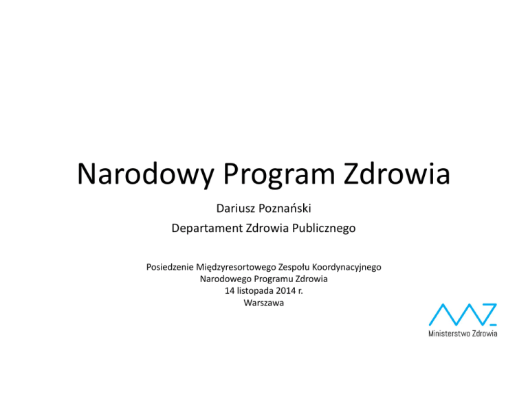 Narodowy Program Zdrowia Dariusz Poznański Departament Zdrowia Publicznego Posiedzenie Międzyresortowego Zespołu Koordynacyjnego Narodowego Programu Zdrowia 14 listopada 2014 r. Warszawa Narodowy Program Zdrowia na lata 2007‐2015 Finansowanie działań z zakresu zdrowia publicznego realizowanych w Polsce 1. Programy zdrowotne Ministra Zdrowia w 2013 r. (np. Narodowy Program Zwalczania Chorób Nowotworowych – łącznie 14 działań) 1 432 801 190 zł 2. Działania w ramach profilaktyki HIV/AIDS w 2012 r. (w tym leczenie osób z HIV) 284 771 000 zł 3. Krajowy Program Przeciwdziałania Narkomanii w 2012 r. (ministerstwa, NFZ, jednostki samorządu terytorialnego) 162 194 306 zł 4. Narodowy Program Ochrony Zdrowia Psychicznego w 2012 r. 241 751 481 zł Finansowanie działań z zakresu zdrowia publicznego realizowanych w Polsce 5. Działania w ramach Programu Ograniczania Następstw Palenia Tytoniu w 2012 r. (ministerstwa, inspekcja sanitarna) 860 989 zł 6. Finansowanie realizacji zadań wynikających z ustawy o wychowaniu w trzeźwości i przeciwdziałaniu alkoholizmowi w 2012 r. 661 380 026 zł 7. Programy zdrowotne realizowane przez jednostki samorządu terytorialnego w ramach Narodowego Programu Zdrowia w 2012 r. (4 058 działań) 95 926 000 zł Powyższych kwot nie należy sumować, z uwagi na potencjalnie możliwe wykazywanie programów przez realizatorów w więcej niż jednym sprawozdaniu. Jednostki samorządu terytorialnego Liczba programów zdrowotnych realizowanych w 2012 r., wpisujących się we wszystkie cele operacyjne Narodowego Programu Zdrowia, wg województw. Jednostki samorządu terytorialnego Liczba osób objętych programami zdrowotnymi w ramach realizacji celów i zadań Narodowego Programu Zdrowia w 2012 r. Narodowy Program Zdrowia na lata 2016‐? Monitorowanie działań samorządowych • Monitoring przez wojewodów w oparciu o ustawę o świadczeniach opieki zdrowotnej (gmina‐>powiat‐>województwo‐>wojewoda) • Zmiana w rozporządzeniu Ministra Zdrowia w sprawie gromadzenia danych Analiza programów rządowych MEN "Perspektywa uczenia się przez całe życie" MEN Rządowy Program "Bezpieczna i Przyjazna Szkoła" MPiPS "Pomoc Państwa w zakresie dożywiania" na lata 2014‐2020 MPiPS Krajowy "Program Przeciwdziałania Przemocy w Rodzinie" na lata 2014‐2020 MPiPS Poprawa bezpieczeństwa i warunków pracy ‐ III etap na lata 2014‐2016 MPiPS Krajowy Program Przeciwdziałania Ubóstwu i Wykluczeniu Społecznemu 2020 MPiPS Program Solidarność pokoleń Działania dla zwiększenia aktywności zawodowej osób w wieku 50+ MSW Program ratownictwa i ochrony ludności na lata 2014‐2020 ... ... Dziękuję za uwagę Ministerstwo Zdrowia Departament Zdrowia Publicznego