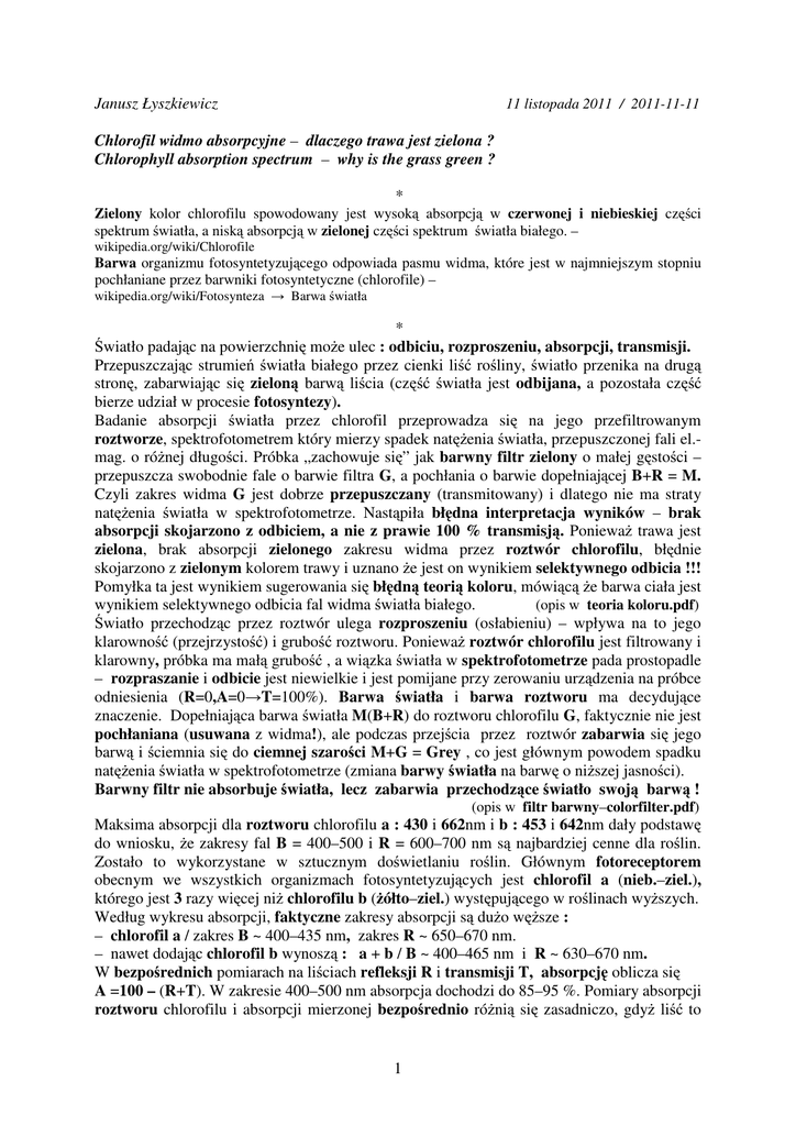 Janusz Łyszkiewicz 11 listopada 2011 / 2011-11-11 Chlorofil widmo absorpcyjne – dlaczego trawa jest zielona ? Chlorophyll absorption spectrum – why is the grass green ? * Zielony kolor chlorofilu spowodowany jest wysoką absorpcją w czerwonej i niebieskiej części spektrum światła, a niską absorpcją w zielonej części spektrum światła białego. – wikipedia.org/wiki/Chlorofile Barwa organizmu fotosyntetyzującego odpowiada pasmu widma, które jest w najmniejszym stopniu pochłaniane przez barwniki fotosyntetyczne (chlorofile) – wikipedia.org/wiki/Fotosynteza → Barwa światła * Światło padając na powierzchnię może ulec : odbiciu, rozproszeniu, absorpcji, transmisji. Przepuszczając strumień światła białego przez cienki liść rośliny, światło przenika na drugą stronę, zabarwiając się zieloną barwą liścia (część światła jest odbijana, a pozostała część bierze udział w procesie fotosyntezy). Badanie absorpcji światła przez chlorofil przeprowadza się na jego przefiltrowanym roztworze, spektrofotometrem który mierzy spadek natężenia światła, przepuszczonej fali el.mag. o różnej długości. Próbka „zachowuje się” jak barwny filtr zielony o małej gęstości – przepuszcza swobodnie fale o barwie filtra G, a pochłania o barwie dopełniającej B+R = M. Czyli zakres widma G jest dobrze przepuszczany (transmitowany) i dlatego nie ma straty natężenia światła w spektrofotometrze. Nastąpiła błędna interpretacja wyników – brak absorpcji skojarzono z odbiciem, a nie z prawie 100 % transmisją. Ponieważ trawa jest zielona, brak absorpcji zielonego zakresu widma przez roztwór chlorofilu, błędnie skojarzono z zielonym kolorem trawy i uznano że jest on wynikiem selektywnego odbicia !!! Pomyłka ta jest wynikiem sugerowania się błędną teorią koloru, mówiącą że barwa ciała jest wynikiem selektywnego odbicia fal widma światła białego. (opis w teoria koloru.pdf) Światło przechodząc przez roztwór ulega rozproszeniu (osłabieniu) – wpływa na to jego klarowność (przejrzystość) i grubość roztworu. Ponieważ roztwór chlorofilu jest filtrowany i klarowny, próbka ma małą grubość , a wiązka światła w spektrofotometrze pada prostopadle – rozpraszanie i odbicie jest niewielkie i jest pomijane przy zerowaniu urządzenia na próbce odniesienia (R=0,A=0→T=100%). Barwa światła i barwa roztworu ma decydujące znaczenie. Dopełniająca barwa światła M(B+R) do roztworu chlorofilu G, faktycznie nie jest pochłaniana (usuwana z widma!), ale podczas przejścia przez roztwór zabarwia się jego barwą i ściemnia się do ciemnej szarości M+G = Grey , co jest głównym powodem spadku natężenia światła w spektrofotometrze (zmiana barwy światła na barwę o niższej jasności). Barwny filtr nie absorbuje światła, lecz zabarwia przechodzące światło swoją barwą ! (opis w filtr barwny–colorfilter.pdf) Maksima absorpcji dla roztworu chlorofilu a : 430 i 662nm i b : 453 i 642nm dały podstawę do wniosku, że zakresy fal B = 400–500 i R = 600–700 nm są najbardziej cenne dla roślin. Zostało to wykorzystane w sztucznym doświetlaniu roślin. Głównym fotoreceptorem obecnym we wszystkich organizmach fotosyntetyzujących jest chlorofil a (nieb.–ziel.), którego jest 3 razy więcej niż chlorofilu b (żółto–ziel.) występującego w roślinach wyższych. Według wykresu absorpcji, faktyczne zakresy absorpcji są dużo węższe : – chlorofil a / zakres B ~ 400–435 nm, zakres R ~ 650–670 nm. – nawet dodając chlorofil b wynoszą : a + b / B ~ 400–465 nm i R ~ 630–670 nm. W bezpośrednich pomiarach na liściach refleksji R i transmisji T, absorpcję oblicza się A =100 – (R+T). W zakresie 400–500 nm absorpcja dochodzi do 85–95 %. Pomiary absorpcji roztworu chlorofilu i absorpcji mierzonej bezpośrednio różnią się zasadniczo, gdyż liść to 1 nie filtrowany roztwór chem. i inna jest metoda pomiaru. Zakładając że roztwór chlorofilu b absorbuje światło niebieskie w 95 %, można przeliczyć wartości ekstynkcji na %. Poziom ~50% pochłaniania, chlorofil a przekracza tylko w zakresie B : 420–435 nm i R : 660–665 nm, zaś chlorofil b w zakresie B : 440–460 nm i R : 0 nm. Dodając zakresy 50% pochłaniania chlorofili a + b, dla fal B = 15+20 = 35nm i dla fal R = 5nm, na 100 nm każdego zakresu B i R, czyli tylko : 35% fal niebieskich B i 5% fal czerwonych R przekracza poziom 50% absorpcji, a 65% fal B i 95% fal R nie jest absorbowana nawet w połowie ( tylko mniej niż 10% fal B jest absorbowana w 80% ) i jest transmitowana, gdyż w spektrofotometrze : 100 % A = 0 % T → 0 % A = 100 % T → 50 % A = 50 % T (przy R = 0) Teza, że w procesie fotosyntezy biorą udział tylko fale B i R, zaś fale G są w całości odbijane i dlatego są bezużyteczne, jest błędna – fale G są najlepiej transmitowane w roztworze chlorofilu a (~100 %), przy współudziale dużej części fal B i R ! To, że najbardziej spada natężenie światła części fal B i R, nie dowodzi że są one najbardziej wykorzystywane w fotosyntezie – dowodzi że są najbardziej ściemniane, przez filtr jakim jest roztwór chlorofilu. Jeżeli naturalnym oświetleniem roślin na Ziemi jest dzienne światło słoneczne, to sztuczne zawężanie zakresu (poprawianie natury) do fal B i R nie może być korzystne dla roślin ! Idąc dalej, słabo absorbowany zakres widma chlorofilu b : 475–630 nm to nie jest wyłącznie zakres barwy zielonej 500–560 nm. Chlorofil a, który jest głównym fotoreceptorem, transmituje jeszcze szerszy zakres 440–650 nm (są to prawie wszystkie barwy widma !). Porównując wykres absorpcji chlorofilu a z widmem emisji światła słonecznego, zakres 440–650 nm to zakres max natężenia promieniowania słonecznego, o prawie całkowitym komplecie barw, a więc cały zakres max emisji światła słonecznego jest przepuszczany przez roztwór chlorofilu. Wniosek nasuwa się s