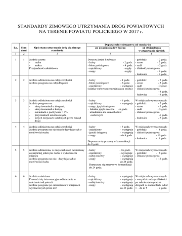 STANDARDY ZIMOWEGO UTRZYMANIA DRÓG POWIATOWYCH NA TERENIE POWIATU POLICKIEGO W 2017 r. Lp. Opis stanu utrzymania dróg dla danego standardu 3 Dopuszczalne odstępstwa od standardu po ustaniu opadów śniegu od stwierdzenia występowania zjawisk 4 5 1 Stan dard 2 1 1 Jezdnia czarna sucha mokra Przejezdność całodobowa Dotyczy jezdni i poboczy - luźny - błoto pośniegowe - zajeżdżony - zaspy 2 2 Jezdnia odśnieżona na całej szerokości Jezdnia posypana na całej długości - luźny - 4 godz. - błoto pośniegowe - 6 godz. - zajeżdżony - występuje (cienka warstwa nie utrudniająca ruchu) - gołoledź - 3 godz. - szron - 3 godz. - sadź - 3 godz. - śliskość pośniegowa - 4 godz. - lodowica - 4 godz. 3 3 Jezdnia odśnieżona na całej szerokości Jezdnia posypana na: skrzyżowaniach z drogami, skrzyżowaniach z koleją, odcinkach o pochyleniu > 4%, przystankach autobusowych, innych miejscach ustalonych przez zarząd drogi - luźny - 6 godz. - zajeżdżony - występuje - zaspy, języki śniegowe - lokalne języki śnieżne - 6 godz. utrudnienia dla samochodów osobowych W miejscach wyznaczonych: - gołoledź - 5 godz. - szron - 5 godz. - sadź - 5 godz. - śliskość pośniegowa -6 godz. - lodowica - 5 godz. 4 4 Jezdnia odśnieżona na całej szerokości Jezdnia posypana na odcinkach decydujących o możliwości ruchu - luźny - zajeżdżony - języki śniegowe - zaspy 5 5 Jezdnia odśnieżona, w miejscach zasp odśnieżony co najmniej jeden pas ruchu z wykonaniem mijanek Jezdnia posypana na odc. decydujących o możliwości ruchu - luźny - zajeżdżony - nabój śnieżny - zaspy 6 6 Jezdnia zaśnieżona Prowadzi się interwencyjne odśnieżanie w zależności od potrzeb Jezdnie posypane po odśnieżaniu w miejscach wyznaczonych przez ZD - luźny - zajeżdżony - nabój śnieżny - zaspy - gołoledź - 2 godz. - 2 godz. - szron - 2 godz. - 4 godz. - sadź - 2 godz. - nigdy - śliskość pośniegowa - nigdy - 4 godz. - lodowica - 4 godz. - 8 godz. W miejscach wyznaczonych: - występuje - gołoledź - 8 godz. - występują - śliskość pośniegowa - do 8 godz. - 10 godz. - lodowica - 8 godz. Dopuszcza się przerwy w komunikacji do 8 godz. - 16 godz. W miejscach wyznaczonych: - występuje - gołoledź - 8 godz. - występuje - śliskość pośniegowa - występują - 12 godz. do 24 godz. Dopuszcza się przerwy w komunikacji do 24 godz. - występuje - występuje - występuje - występują do 48 godz. W miejscach wyznaczonych: - wszystkie rodzaje śliskości po zakończeniu prac na drogach w standardach od nr 1 – do nr 5 – 2 godz.
