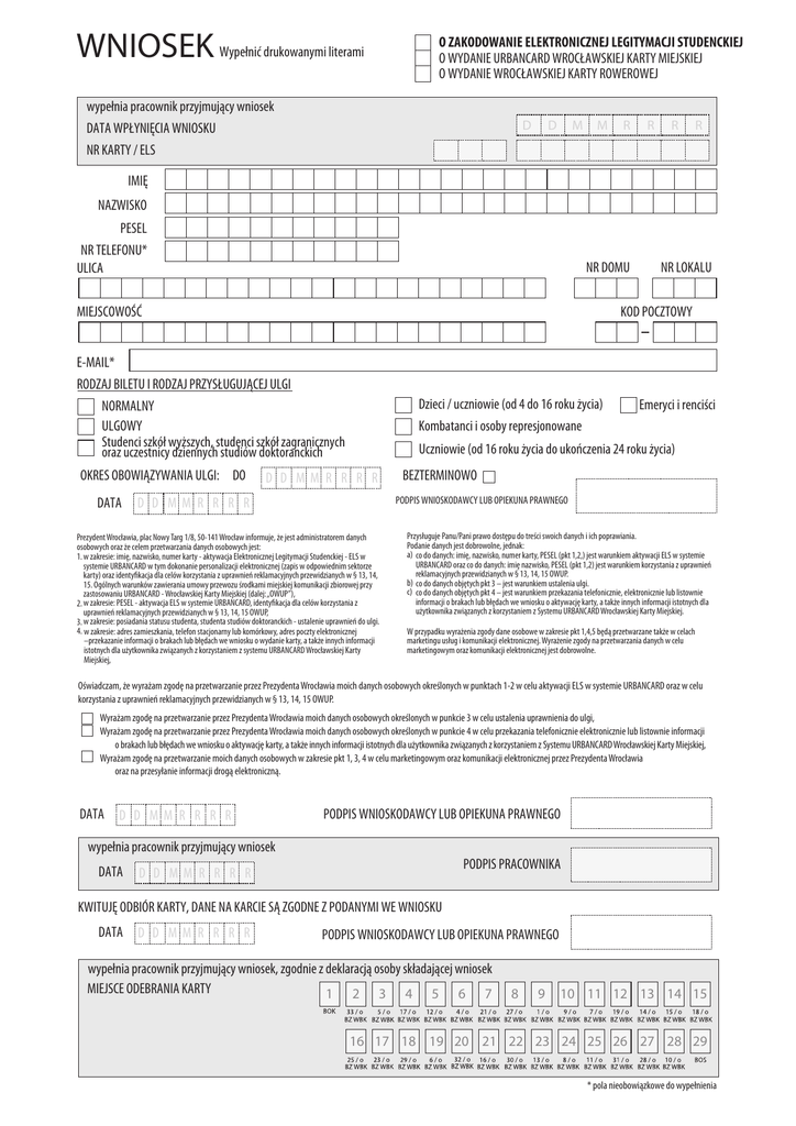 WNIOSEK Wypełnić drukowanymi literami O ZAKODOWANIE ELEKTRONICZNEJ LEGITYMACJI STUDENCKIEJ O WYDANIE URBANCARD WROCŁAWSKIEJ KARTY MIEJSKIEJ O WYDANIE WROCŁAWSKIEJ KARTY ROWEROWEJ wypełnia pracownik przyjmujący wniosek DATA WPŁYNIĘCIA WNIOSKU D D M M R R R R NR KARTY / ELS IMIĘ NAZWISKO PESEL NR TELEFONU* ULICA NR DOMU MIEJSCOWOŚĆ KOD POCZTOWY E-MAIL* RODZAJ BILETU I RODZAJ PRZYSŁUGUJĄCEJ ULGI NORMALNY ULGOWY Studenci szkół wyższych, studenci szkół zagranicznych oraz uczestnicy dziennych studiów doktoranckich OKRES OBOWIĄZYWANIA ULGI: DO DATA NR LOKALU Dzieci / uczniowie (od 4 do 16 roku życia) Emeryci i renciści Kombatanci i osoby represjonowane Uczniowie (od 16 roku życia do ukończenia 24 roku życia) D D MM R R R R BEZTERMINOWO PODPIS WNIOSKODAWCY LUB OPIEKUNA PRAWNEGO D D MM R R R R Prezydent Wrocławia, plac Nowy Targ 1/8, 50-141 Wrocław informuje, że jest administratorem danych osobowych oraz że celem przetwarzania danych osobowych jest: 1. w zakresie: imię, nazwisko, numer karty - aktywacja Elektronicznej Legitymacji Studenckiej - ELS w systemie URBANCARD w tym dokonanie personalizacji elektronicznej (zapis w odpowiednim sektorze karty) oraz identyfikacja dla celów korzystania z uprawnień reklamacyjnych przewidzianych w § 13, 14, 15. Ogólnych warunków zawierania umowy przewozu środkami miejskiej komunikacji zbiorowej przy zastosowaniu URBANCARD - Wrocławskiej Karty Miejskiej (dalej: „OWUP”), 2. w zakresie: PESEL - aktywacja ELS w systemie URBANCARD, identyfikacja dla celów korzystania z uprawnień reklamacyjnych przewidzianych w § 13, 14, 15 OWUP, 3. w zakresie: posiadania statusu studenta, studenta studiów doktoranckich - ustalenie uprawnień do ulgi. 4. w zakresie: adres zamieszkania, telefon stacjonarny lub komórkowy, adres poczty elektronicznej –przekazanie informacji o brakach lub błędach we wniosku o wydanie karty, a także innych informacji istotnych dla użytkownika związanych z korzystaniem z systemu URBANCARD Wrocławskiej Karty Miejskiej, Przysługuje Panu/Pani prawo dostępu do treści swoich danych i ich poprawiania. Podanie danych jest dobrowolne, jednak: a) co do danych: imię, nazwisko, numer karty, PESEL (pkt 1,2,) jest warunkiem aktywacji ELS w systemie URBANCARD oraz co do danych: imię nazwisko, PESEL (pkt 1,2) jest warunkiem korzystania z uprawnień reklamacyjnych przewidzianych w § 13, 14, 15 OWUP. b) co do danych objętych pkt 3 – jest warunkiem ustalenia ulgi. c) co do danych objętych pkt 4 – jest warunkiem przekazania telefonicznie, elektronicznie lub listownie informacji o brakach lub błędach we wniosku o aktywację karty, a także innych informacji istotnych dla użytkownika związanych z korzystaniem z Systemu URBANCARD Wrocławskiej Karty Miejskiej. W przypadku wyrażenia zgody dane osobowe w zakresie pkt 1,4,5 będą przetwarzane także w celach marketingu usług i komunikacji elektronicznej. Wyrażenie zgody na przetwarzania danych w celu marketingowym oraz komunikacji elektronicznej jest dobrowolne. Oświadczam, że wyrażam zgodę na przetwarzanie przez Prezydenta Wrocławia moich danych osobowych określonych w punktach 1-2 w celu aktywacji ELS w systemie URBANCARD oraz w celu korzystania z uprawnień reklamacyjnych przewidzianych w § 13, 14, 15 OWUP. Wyrażam zgodę na przetwarzanie przez Prezydenta Wrocławia moich danych osobowych określonych w punkcie 3 w celu ustalenia uprawnienia do ulgi, Wyrażam zgodę na przetwarzanie przez Prezydenta Wrocławia moich danych osobowych określonych w punkcie 4 w celu przekazania telefonicznie elektronicznie lub listownie informacji o brakach lub błędach we wniosku o aktywację karty, a także innych informacji istotnych dla użytkownika związanych z korzystaniem z Systemu URBANCARD Wrocławskiej Karty Miejskiej, Wyrażam zgodę na przetwarzanie moich danych osobowych w zakresie pkt 1, 3, 4 w celu marketingowym oraz komunikacji elektronicznej przez Prezydenta Wrocławia oraz na przesyłanie informacji drogą elektroniczną. DATA D D MM R R R R PODPIS WNIOSKODAWCY LUB OPIEKUNA PRAWNEGO wypełnia pracownik przyjmujący wniosek DATA PODPIS PRACOWNIKA D D MM R R R R KWITUJĘ ODBIÓR KARTY, DANE NA KARCIE SĄ ZGODNE Z PODANYMI WE WNIOSKU DATA D D MM R R R R PODPIS WNIOSKODAWCY LUB OPIEKUNA PRAWNEGO wypełnia pracownik przyjmujący wniosek, zgodnie z deklaracją osoby składającej wniosek MIEJSCE ODEBRANIA KARTY 1 2 3 4 5 6 7 8 9 10 11 12 13 14 15 16 17 18 19 20 21 22 23 24 25 26 27 28 29 * pola nieobowiązkowe do wypełnienia