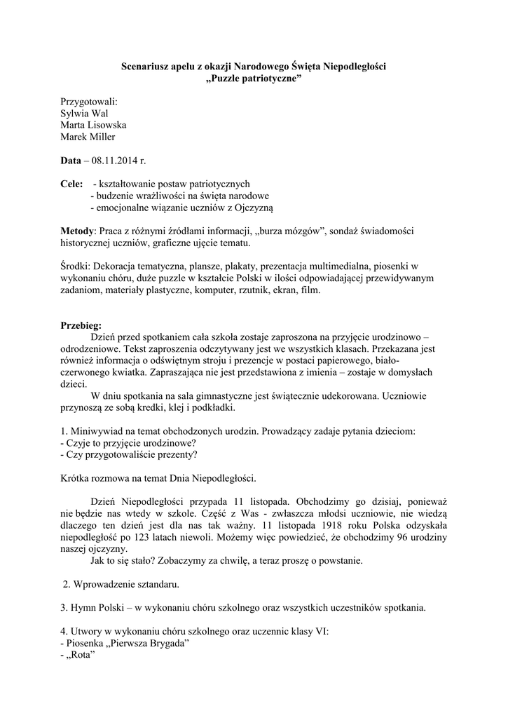 Scenariusz apelu z okazji Narodowego Święta Niepodległości „Puzzle patriotyczne” Przygotowali: Sylwia Wal Marta Lisowska Marek Miller Data – 08.11.2014 r. Cele: - kształtowanie postaw patriotycznych - budzenie wrażliwości na święta narodowe - emocjonalne wiązanie uczniów z Ojczyzną Metody: Praca z różnymi źródłami informacji, „burza mózgów”, sondaż świadomości historycznej uczniów, graficzne ujęcie tematu. Środki: Dekoracja tematyczna, plansze, plakaty, prezentacja multimedialna, piosenki w wykonaniu chóru, duże puzzle w kształcie Polski w ilości odpowiadającej przewidywanym zadaniom, materiały plastyczne, komputer, rzutnik, ekran, film. Przebieg: Dzień przed spotkaniem cała szkoła zostaje zaproszona na przyjęcie urodzinowo – odrodzeniowe. Tekst zaproszenia odczytywany jest we wszystkich klasach. Przekazana jest również informacja o odświętnym stroju i prezencje w postaci papierowego, białoczerwonego kwiatka. Zapraszająca nie jest przedstawiona z imienia – zostaje w domysłach dzieci. W dniu spotkania na sala gimnastyczne jest świątecznie udekorowana. Uczniowie przynoszą ze sobą kredki, klej i podkładki. 1. Miniwywiad na temat obchodzonych urodzin. Prowadzący zadaje pytania dzieciom: - Czyje to przyjęcie urodzinowe? - Czy przygotowaliście prezenty? Krótka rozmowa na temat Dnia Niepodległości. Dzień Niepodległości przypada 11 listopada. Obchodzimy go dzisiaj, ponieważ nie będzie nas wtedy w szkole. Część z Was - zwłaszcza młodsi uczniowie, nie wiedzą dlaczego ten dzień jest dla nas tak ważny. 11 listopada 1918 roku Polska odzyskała niepodległość po 123 latach niewoli. Możemy więc powiedzieć, że obchodzimy 96 urodziny naszej ojczyzny. Jak to się stało? Zobaczymy za chwilę, a teraz proszę o powstanie. 2. Wprowadzenie sztandaru. 3. Hymn Polski – w wykonaniu chóru szkolnego oraz wszystkich uczestników spotkania. 4. Utwory w wykonaniu chóru szkolnego oraz uczennic klasy VI: - Piosenka „Pierwsza Brygada” - „Rota” - Piosenka „Wojenko, wojenko” 5. Wyprowadzenie sztandaru. 6. PUZZLE 1. Każda z klas deleguje swoich trzech przedstawicieli na środek sali. Uczniowie dostają puzzle, z których ułożyć mają plakaty i znaki związane z odzyskaniem niepodległości. Trudność dostosowana jest do wieku dzieci. Uczniowie układają i sklejają fragmenty, po czym pokazują swoją pracę. 7. Krótka prezentacja multimedialna przedstawiająca w sposób przystępny dla najmłodszych historię zaborów i odzyskania niepodległości przez Polskę oraz osób które walczyły za ojczyznę. 8. Animowany film edukacyjny – „Historia Polski” 8. Odpowiedzi uczniów na pytanie: Co łączyło części kraju w całość? (burza mózgów) 9. PUZZLE 2. Przydzielenie dzieciom zadań do pracy w grupach. Uczniowie otrzymują po jednym lub więcej puzzli Polski (klocek patriotyczny) oraz realizuje przydzielony temat. Klasa I – gr. 1 – godło Polski – malowanka - gr. 2 – flaga Polski – malowanka - gr. 3 - hymn (nuty na pięciolinii) - malowanka Klasa II – gr. 1 - Kuchnia Polska - gr. 2 – Zwierzęta Polski Klasa III - Panteon sław narodowych Klasa IV - Pejzaż Polski Klasa V gr. 1 - Legendy Polskie gr. 2 – Miasta Polskie Klasa VI - Tradycje i zwyczaje Zadanie dobiega końca. Dzieci przyklejają swoje prace do fragmentu Polski. Kiedy wszystkie puzzle są już gotowe, dwójka dzieci z każdej z grup przykleja swojego puzzla do dużej planszy z mapą Polski. Zaczyna klasa VI i kolejne (malejąco). 10. Przypomnienie wszystkiego, co łączyło Polaków i jednoczyło ich w czasie zaborów. 11. Przyklejanie biało czerwonych kwiatów dookoła wyklejonej Polski. 12. Pożegnanie się.