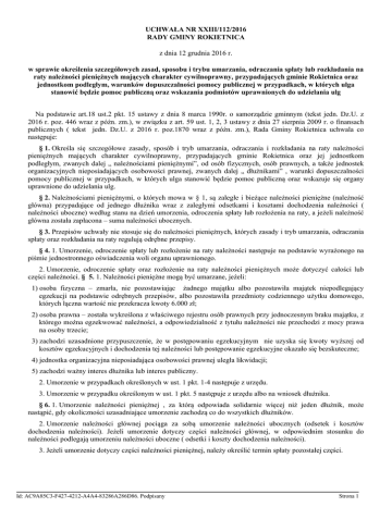 UCHWAŁA NR XXIII/112/2016 RADY GMINY ROKIETNICA z dnia 12 grudnia 2016 r. w sprawie określenia szczegółowych zasad, sposobu i trybu umarzania, odraczania spłaty lub rozkładania na raty należności pieniężnych mających charakter cywilnoprawny, przypadających gminie Rokietnica oraz jednostkom podległym, warunków dopuszczalności pomocy publicznej w przypadkach, w których ulga stanowić będzie pomoc publiczną oraz wskazania podmiotów uprawnionych do udzielania ulg Na podstawie art.18 ust.2 pkt. 15 ustawy z dnia 8 marca 1990r. o samorządzie gminnym (tekst jedn. Dz.U. z 2016 r. poz. 446 wraz z późn. zm.), w związku z art. 59 ust. 1, 2, 3 ustawy z dnia 27 sierpnia 2009 r. o finansach publicznych ( tekst jedn. Dz.U. z 2016 r. poz.1870 wraz z późn. zm.), Rada Gminy Rokietnica uchwala co następuje: § 1. Określa się szczegółowe zasady, sposób i tryb umarzania, odraczania i rozkładania na raty należności pieniężnych mających charakter cywilnoprawny, przypadających gminie Rokietnica oraz jej jednostkom podległym, zwanych dalej „ należnościami pieniężnymi”, od osób fizycznych, osób prawnych, a także jednostek organizacyjnych nieposiadających osobowości prawnej, zwanych dalej „ dłużnikami” , warunki dopuszczalności pomocy publicznej w przypadkach, w których ulga stanowić będzie pomoc publiczną oraz wskazuje się organy uprawnione do udzielania ulg. § 2. Należnościami pieniężnymi, o których mowa w § 1, są zaległe i bieżące należności pieniężne (należność główna) przypadające od jednego dłużnika wraz z zaległymi odsetkami i kosztami dochodzenia należności ( należności uboczne) według stanu na dzień umorzenia, odroczenia spłaty lub rozłożenia na raty, a jeżeli należność główna została zapłacona – suma należności ubocznych. § 3. Przepisów uchwały nie stosuje się do należności pieniężnych, których zasady i tryb umarzania, odraczania spłaty oraz rozkładania na raty regulują odrębne przepisy. § 4. 1. Umorzenie, odroczenie spłaty lub rozłożenie na raty należności następuje na podstawie wyrażonego na piśmie jednostronnego oświadczenia woli organu uprawnionego. 2. Umorzenie, odroczenie spłaty oraz rozłożenie na raty należności pieniężnych może dotyczyć całości lub części należności. § 5. 1. Należności pieniężne mogą być umarzane, jeżeli: 1) osoba fizyczna – zmarła, nie pozostawiając żadnego majątku albo pozostawiła majątek niepodlegający egzekucji na podstawie odrębnych przepisów, albo pozostawiła przedmioty codziennego użytku domowego, których łączna wartość nie przekracza kwoty 6.000 zł; 2) osoba prawna – została wykreślona z właściwego rejestru osób prawnych przy jednoczesnym braku majątku, z którego można egzekwować należności, a odpowiedzialność z tytułu należności nie przechodzi z mocy prawa na osoby trzecie; 3) zachodzi uzasadnione przypuszczenie, że w postępowaniu egzekucyjnym nie uzyska się kwoty wyższej od kosztów egzekucyjnych i dochodzenia tej należności lub postępowanie egzekucyjne okazało się bezskuteczne; 4) jednostka organizacyjna nieposiadająca osobowości prawnej uległa likwidacji; 5) zachodzi ważny interes dłużnika lub interes publiczny. 2. Umorzenie w przypadkach określonych w ust. 1 pkt. 1-4 następuje z urzędu. 3. Umorzenie w przypadku określonym w ust. 1 pkt. 5 następuje z urzędu albo na wniosek dłużnika. § 6. 1. Umorzenie należności pieniężnej , za którą odpowiada solidarnie więcej niż jeden dłużnik, może nastąpić, gdy okoliczności uzasadniające umorzenie zachodzą co do wszystkich dłużników. 2. Umorzenie należności głównej pociąga za sobą umorzenie należności ubocznych (odsetek i kosztów dochodzenia należności). Jeżeli umorzenie dotyczy części należności głównej, w odpowiednim stosunku do należności podlegają umorzeniu należności uboczne ( odsetki i koszty dochodzenia należności). 3. Jeżeli umorzenie dotyczy części należności pieniężnej, należy określić termin spłaty pozostałej części. Id: AC9A85C3-F427-4212-A4A4-83286A286D86. Podpisany Strona 1 4. W przypadku , gdy dłużnik nie dotrzymał terminu zapłaty, umorzenie może być cofnięte, § 4 ust. 1 uchwały stosuje się odpowiednio. § 7. 1. 1. W przypadkach uzasadnionych ważnym interesem dłużnika lub interesem publicznym albo względami społecznymi, na wniosek dłużnika, termin spłaty należności pieniężnej może zostać odroczony albo należność pieniężna może zostać rozłożona na raty. Okres na który odroczono spłatę należności albo rozłożono należności na raty, nie może przekraczać przewidzianego prawem okresu przedawnienia należności. 2. Od należności, której termin spłaty odroczono albo rozłożono na raty, nie pobiera się odsetek za zwłokę za okres od dnia wydania oświadczenia woli, o którym mowa w § 4 ust. 1 , do dnia upływu terminu spłaty albo terminów zapłaty poszczególnych rat. 3. W razie przekroczenia przez dłużnika odroczonego terminu spłaty należności albo nieuiszczenia w terminie lub w pełnej wysokości ustalonych rat, przedmiotowe należności pieniężne stają się natychmiast wymagalne wraz z należytymi odsetkami, o których mowa w ust. 2. 4. Za termin zapłaty przyjmuje się dzień uznania rachunku bankowego wierzyciela. § 8. Organem uprawnionym do umorzenia, odroczenia spłaty i rozłożenia na raty należności pieniężnych, o których mowa w § 1 i 2, jest Wójt Gminy Rokietnica. § 9. 1. Ulgi udzielone na podstawie niniejszej uchwały w odniesieniu do działalności gospodarczej prowadzonej przez dłużnika, określone w § 5 ust.1 pkt.5 i § 7 ust.1 mogą stanowić pomoc de mini mis, a ich udzielanie następuje zgodnie z rozporządzeniem Komisji (WE) nr 1998/2006 z dnia 15 grudnia 2006 r. w sprawie stosowania art. 87 i 88 Traktatu o pomocy de mini mis ( Dz.Urz. UE nr 379 z 28 grudnia 2006 r.)