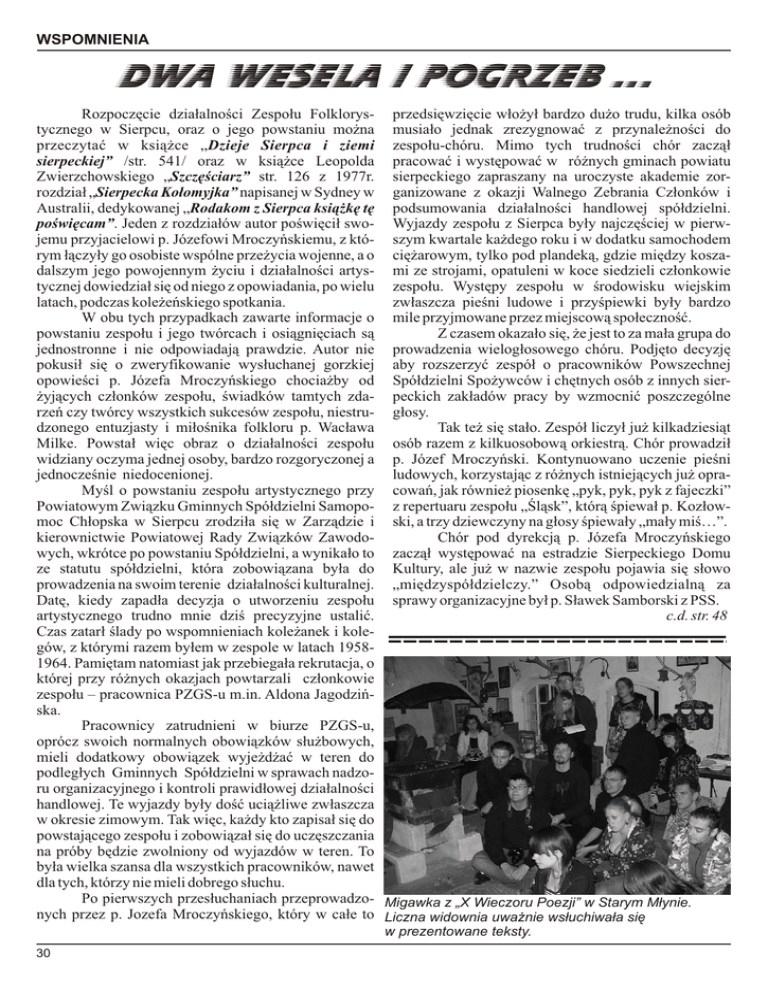 WSPOMNIENIA Dwa wesela i pogrzeb ... Rozpoczêcie dzia³alnoœci Zespo³u Folklorys- przedsiêwziêcie w³o¿y³ bardzo du¿o trudu, kilka osób tycznego w Sierpcu, oraz o jego powstaniu mo¿na musia³o jednak zrezygnowaæ z przynale¿noœci do przeczytaæ w ksi¹¿ce „Dzieje Sierpca i ziemi zespo³u-chóru. Mimo tych trudnoœci chór zacz¹³ sierpeckiej” /str. 541/ oraz w ksi¹¿ce Leopolda pracowaæ i wystêpowaæ w ró¿nych gminach powiatu Zwierzchowskiego „Szczêœciarz” str. 126 z 1977r. sierpeckiego zapraszany na uroczyste akademie zorrozdzia³ „Sierpecka Ko³omyjka” napisanej w Sydney w ganizowane z okazji Walnego Zebrania Cz³onków i Australii, dedykowanej „Rodakom z Sierpca ksi¹¿kê tê podsumowania dzia³alnoœci handlowej spó³dzielni. poœwiêcam”. Jeden z rozdzia³ów autor poœwiêci³ swo- Wyjazdy zespo³u z Sierpca by³y najczêœciej w pierwjemu przyjacielowi p. Józefowi Mroczyñskiemu, z któ- szym kwartale ka¿dego roku i w dodatku samochodem rym ³¹czy³y go osobiste wspólne prze¿ycia wojenne, a o ciê¿arowym, tylko pod plandek¹, gdzie miêdzy koszadalszym jego powojennym ¿yciu i dzia³alnoœci artys- mi ze strojami, opatuleni w koce siedzieli cz³onkowie tycznej dowiedzia³ siê od niego z opowiadania, po wielu zespo³u. Wystêpy zespo³u w œrodowisku wiejskim latach, podczas kole¿eñskiego spotkania. zw³aszcza pieœni ludowe i przyœpiewki by³y bardzo W obu tych przypadkach zawarte informacje o mile przyjmowane przez miejscow¹ spo³ecznoœæ. powstaniu zespo³u i jego twórcach i osi¹gniêciach s¹ Z czasem okaza³o siê, ¿e jest to za ma³a grupa do jednostronne i nie odpowiadaj¹ prawdzie. Autor nie prowadzenia wielog³osowego chóru. Podjêto decyzjê pokusi³ siê o zweryfikowanie wys³uchanej gorzkiej aby rozszerzyæ zespó³ o pracowników Powszechnej opowieœci p. Józefa Mroczyñskiego chocia¿by od Spó³dzielni Spo¿ywców i chêtnych osób z innych sier¿yj¹cych cz³onków zespo³u, œwiadków tamtych zda- peckich zak³adów pracy by wzmocniæ poszczególne rzeñ czy twórcy wszystkich sukcesów zespo³u, niestru- g³osy. dzonego entuzjasty i mi³oœnika folkloru p. Wac³awa Tak te¿ siê sta³o. Zespó³ liczy³ ju¿ kilkadziesi¹t Milke. Powsta³ wiêc obraz o dzia³alnoœci zespo³u osób razem z kilkuosobow¹ orkiestr¹. Chór prowadzi³ widziany oczyma jednej osoby, bardzo rozgoryczonej a p. Józef Mroczyñski. Kontynuowano uczenie pieœni jednoczeœnie niedocenionej. ludowych, korzystaj¹c z ró¿nych istniej¹cych ju¿ opraMyœl o powstaniu zespo³u artystycznego przy cowañ, jak równie¿ piosenkê „pyk, pyk, pyk z fajeczki” Powiatowym Zwi¹zku Gminnych Spó³dzielni Samopo- z repertuaru zespo³u „Œl¹sk”, któr¹ œpiewa³ p. Koz³owmoc Ch³opska w Sierpcu zrodzi³a siê w Zarz¹dzie i ski, a trzy dziewczyny na g³osy œpiewa³y „ma³y miœ…”. kierownictwie Powiatowej Rady Zwi¹zków ZawodoChór pod dyrekcj¹ p. Józefa Mroczyñskiego wych, wkrótce po powstaniu Spó³dzielni, a wynika³o to zacz¹³ wystêpowaæ na estradzie Sierpeckiego Domu ze statutu spó³dzielni, która zobowi¹zana by³a do Kultury, ale ju¿ w nazwie zespo³u pojawia siê s³owo prowadzenia na swoim terenie dzia³alnoœci kulturalnej. „miêdzyspó³dzielczy.” Osob¹ odpowiedzialn¹ za Datê, kiedy zapad³a decyzja o utworzeniu zespo³u sprawy organizacyjne by³ p. S³awek Samborski z PSS. artystycznego trudno mnie dziœ precyzyjne ustaliæ. c.d. str. 48 Czas zatar³ œlady po wspomnieniach kole¿anek i kolegów, z którymi razem by³em w zespole w latach 19581964. Pamiêtam natomiast jak przebiega³a rekrutacja, o której przy ró¿nych okazjach powtarzali cz³onkowie zespo³u – pracownica PZGS-u m.in. Aldona Jagodziñska. Pracownicy zatrudnieni w biurze PZGS-u, oprócz swoich normalnych obowi¹zków s³u¿bowych, mieli dodatkowy obowi¹zek wyje¿d¿aæ w teren do podleg³ych Gminnych Spó³dzielni w sprawach nadzoru organizacyjnego i kontroli prawid³owej dzia³alnoœci handlowej. Te wyjazdy by³y doœæ uci¹¿liwe zw³aszcza w okresie zimowym. Tak wiêc, ka¿dy kto zapisa³ siê do powstaj¹cego zespo³u i zobowi¹za³ siê do uczêszczania na próby bêdzie zwolniony od wyjazdów w teren. To by³a wielka szansa dla wszystkich pracowników, nawet dla tych, którzy nie mieli dobrego s³uchu. Po pierwszych przes³uchaniach przeprowadzo- Migawka z „X Wieczoru Poezji” w Starym M³ynie. nych przez p. Jozefa Mroczyñskiego, który w ca³e to Liczna widownia uwa¿nie ws³uchiwa³a siê w prezentowane teksty. 30