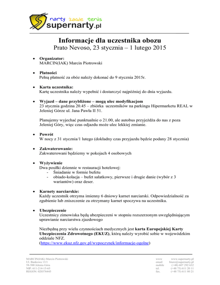 Informacje dla uczestnika obozu Prato Nevoso, 23 stycznia – 1 lutego 2015 Organizator: MARCIN(IAK) Marcin Piotrowski Płatności Pełną płatność za obóz należy dokonać do 9 stycznia 2015r. Karta uczestnika: Kartę uczestnika należy wypełnić i dostarczyć najpóźniej do dnia wyjazdu. Wyjazd – dane przybliżone – mogą ulec modyfikacjom 23 stycznia godzina 20.45 – zbiórka uczestników na parkingu Hipermarketu REAL w Jeleniej Górze ul. Jana Pawła II 51. Planujemy wyjechać punktualnie o 21.00, ale autobus przyjeżdża do nas z poza Jeleniej Góry, więc czas odjazdu może ulec lekkiej zmianie. Powrót W nocy z 31 stycznia/1 lutego (dokładny czas przyjazdu będzie podany 28 stycznia) Zakwaterowanie: Zakwaterowani będziemy w pokojach 4 osobowych Wyżywienie Dwa posiłki dziennie w restauracji hotelowej: Śniadanie w formie bufetu obiado-kolacja – bufet sałatkowy, pierwsze i drugie danie (wybór z 3 wariantów) oraz deser. Karnety narciarskie: Każdy uczestnik otrzyma imienny 6 dniowy karnet narciarski. Odpowiedzialność za zgubienie lub zniszczenie za otrzymany karnet spoczywa na uczestniku. Ubezpieczenie Uczestnicy zimowiska będą ubezpieczeni w stopniu rozszerzonym uwzględniającym uprawianie narciarstwa zjazdowego Niezbędną przy wielu czynnościach medycznych jest karta Europejskiej Karty Ubezpieczenia Zdrowotnego (EKUZ), którą należy wyrobić sobie w wojewódzkim oddziale NFZ. (https://www.ekuz.nfz.gov.pl/wypoczynek/informacje-ogolne) MARCIN(IAK) Marcin Piotrowski Ul. Bankowa 13/1 58-500 Jelenia Góra NIP: 611-214-15-65 REGON: 020376445 www email mobile tel. fax. www.supernarty.pl [email protected] (+48) 607 292 632 (+48 75) 611 20 11 (+48 75) 611 80 21 www.supernarty.pl W związku z wyjazdem uczestnika należy wyposażyć w: PASZPORT/DOWÓD OSOBISTY! Sprawny sprzęt narciarski (narty, buty, kijki, gogle/okulary) Obowiązkowy kask Slalomowe ochraniacze narciarskie (dotyczy zaawansowanych narciarzy) Odpowiedni ubiór narciarski ( kurtka ,spodnie, ciepła bielizna, rękawice, kominiarka, odpowiednia ilość skarpet itp.) Odpowiedni ubiór po nartach (dostosowany także do ewentualnych pieszych spacerów) Przybory toaletowe (szczotka do zębów, mydło, szampon, itp.) ręcznik jest na stanie pokoju Zmienne obuwie, dresy na pobyt w budynku Chusteczki jednorazowe do nosa Zapas jedzenia i picia na długą podróż (spędzimy w autobusie około 16 godzin) Dodatkowo można zabrać: Smary do nart Gry i przybory „świetlicowe” (gry planszowe, karty, papier do rysowania, kredki, flamastry) Strój kąpielowy i czepek – do dyspozycji gości mini centrum wellness: niewielki basenik (8mx3m), łaźnia turecka 10 osobowa, jacuzzi 5 osobowe. Trochę euro na zakupy (50m od hotelu znajduje się sklep spożywczy, w którym można doposażyć się jedzenie, jeśli będzie brakowało) 2 MARCIN(IAK) Marcin Piotrowski Ul. Bankowa 13/1 58-500 Jelenia Góra NIP: 611-214-15-65 REGON: 020376445 www email mobile tel. fax. www.supernarty.pl [email protected] (+48) 607 292 632 (+48 75) 611 20 11 (+48 75) 611 80 21