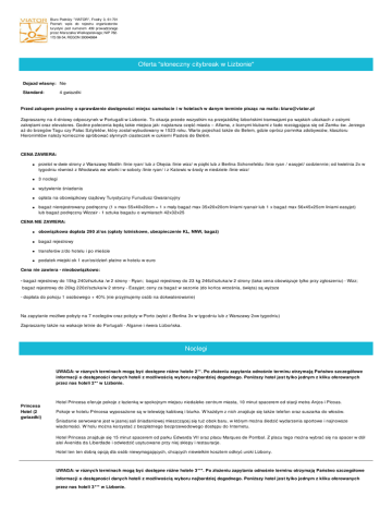 Biuro Podróży "VIATOR", Fredry 3, 61-701 Poznań; wpis do rejestru organizatorów turystyki pod numerem 439 prowadzonego przez Marszałka Wielkopolskiego; NIP 782172-58-54, REGON 300046984 Oferta "słoneczny citybreak w Lizbonie" Dojazd własny: Nie Standard: 4 gwiazdki Przed zakupem prosimy o sprawdzenie dostępności miejsc samolocie i w hotelach w danym terminie pisząc na maila: [email protected] Zapraszamy na 4-dniowy odpoczynek w Portugalii w Lizbonie. To okazja przede wszystkim na przejażdżkę lizbońskimi tramwajami po wąskich uliczkach z ostrymi zakrętami oraz elevatores. Godne polecenia będą takie miejsca jak: najstarsza część miasta – Alfama, z licznymi klubami z fado rozciągająca się od Zamku św. Jerzego aż do brzegów Tagu czy Pałac Sztyletów, który został wybudowany w 1523 roku. Warto pojechać także do Belem, gdzie oprócz pomnika zdobywców, klasztoru Hieronimitów należy koniecznie spróbować słynnych ciasteczek w cukierni Pasteis de Belém. CENA ZAWIERA: przelot w dwie strony z Warszawy Modlin /linie ryan/ lub z Okęcia /linie wizz/ w piątki lub z Berlina Schonefeldu /linie ryan / easyjet/ codziennie; od kwietnia 2x w tygodniu również z Wrocławia we wtorki i w soboty /linie ryan/ i z Katowic w środy w niedziele /linie wizz/ 3 noclegi wyżywienie śniadania opłata na obowiązkowy rządowy Turystyczny Funudusz Gwarancyjny bagaż nierejestrowany podręczny (1 x max 55x40x20cm + 1 x mały bagaż max 35x20x20cm liniami ryanair lub 1 x bagaż max 56x45x25cm liniami easyjet) lub bagaż podręczny Wizzair - 1 sztuka bagażu o wymiarach 42x32x25 CENA NIE ZAWIERA: obowiązkowa dopłata 290 zł/os (opłaty lotniskowe, ubezpieczenie KL, NNW, bagaż) bagaż rejestrowy transferów z/do hotelu i po mieście podatek miejski ok 1 eur/os/dzień płatne w hotelu w euro Cena nie zawiera - nieobowiązkowo: - bagaż rejestrowy do 15kg 240zł/sztuka /w 2 strony - Ryan; bagaż rejestrowy do 23 kg 246zl/sztuka/w 2 strony (taka cena obowiązuje tylko przy zgłoszeniu) - Wizz; bagaż rejestrowy do 20kg 220zl/sztuka/w 2 strony - Easyjet; ceny za bagaż w sezonie (do końca września, święta) są wyższe - dopłata do pokoju 1 osobowego + 40% (nie przyjmujemy osób na dokwaterowanie) Na zapytanie możliwe pobyty na 7 noclegów oraz pobyty w Porto (wylot z Berlina 3x w tygodniu lub z Warszawy 2xw tygodniu) Zapraszamy także na wakacje letnie do Portugalii - Algarve i riwera Lizbońska. Noclegi UWAGA: w róznych terminach mogą być dostępne różne hotele 2**. Po złożeniu zapytania odnośnie terminu otrzymają Państwo szczegółowe informacji o dostępności danych hoteli z możliwością wyboru najbardziej dogodnego. Poniższy hotel jest tylko jednym z kliku oferowanych przez nas hoteli 2** w Lizbonie. Princesa Hotel (2 gwiazdki) Hotel Princesa oferuje pokoje z łazienką w spokojnym miejscu niedaleko centrum miasta, 10 minut spacerem od stacji metra Anjos i Picoas. Pokoje w hotelu Princesa wyposażone są w telewizję kablową i biurko. W każdym z nich znajduje się także telefon oraz suszarka do włosów. Śniadanie serwowane jest w jasnej sali śniadaniowej mieszczącej się tuż obok baru, w którym można śledzić wydarzenia sportowe i najnowsze wiadomości. W holu można korzystać z bezpłatnego bezprzewodowego dostępu do Internetu. Hotel Princesa znajduje się 15 minut spacerem od parku Edwarda VII oraz placu Marques de Pombal. Z placu tego można wybrać się na spacer w dół alei Avenida da Liberdade i odwiedzić usytuowane przy niej sklepy i restauracje. Hotel ten ten dobrą opcją dla osób niewymagających, chcących niewielkim kosztem odkryć uroki Lizbony. UWAGA: w róznych terminach mogą być dostępne różne hotele 3***. Po złożeniu zapytania odnośnie terminu otrzymają Państwo szczegółowe informacji o dostępności danych hoteli z możliwością wyboru najbardziej dogodnego. Poniższy hotel jest tylko jednym z kliku oferowanych przez nas hoteli 3*** w Lizbonie. Edward VII (3 gwiazdki) Hotel Eduardo VII położony jest obok parku Edwarda VII i oferuje pokoje z łązienkami oraz mieszczącą się na 10. piętrze restaurację z werandą, z której roztaczają się panoramiczne widoki na okolicę. Do dyspozycji Gości jest tutaj również bar, zaplecze biznesowe oraz parking. Każdy pokój w hotelu Eduardo VII jest klimatyzowany i dysponuje minibarem oraz łazienką. Hotel oferuje czynną przez całą dobę recepcję. W przytulnej panoramicznej restauracji, która mieści się na 10. piętrze, serwowane jest śniadanie w formie bufetu oraz kolacja z wyborem dań z karty. Hotel Eduardo VII położony jest w centrum miasta, zaledwie 2 minuty spacerem od stacji metra i przystanku autobusowego, z którego kursują autobusy na lotnisko. Obiekt znajduje się 5 minut spacerem od centrum handlowego El Corte Inglés oraz 10 minut spacerem od alei Avenida da Liberdade, jednej z głównych ulic w mieście. UWAGA: w róznych terminach mogą być dostępne różne hotele 4***. Po złożeniu zapytania odnośnie terminu otrzymają Państwo szczegółowe informacji o dostępności danych hoteli z możliwością wyboru najbardziej dogodnego. Poniższy hotel jest tylko jednym z kliku oferowanych przez nas hoteli 4*** w Lizbonie. Hotel Lisboa jest położony w centrum miasta, przy alei Avenida Liberdade, w odległości zaledwie 300 metrów od stacji metra Avenida, która jest oddalona o 2 stacje od centralnego placu Rossio. Hotel jest objęty całkowitym zakazem palenia. Oferta obiektu obejmuje doskonałe lokale gastronomiczne oraz bezpłatny bezprzewodowy dostęp do Internetu. Lisboa (4 gwiazdki) Hotel Lisboa udostępnia Gościom nowocześnie urządzone pokoje z drewnianą podłogą i meblami we współczesnym stylu. Dźwiękoszczelne pokoje obejmują łazienkę z wanną, a także salon wyposażony w sofę oraz telewizor z płaskim ekranem i dostępem do kanałów telewizji kablowej. Hotelowa restauracja Chutneys Bistro zaprasza na wykwintne specjały 