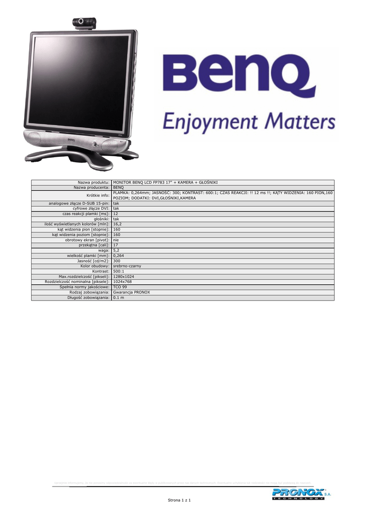 Nazwa produktu: MONITOR BENQ LCD FP783 17" + KAMERA + GŁOŚNIKI Nazwa producenta: BENQ PLAMKA: 0,264mm; JASNOŚĆ: 300; KONTRAST: 600:1; CZAS REAKCJI: !! 12 ms !!; KĄTY WIDZENIA: 160 PION,160 Krótkie info: POZIOM; DODATKI: DVI,GŁOŚNIKI,KAMERA analogowe złącze D-SUB 15-pin: tak cyfrowe złącze DVI: tak czas reakcji plamki [ms]: 12 głośniki: tak ilość wyświetlanych kolorów [mln]: 16,2 kąt widzenia pion [stopnie]: 160 kąt widzenia poziom [stopnie]: 160 obrotowy ekran [pivot]: nie przekątna [cali]: 17 waga: 5,2 wielkość plamki [mm]: 0,264 Jasność [cd/m2]: 300 Kolor obudowy: srebrno-czarny Kontrast: 500:1 Max.rozdzielczość [pikseli]: 1280x1024 Rozdzielczość nominalna [piksele]: 1024x768 Spełnia normy jakościowe: TCO 99 Rodzaj zobowiązania: Gwarancja PRONOX Długość zobowiązania: 0.1 m Uprzejmie informujemy, źe nie ponosimy odpowiedzialności za ewentualne błędy w publikowanych przez nas danych technicznych. Ewentualne uchybienia lub nieścisłości nie mogą być podstawą do roszczeń. Strona 1 z 1