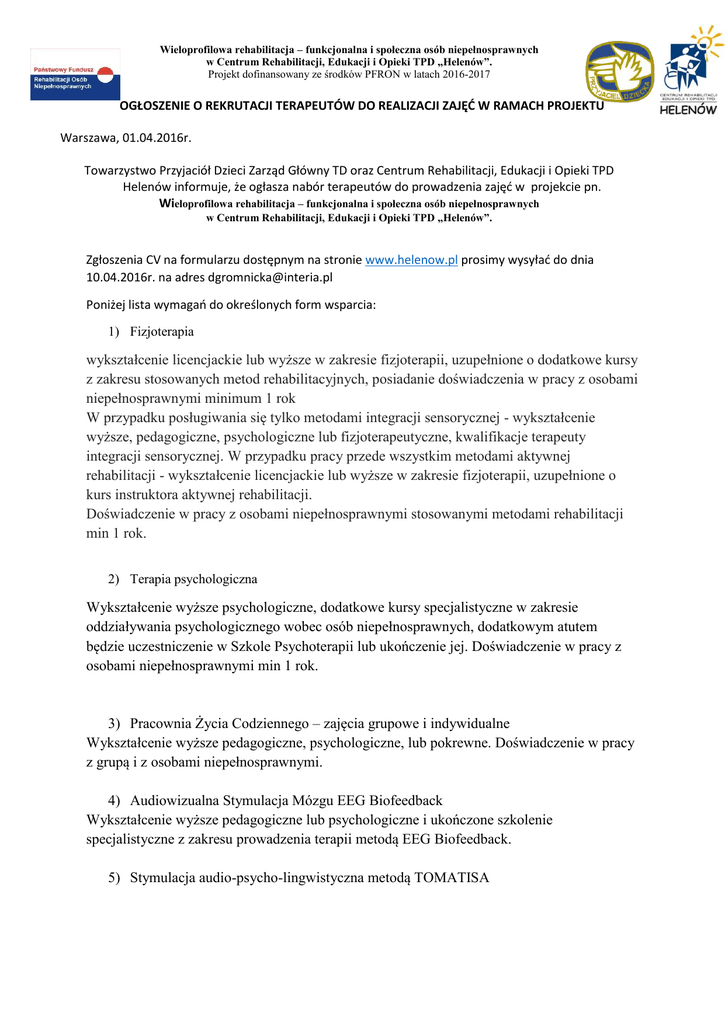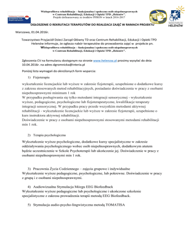 Wieloprofilowa rehabilitacja – funkcjonalna i społeczna osób niepełnosprawnych w Centrum Rehabilitacji, Edukacji i Opieki TPD „Helenów”. Projekt dofinansowany ze środków PFRON w latach 2016-2017 OGŁOSZENIE O REKRUTACJI TERAPEUTÓW DO REALIZACJI ZAJĘĆ W RAMACH PROJEKTU Warszawa, 01.04.2016r. Towarzystwo Przyjaciół Dzieci Zarząd Główny TD oraz Centrum Rehabilitacji, Edukacji i Opieki TPD Helenów informuje, że ogłasza nabór terapeutów do prowadzenia zajęć w projekcie pn. Wieloprofilowa rehabilitacja – funkcjonalna i społeczna osób niepełnosprawnych w Centrum Rehabilitacji, Edukacji i Opieki TPD „Helenów”. Zgłoszenia CV na formularzu dostępnym na stronie www.helenow.pl prosimy wysyłać do dnia 10.04.2016r. na adres [email protected] Poniżej lista wymagań do określonych form wsparcia: 1) Fizjoterapia wykształcenie licencjackie lub wyższe w zakresie fizjoterapii, uzupełnione o dodatkowe kursy z zakresu stosowanych metod rehabilitacyjnych, posiadanie doświadczenia w pracy z osobami niepełnosprawnymi minimum 1 rok W przypadku posługiwania się tylko metodami integracji sensorycznej - wykształcenie wyższe, pedagogiczne, psychologiczne lub fizjoterapeutyczne, kwalifikacje terapeuty integracji sensorycznej. W przypadku pracy przede wszystkim metodami aktywnej rehabilitacji - wykształcenie licencjackie lub wyższe w zakresie fizjoterapii, uzupełnione o kurs instruktora aktywnej rehabilitacji. Doświadczenie w pracy z osobami niepełnosprawnymi stosowanymi metodami rehabilitacji min 1 rok. 2) Terapia psychologiczna Wykształcenie wyższe psychologiczne, dodatkowe kursy specjalistyczne w zakresie oddziaływania psychologicznego wobec osób niepełnosprawnych, dodatkowym atutem będzie uczestniczenie w Szkole Psychoterapii lub ukończenie jej. Doświadczenie w pracy z osobami niepełnosprawnymi min 1 rok. 3) Pracownia Życia Codziennego – zajęcia grupowe i indywidualne Wykształcenie wyższe pedagogiczne, psychologiczne, lub pokrewne. Doświadczenie w pracy z grupą i z osobami niepełnosprawnymi. 4) Audiowizualna Stymulacja Mózgu EEG Biofeedback Wykształcenie wyższe pedagogiczne lub psychologiczne i ukończone szkolenie specjalistyczne z zakresu prowadzenia terapii metodą EEG Biofeedback. 5) Stymulacja audio-psycho-lingwistyczna metodą TOMATISA Wieloprofilowa rehabilitacja – funkcjonalna i społeczna osób niepełnosprawnych w Centrum Rehabilitacji, Edukacji i Opieki TPD „Helenów”. Projekt dofinansowany ze środków PFRON w latach 2016-2017 OGŁOSZENIE O REKRUTACJI TERAPEUTÓW DO REALIZACJI ZAJĘĆ W RAMACH PROJEKTU Wykształcenie wyższe, pedagogiczne lub pokrewne, ukończone szkolenie z zakresu stosowania metody TOMATISA. Doświadczenie w pracy tą metodą z osobami niepełnosprawnymi min. 1 rok. 6) Zajęcia z Alternatywnych i wspomagających metod komunikacji (AAC) Wykształcenie wyższe pedagogiczne lub pokrewne, ukończone szkolenie z zakresu stosowania metod AAC. Doświadczenie w pracy tą metodą z osobami niepełnosprawnymi min. 1 rok. 7) Terapia logopedyczna Wykształcenie wyższe pedagogiczne lub pokrewne, studia podyplomowe z zakresu logopedii, kusy kwalifikacyjne i szkolenia logopedyczne. Doświadczenie w pracy z osobami niepełnosprawnymi min. 1 rok. 8) Hydroterapia (zajęcia na basenie) Wykształcenie wyższe fizjoterapeutyczne lub pokrewne związane z wychowaniem fizycznym (AWF), ukończony kurs instruktora pływania lub też instruktora rehabilitacji w wodzie. Konieczne doświadczenie pracy tą formą wsparcia z osobami niepełnosprawnymi min 3 lata. 9) Zajęcia ogólnousprawniające Wykształcenie wyższe fizjoterapeutyczne lub pokrewne związane z wychowaniem fizycznym (AWF), doświadczenie w prowadzeniu zajęć w tym zajęć np. sportowych dla osób niepełnosprawnych min. 1 rok. 10) zajęcia z elementami muzykoterapii Wykształcenie wyższe, muzyczne, pedagogiczne, psychologiczne lub pokrewne. Kursy, szkolenia z zakresu terapii muzyką, doświadczenie w pracy z osobami niepełnosprawnym tą metodą wsparcia. 11) zajęcia z elementami arteterapii Wykształcenie wyższe, pedagogiczne, psychologiczne lub pokrewne w tym artystyczne, kursy z zakresu terapii przez sztukę, arteterapii. Doświadczenie w pracy z osobami niepełnosprawnymi tą metodą wsparcia min 1 rok. 12) Zajęcia z elementami teatroterapii Wykształcenie wyższe pedagogiczne, psychologiczne, artystyczne lub pokrewne, kursy z dziedziny terapii sztuką, dramy, choreoterapii lub wykształcenie teatralne. Doświadczenie w pracy z osobami niepełnosprawnymi z wykorzystaniem tej metody wsparcia min 1 rok. 13) Zajęcia z elementami biblioterapii Wieloprofilowa rehabilitacja – funkcjonalna i społeczna osób niepełnosprawnych w Centrum Rehabilitacji, Edukacji i Opieki TPD „Helenów”. Projekt dofinansowany ze środków PFRON w latach 2016-2017 OGŁOSZENIE O REKRUTACJI TERAPEUTÓW DO REALIZACJI ZAJĘĆ W RAMACH PROJEKTU Wykształcenie wyższe pedagogiczne, psychologiczne lub pokrewne. Doświadczenie w pracy z osobami niepełnosprawnymi z wykorzystaniem tej metody wsparcia min. 1 rok. Kursy lub szkolenia z dziedziny terapii sztuką, biblioterapii, dramy. 14) Hipoterapia Wykształcenie wyższe pedagogiczne, psychologiczne, fizjoterapeutyczne. Ukończony kurs hipoterapii. Doświadczenie w pracy tą metodą wsparcia z osobami niepełnosprawnymi min 1 rok. 15) Terapia przez zabawę Wykształcenie wyższe pedagogiczne, psychologiczne lub pokrewne. Doświadczenie w pracy z grupą i z osobami niepełnosprawnymi tą metodą wsparcia min 1 rok. 16) Zajęcia z elementami socjoterapii Wykształcenie wyższe pedagogiczne, psychologiczne, socjoterapeutyczne lub pokrewne. Doświadczenie w pracy z grupą i z osobami niepełnosprawnymi tą metodą wsparcia lub doświadczenie w grupowej pracy psychterapeutycznej.